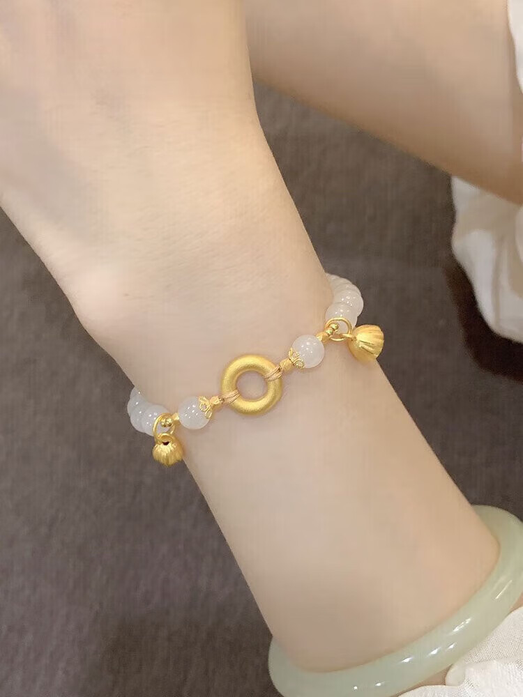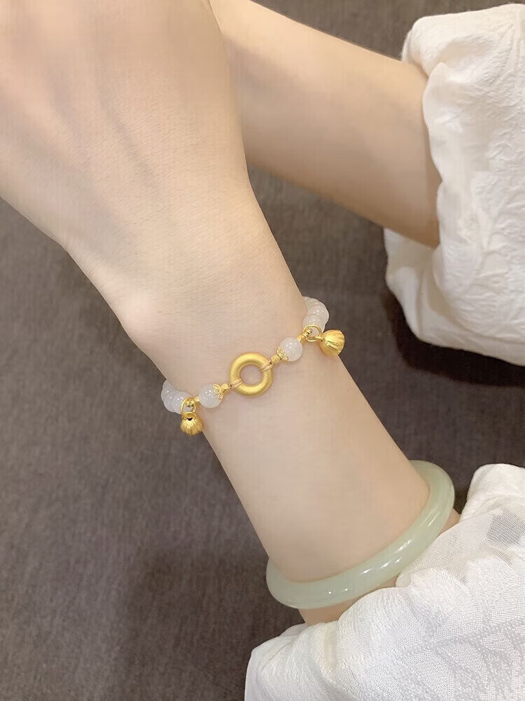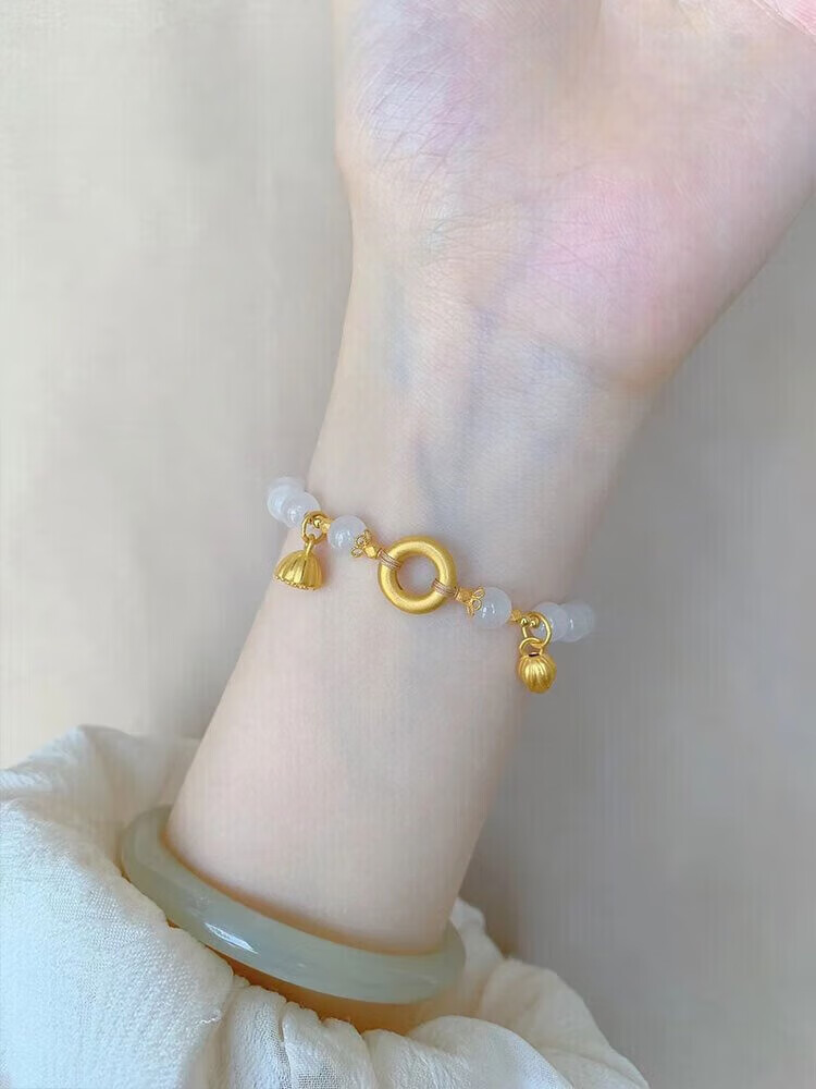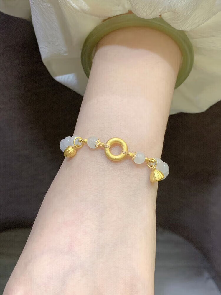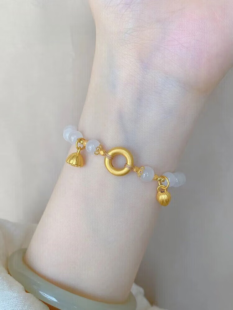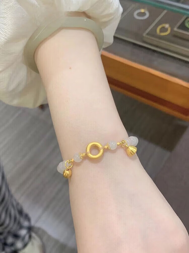 Chow Tai Fook 999 Pure Gold Two Worlds Gold Bracelet Women's Lotus Bud Lotus Bud Peace Bracelet and Tian Jade Bracelet Chinese Valentine's Day Gift Lotus Bud + Lotus Bud + Peace Buckle + 8 Gold Beads + Gift Box