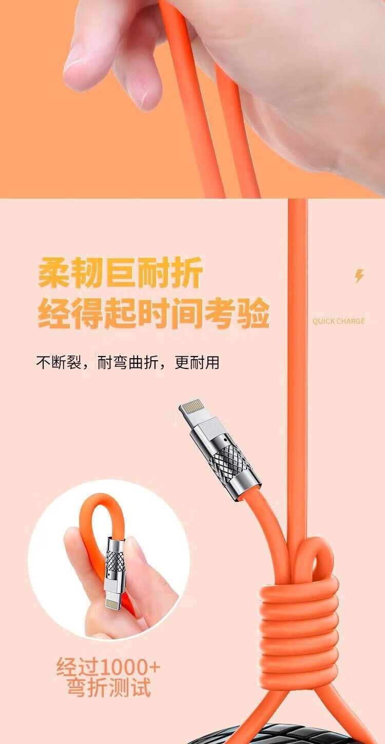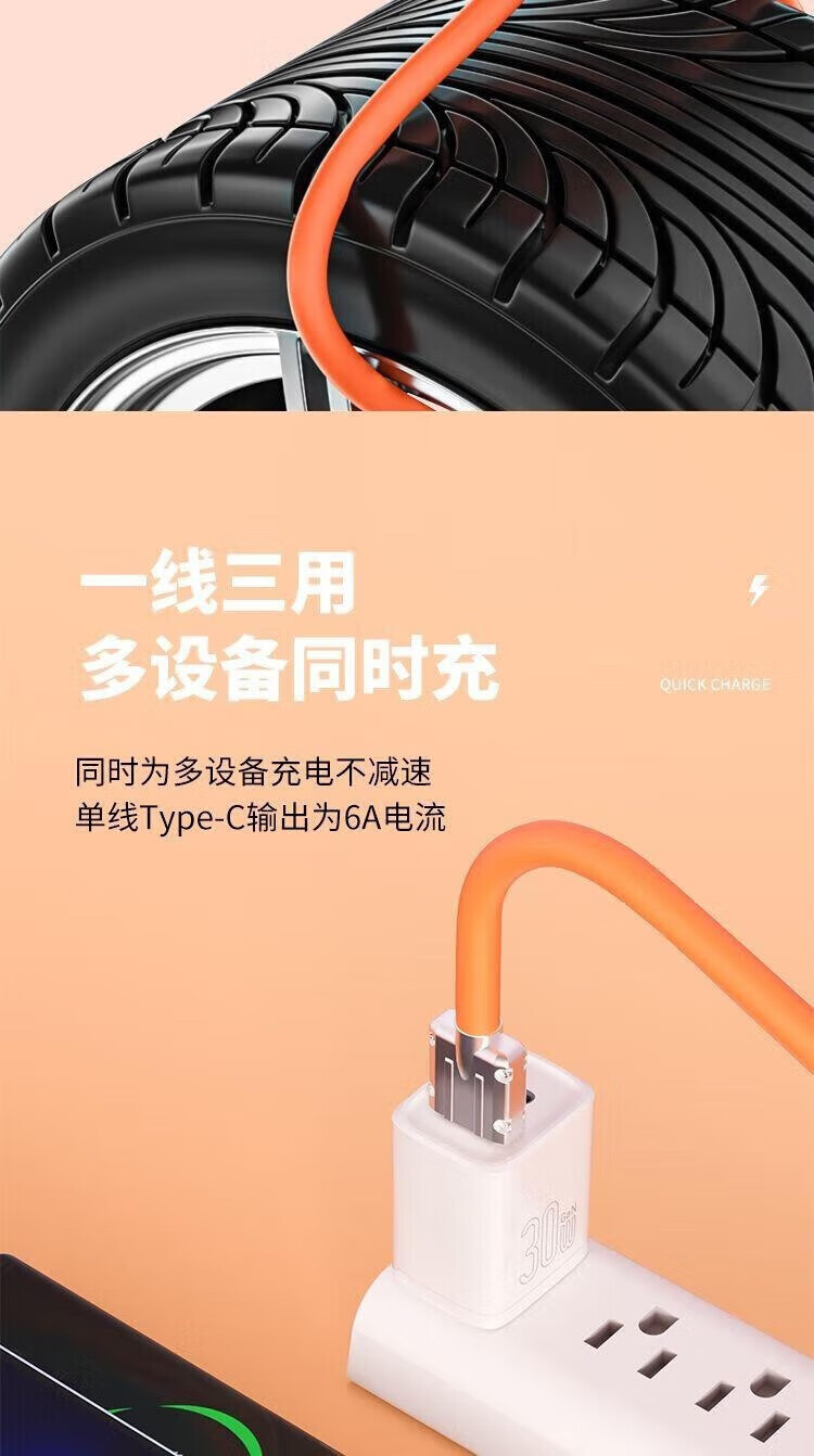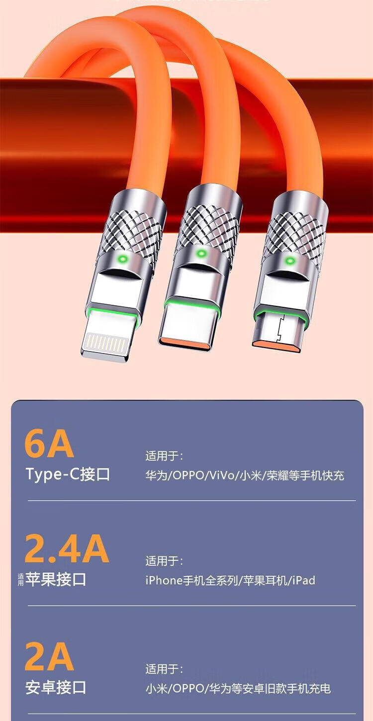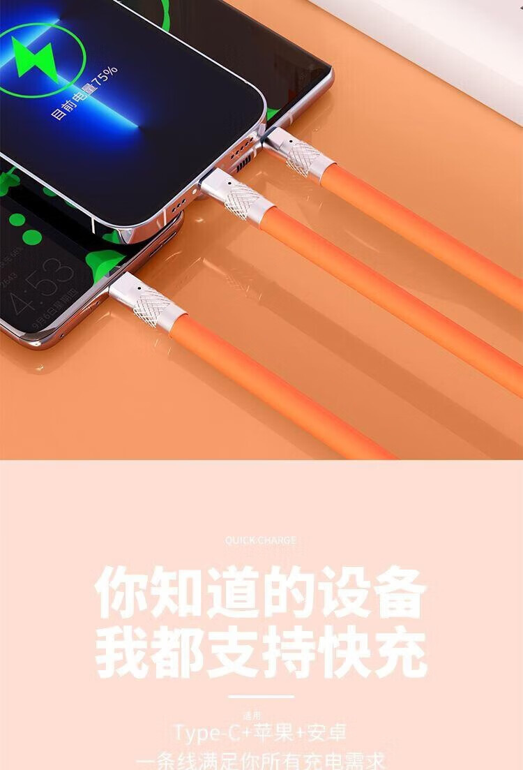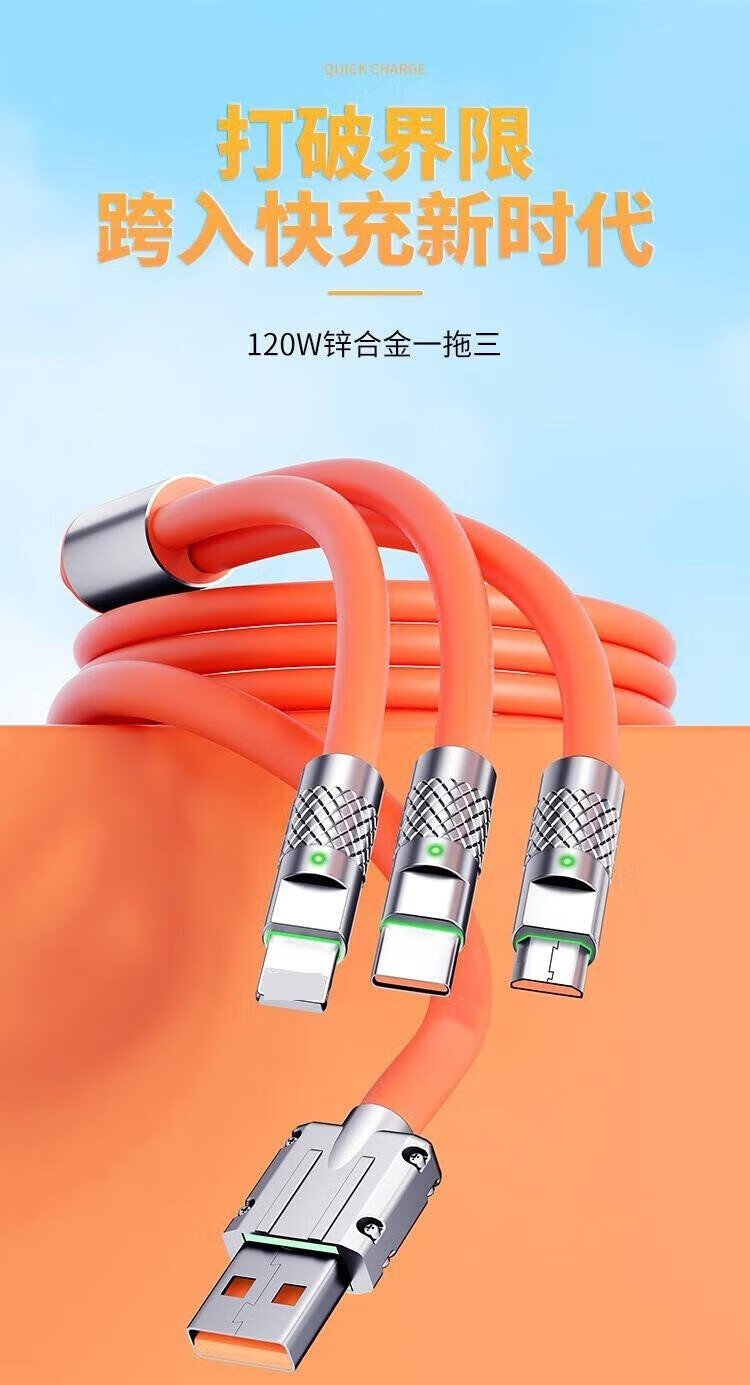 Puchi Apple data cable Type-c fast charging cable Android charging cable three-in-one mobile phone cable one to three VIVO Huawei Samsung Xiaomi universal tablet car power cable 120W class fast charging three-in-one metal head orange