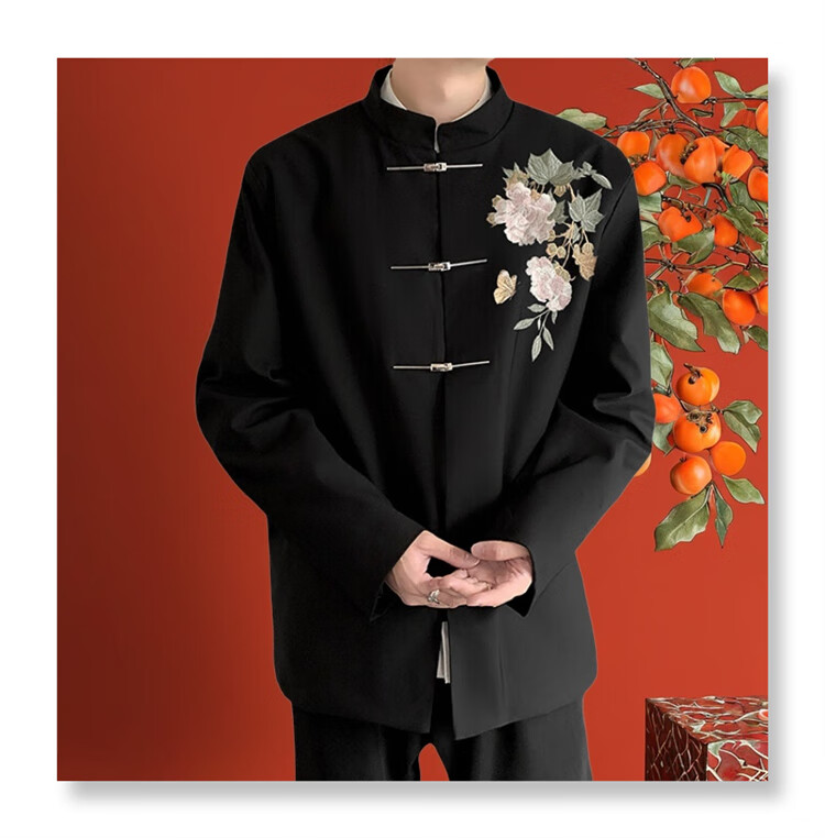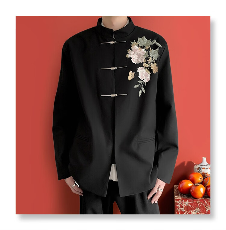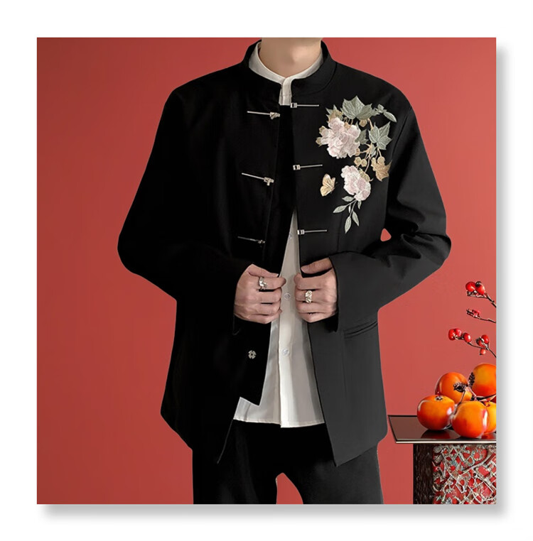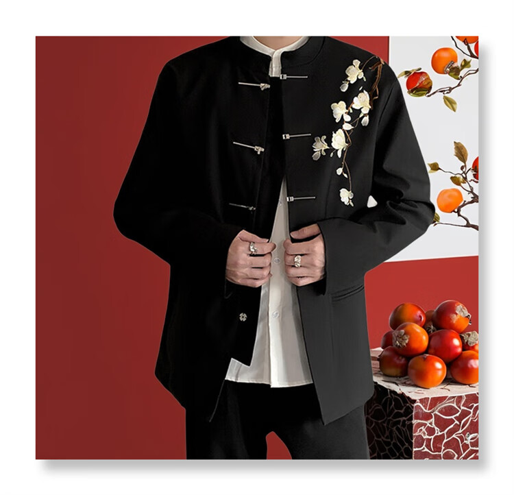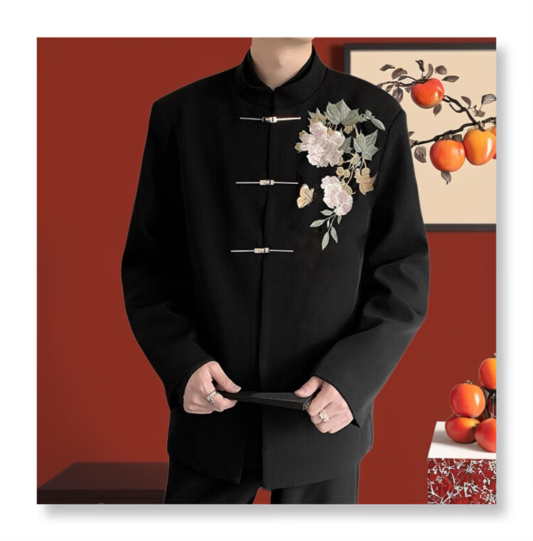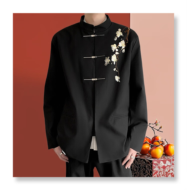 ROMON Haute Couture New Chinese Groom's Suit White Magnolia Flower Embroidered Stand Collar Tunic Suit Jacket Engagement Dress XF66 White Magnolia Black (Single Suit) 2XL