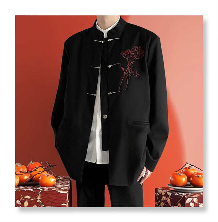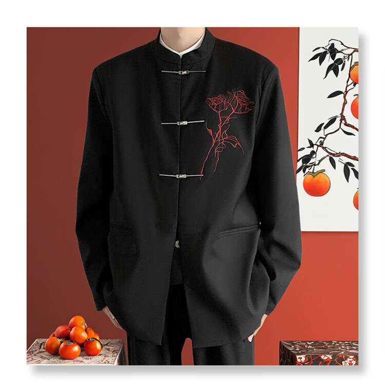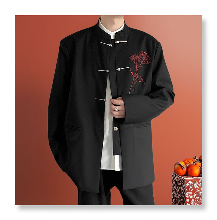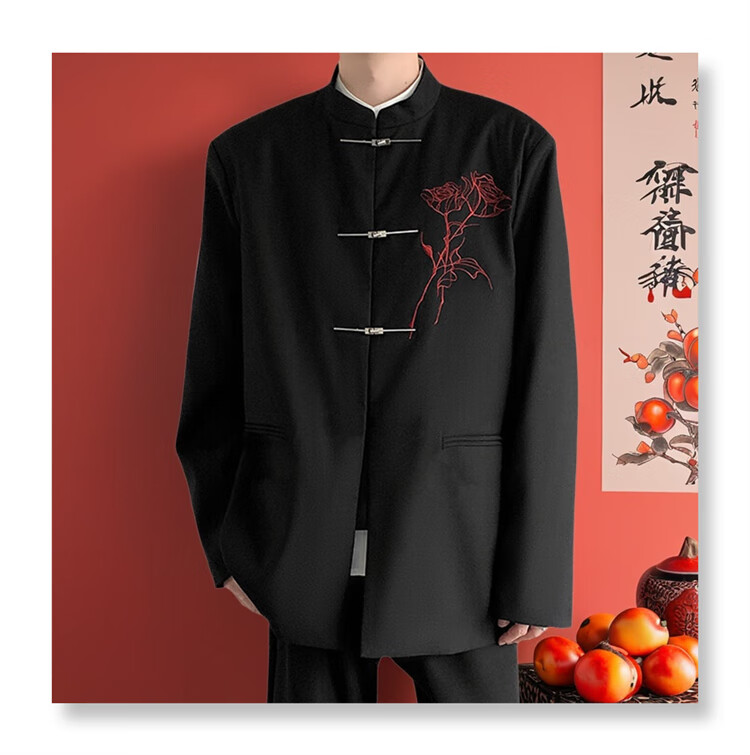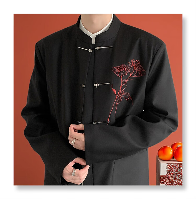 ROMON Haute Couture New Chinese Groom's Suit White Magnolia Flower Embroidered Stand Collar Tunic Suit Jacket Engagement Dress XF66 White Magnolia Black (Single Suit) 2XL
