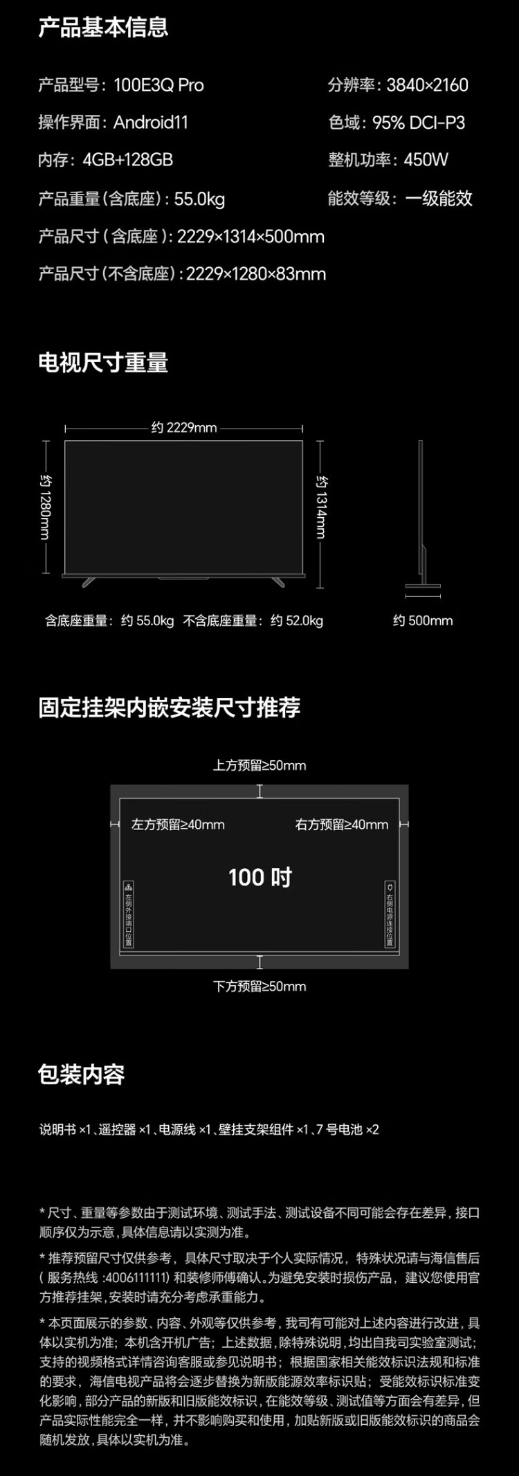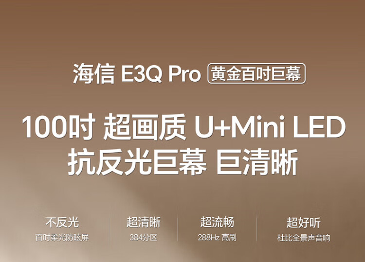 Hisense TV 100E3Q Pro 100 inches 384 partition U+MiniLED anti-light soft light anti-glare screen 288Hz high brush Dolby Atmos corporate subsidy 98/100 100 inches
