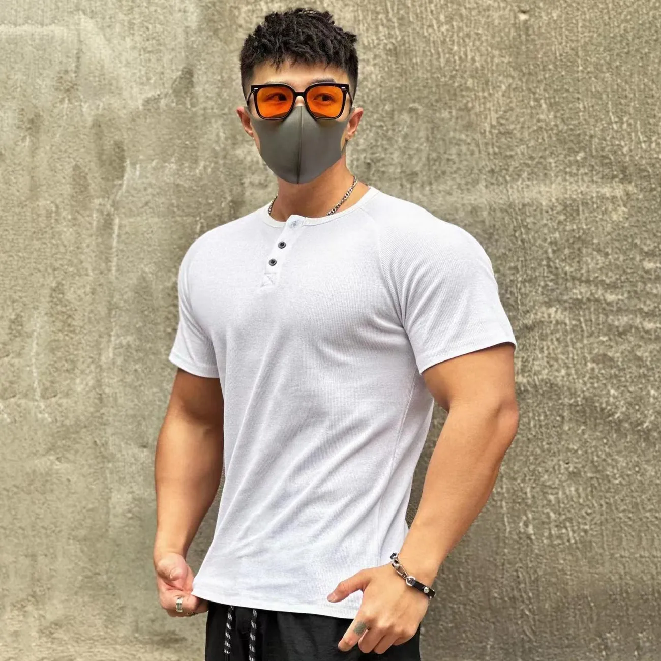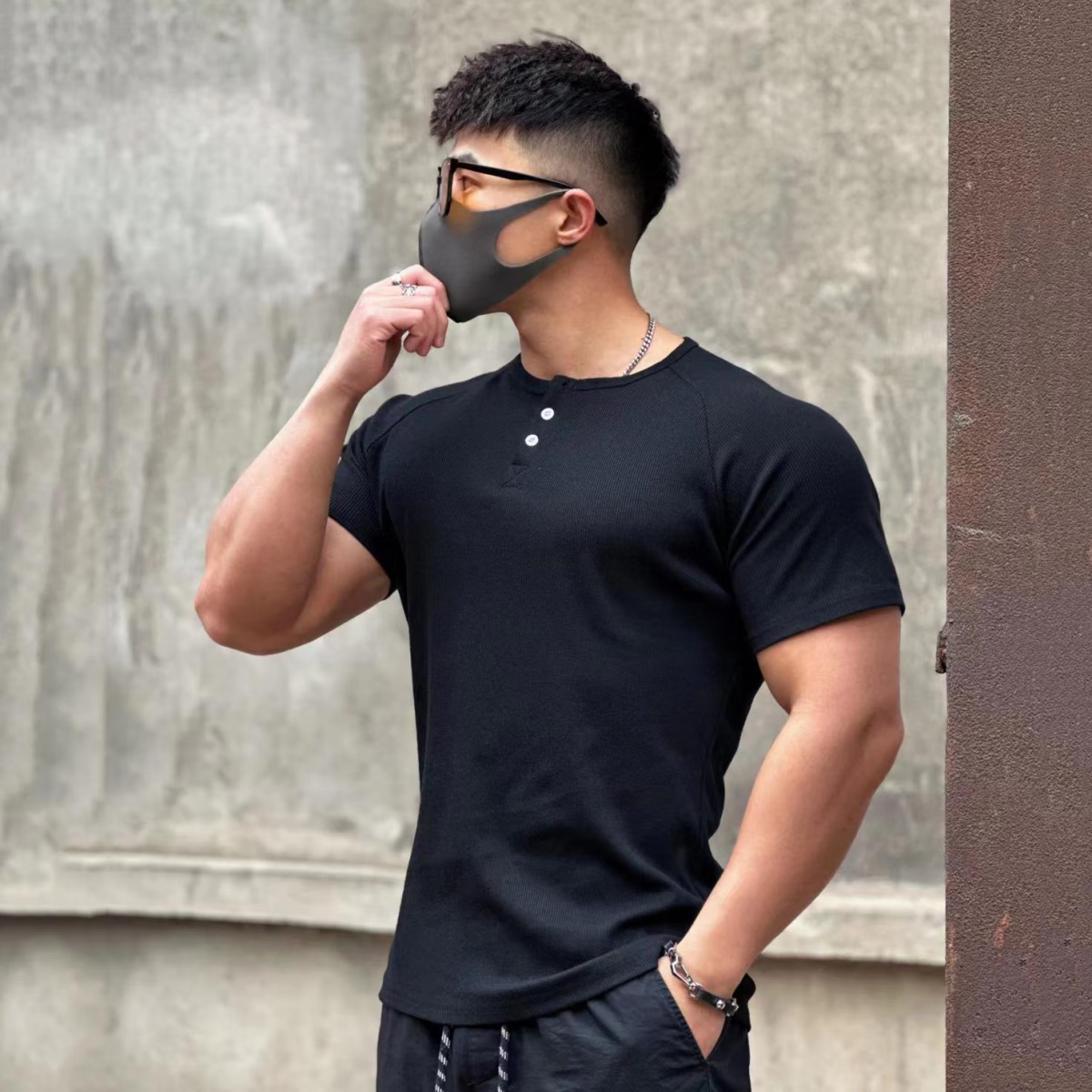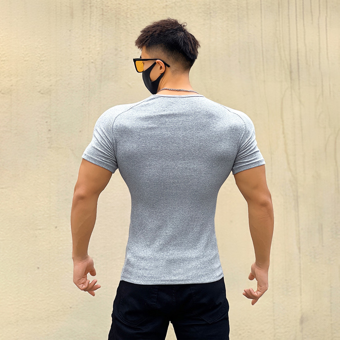 American retro heavyweight coarse threaded cotton henley shirt short-sleeved summer casual fitness tough guy bottoming t-shirt men's slim gray M recommended 100-120Jin Jin equals 0.5 kg
