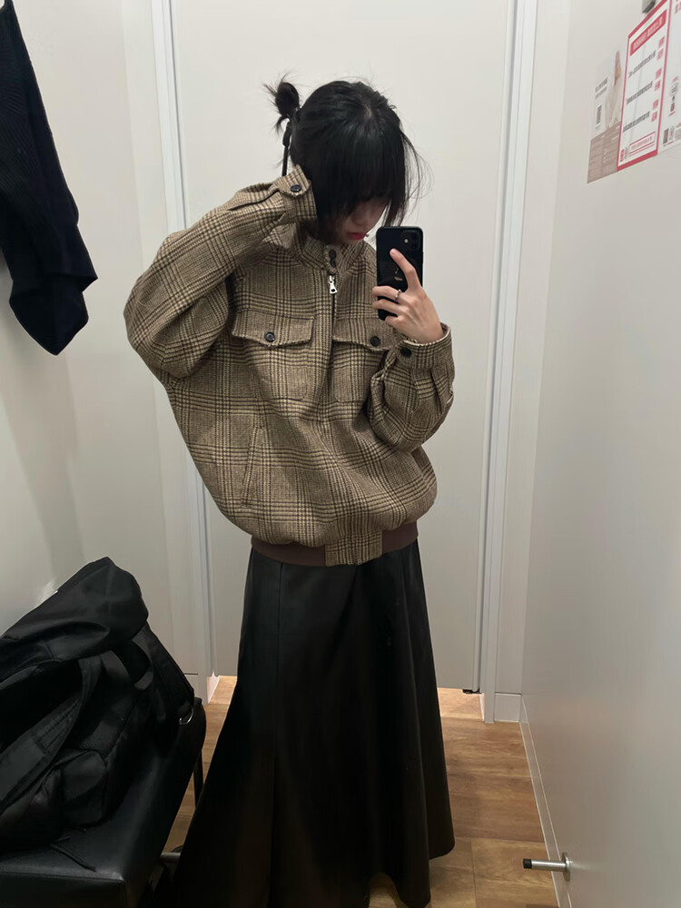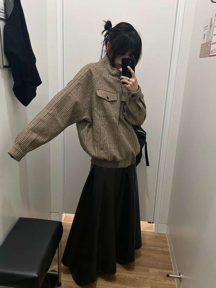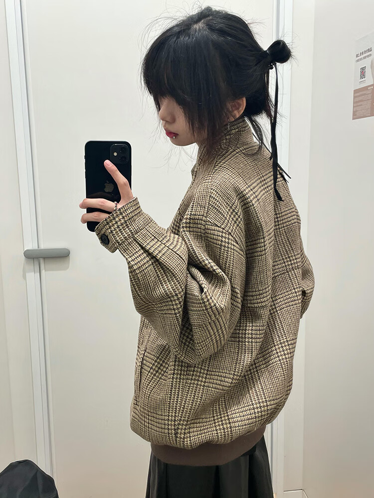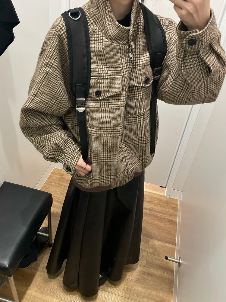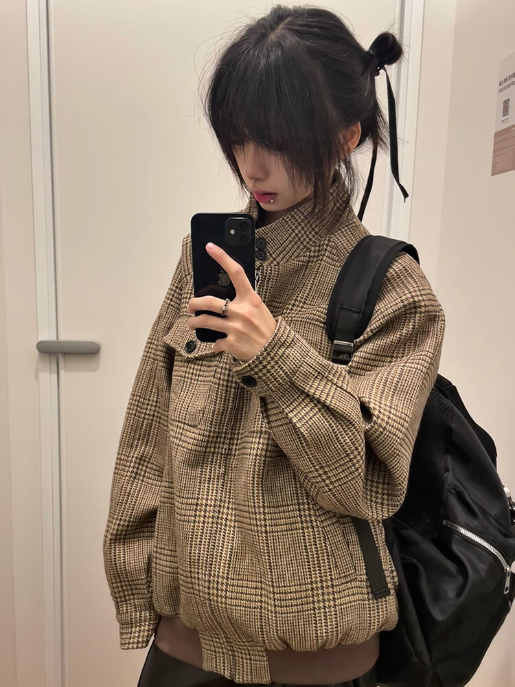 Junyin American houndstooth Harrington jacket men's spring and autumn high-end short stand-up collar cleanfit jacket dark brown L