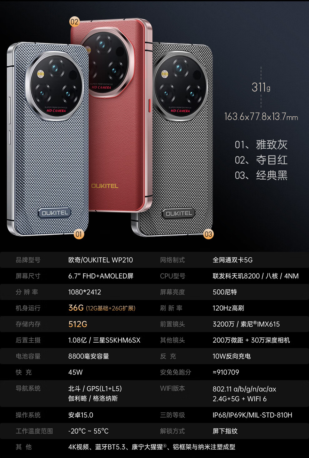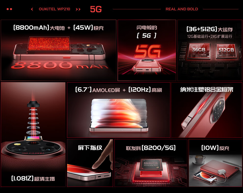OUKITEL WP210 high-end three-proof smart waterproof and drop-proof mobile phone 5G large memory long standby under-screen fingerprint red 12/36G+512G (domestic version) official standard configuration
