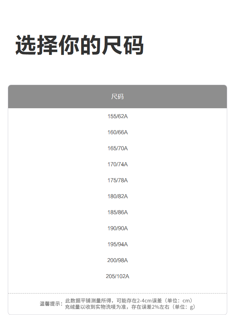 China (cm) 160-165/84-86 165-170 / 88-90 167-172 / 92-96 168-173 / 98-102 170-176 / 106-110