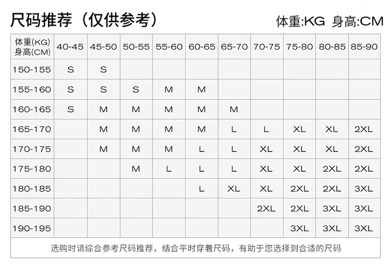 China (cm) 165 / 88-90 170 / 96-98 175 / 108-110 180 / 118-122 185 / 126-130