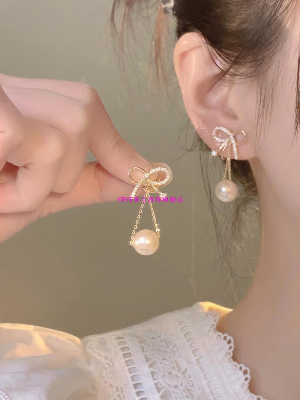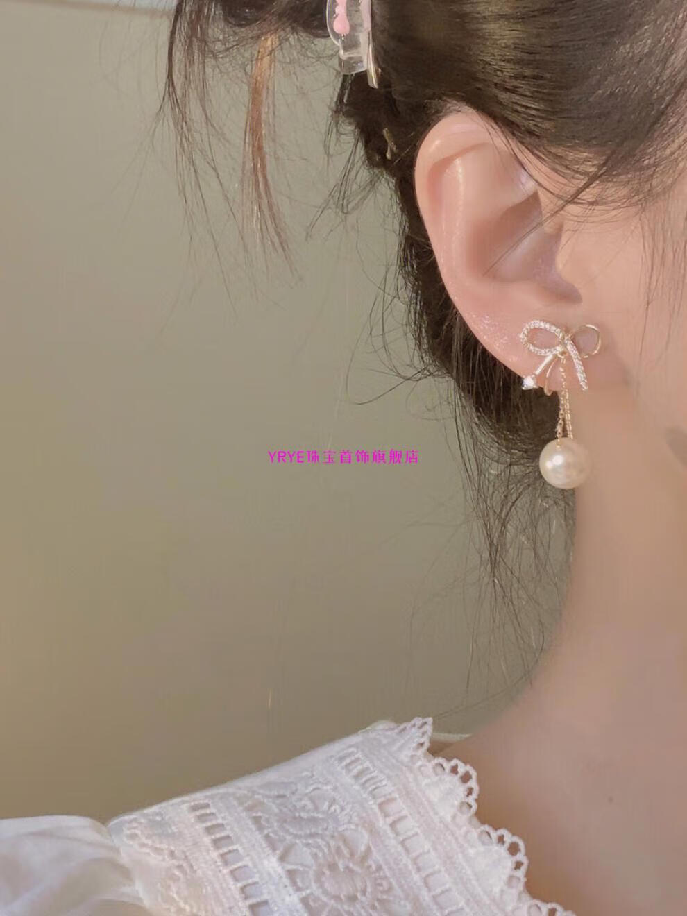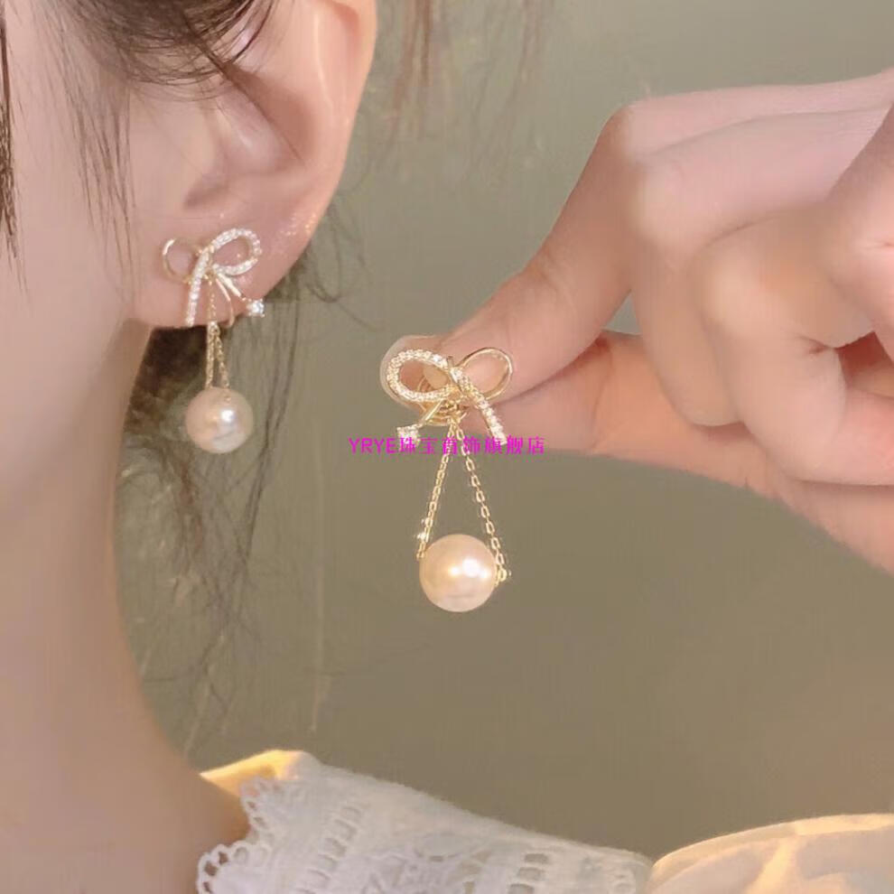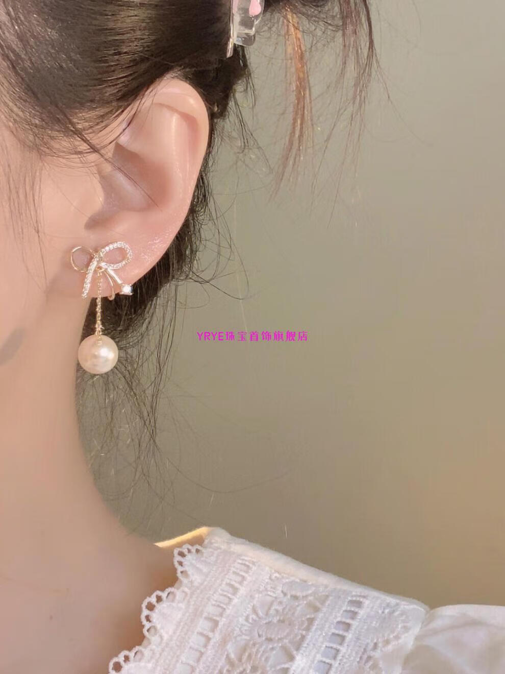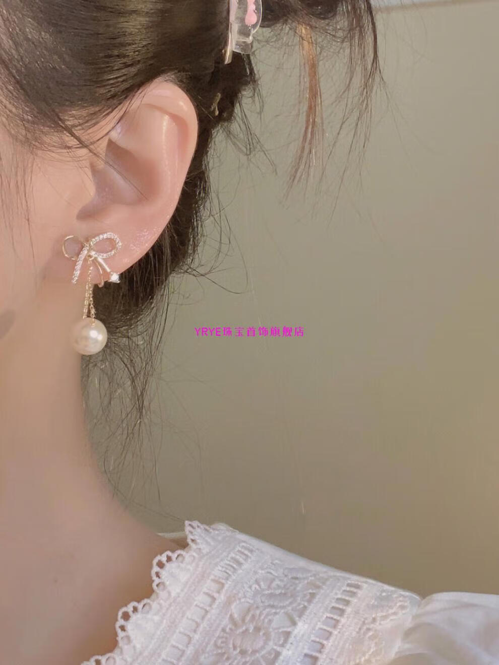 YRYE gold store model 999 sterling silver pure silver bow freshwater pearl earrings new French square round face trendy earrings bow pearl tassel earrings