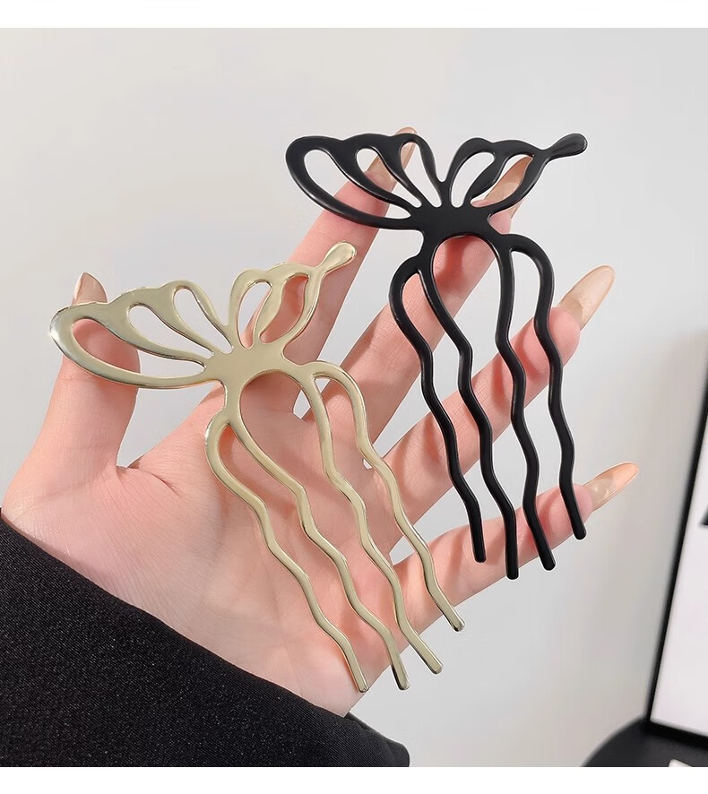 Metal hollow butterfly hairpin, new Chinese style four-tooth comb for women, high-end, cool, round hairpin, metal hollow butterfly hairpin, black
