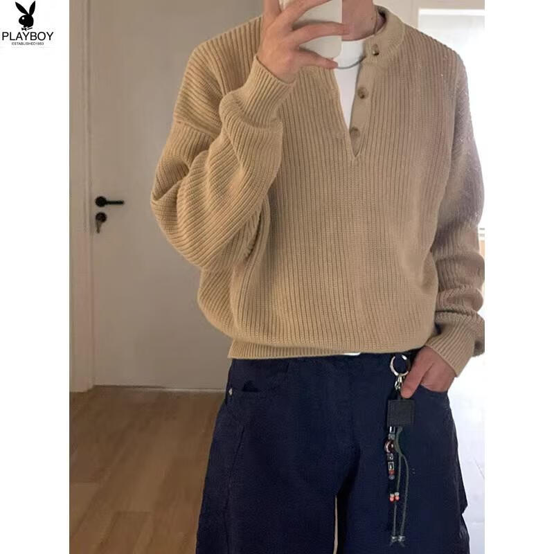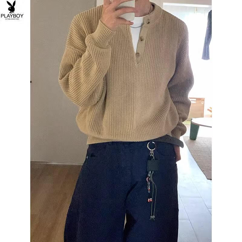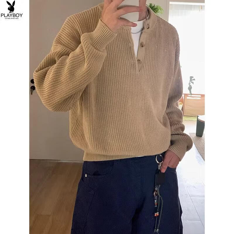 Playboy (PLAYBOY) old money style Henry collar sweater men's winter cleanfit retro POLO sweater lazy bottoming shirt black high quality XL