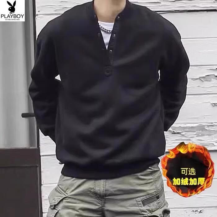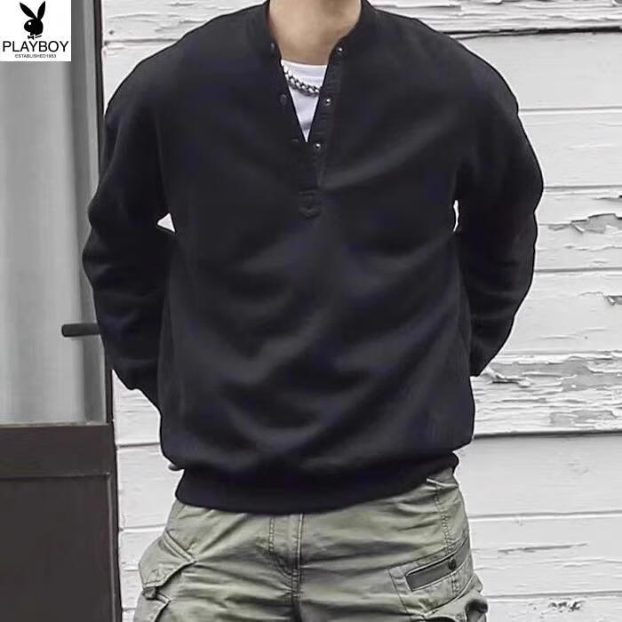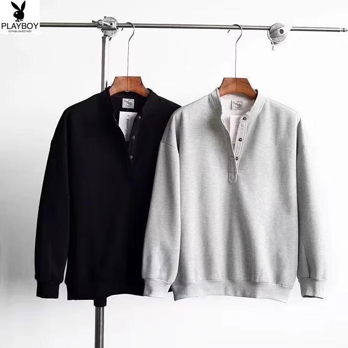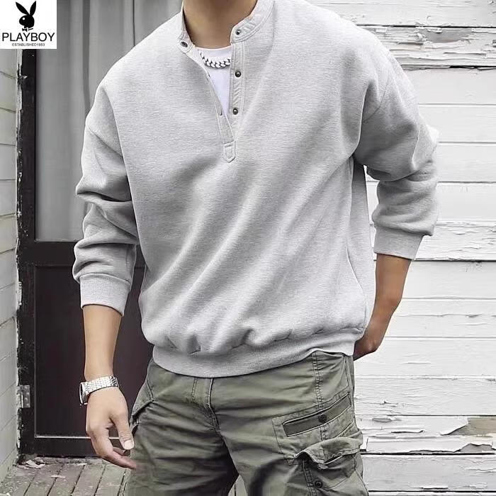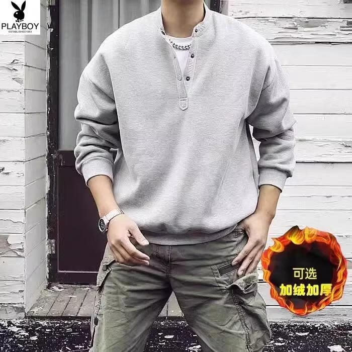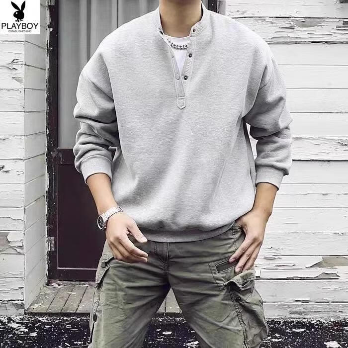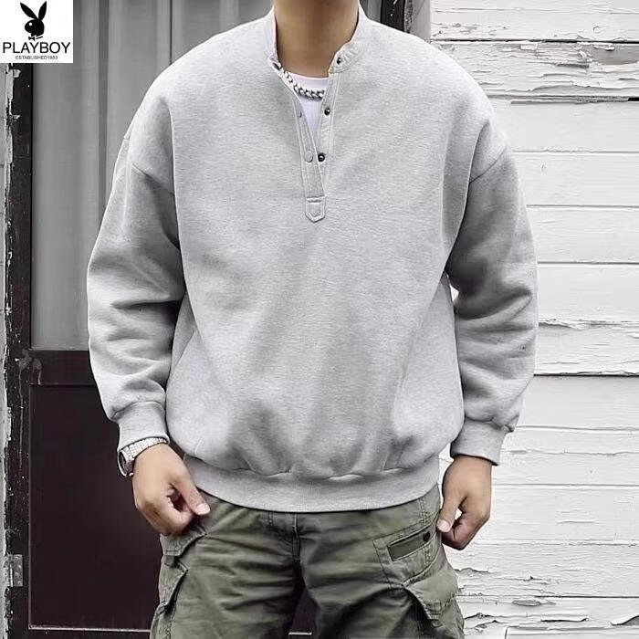 Playboy (PLAYBOY) Japanese retro autumn and winter men's Henry collar long-sleeved bottoming shirt casual loose pullover sweatshirt thickened large size men's trendy gray model high quality regular M