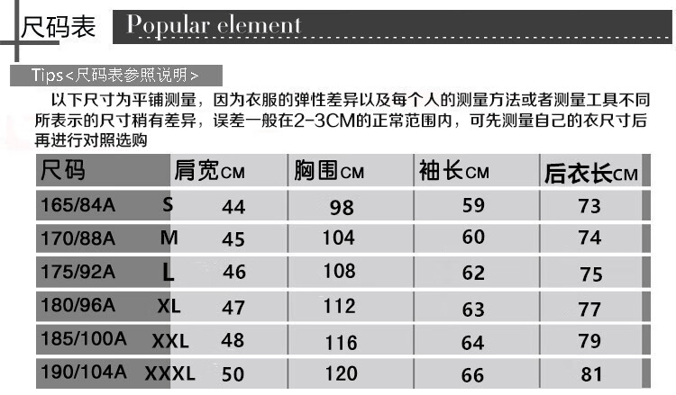 China (cm) 165 / 88-90 170 / 96-98 175 / 108-110 180 / 118-122 185 / 126-130