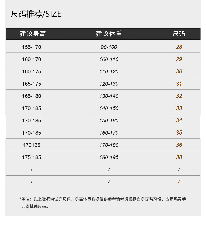 USA(inch) 28-30 30-32 32-34 34-38 38-42
