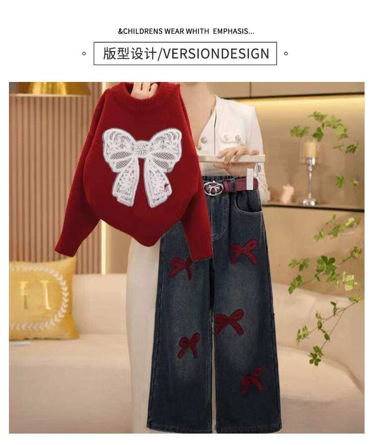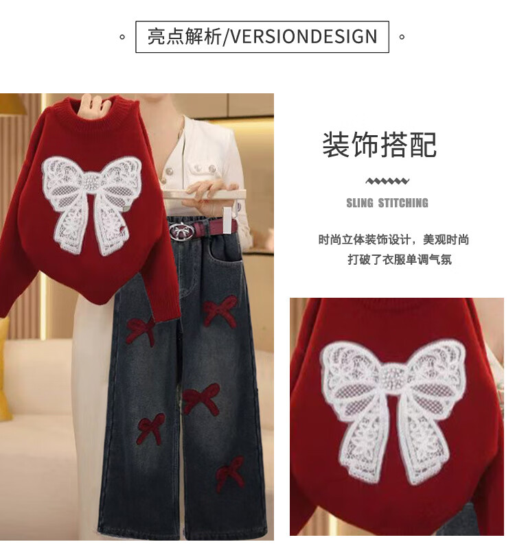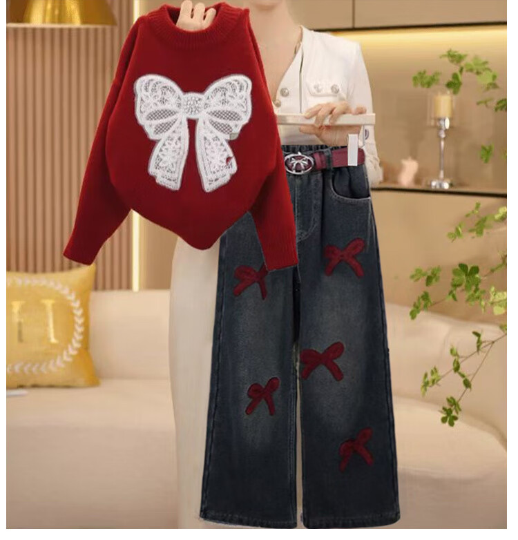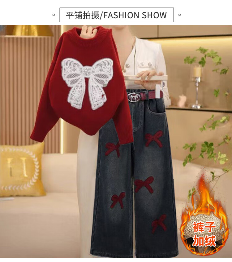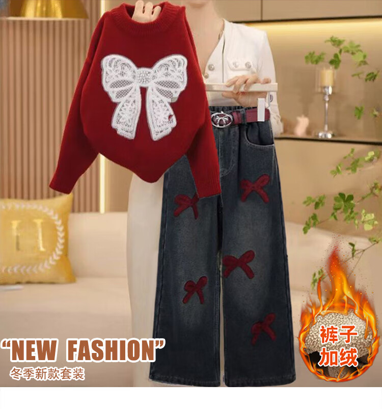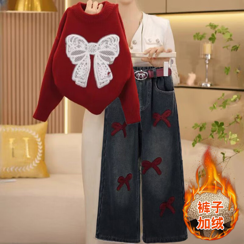 Siyang girls winter 2025 new fashion Korean style thickened Christmas red sweater, medium and large children's velvet jeans suit trendy H white bow sweater and black velvet jeans (120