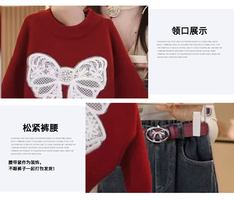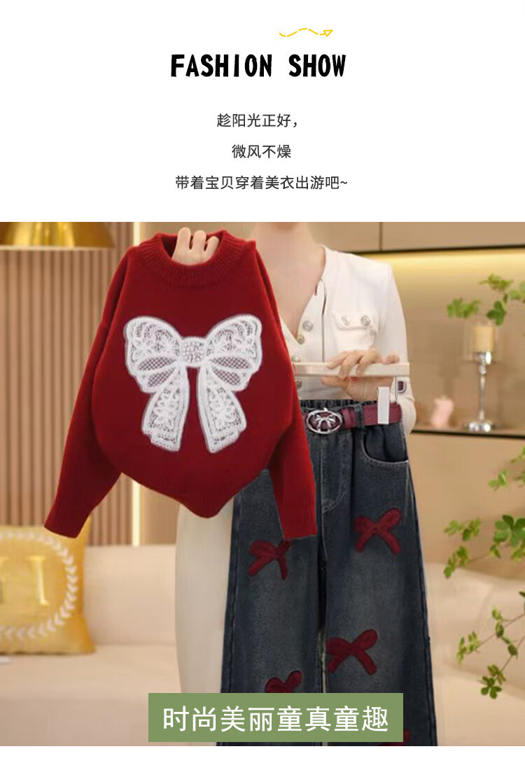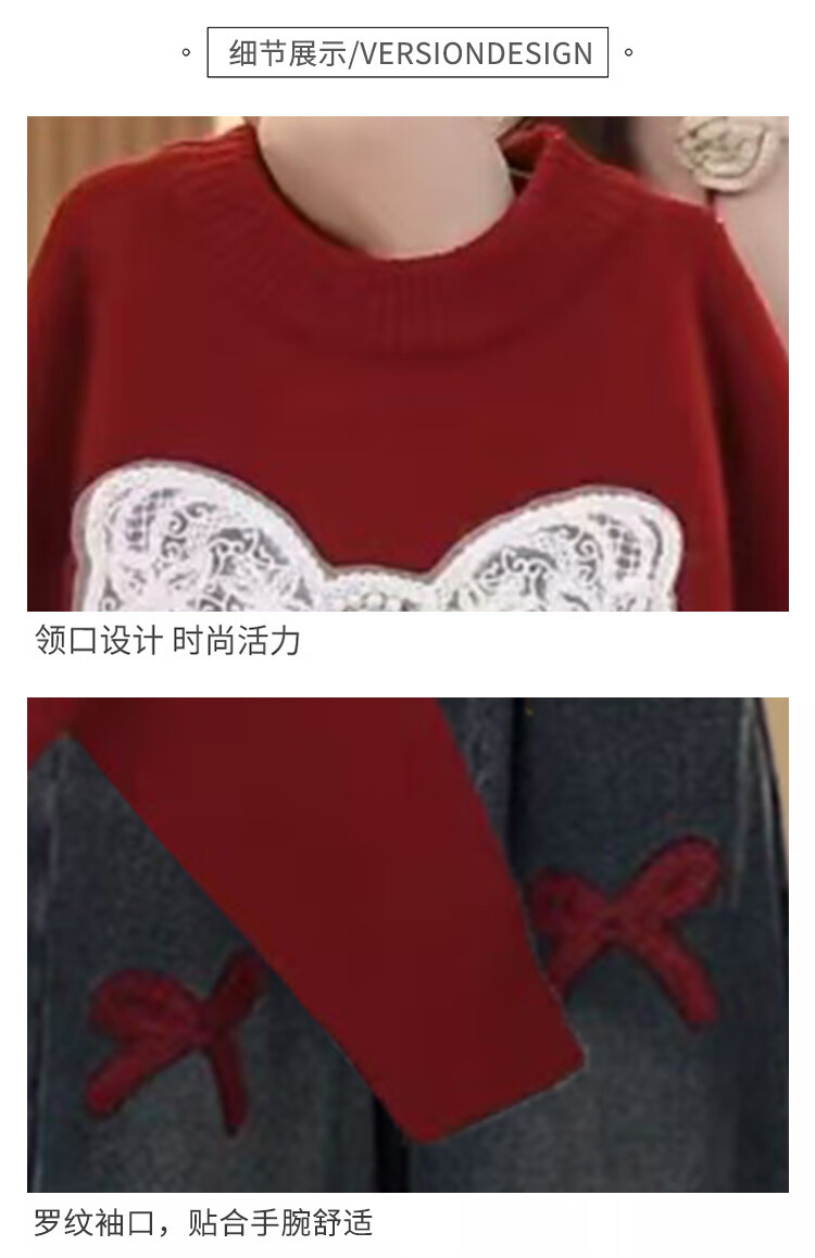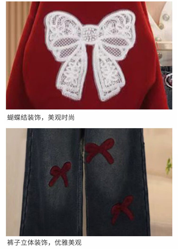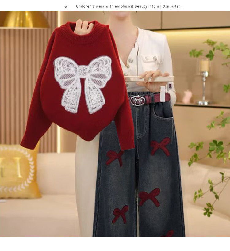 Siyang girls winter 2025 new fashion Korean style thickened Christmas red sweater, medium and large children's velvet jeans suit trendy H white bow sweater and black velvet jeans (120