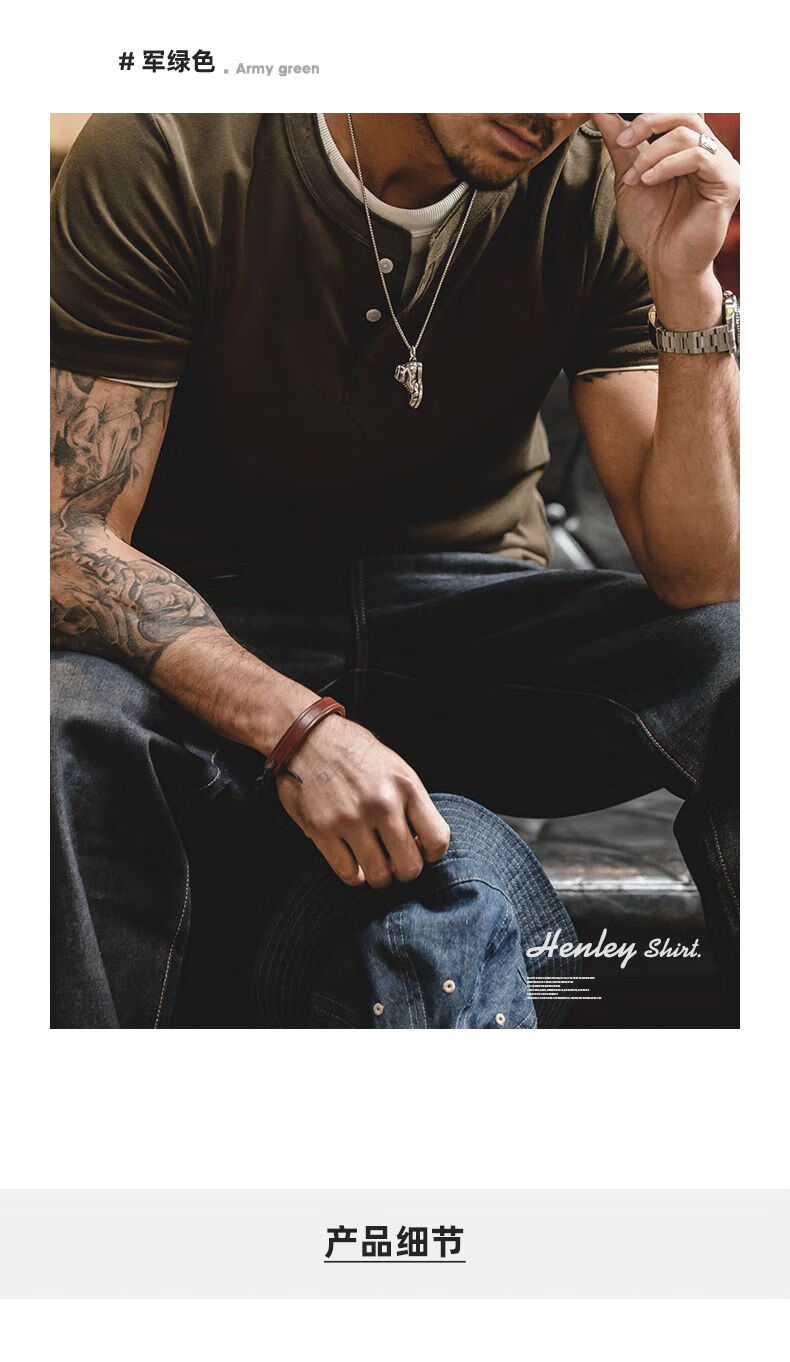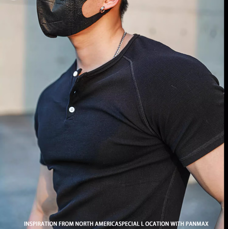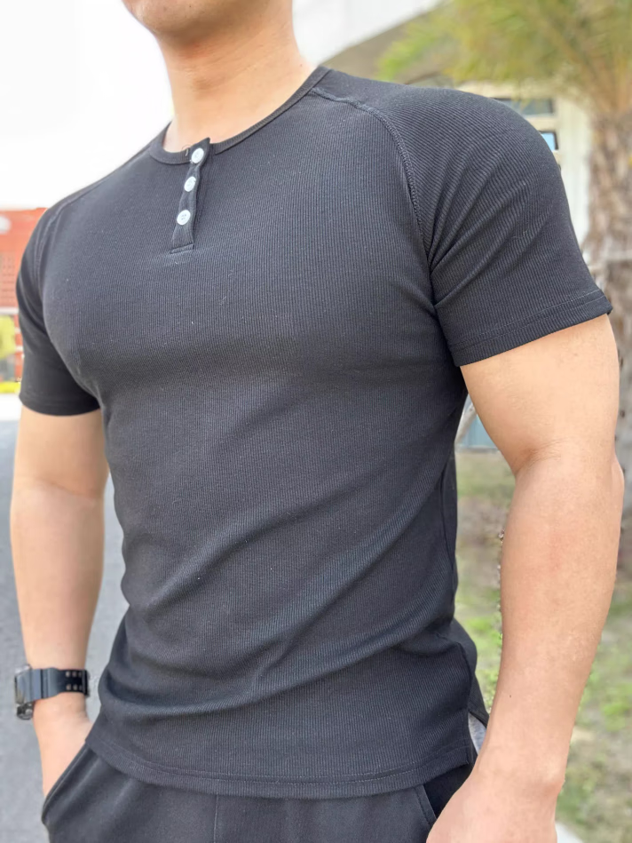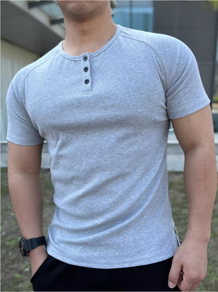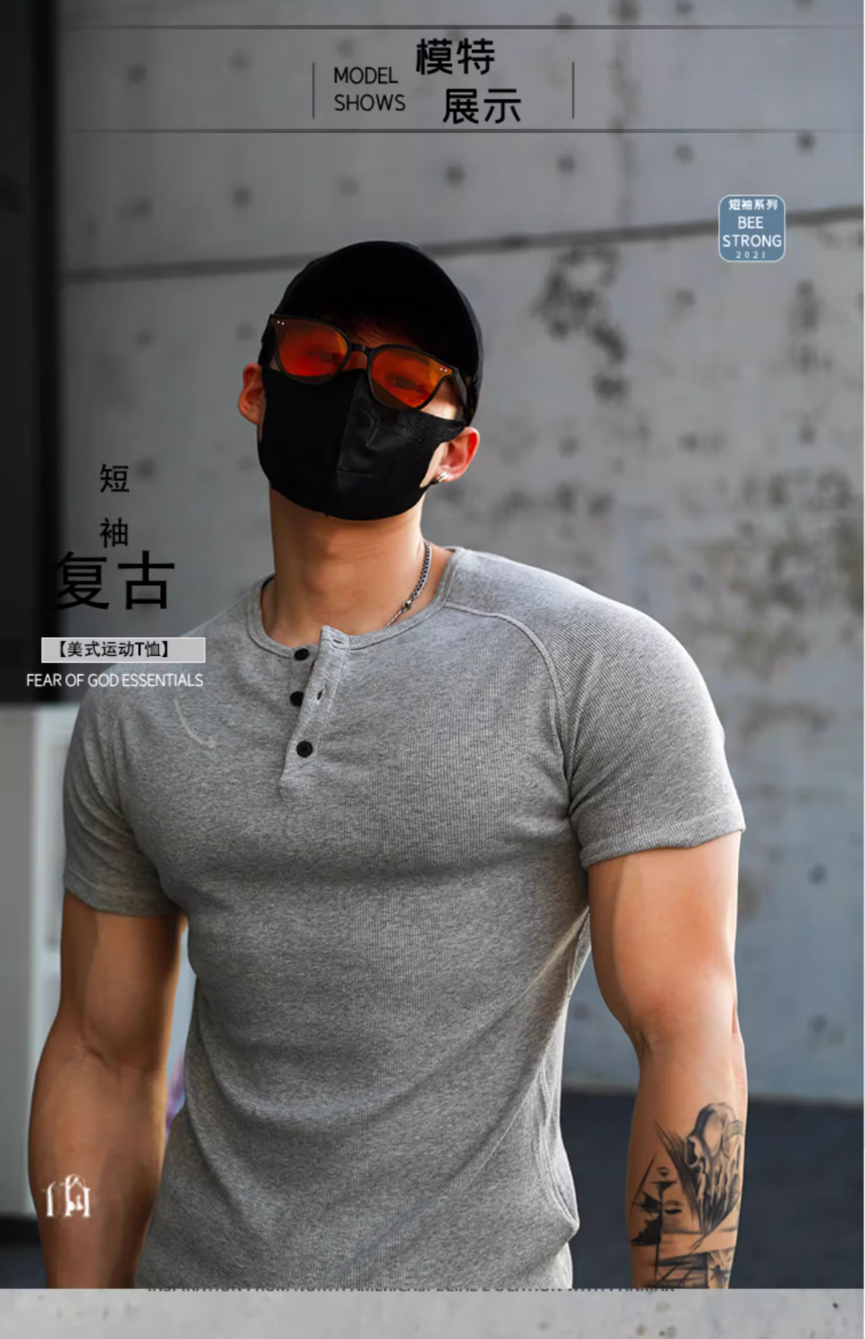 Summer casual American retro Henley shirt short-sleeved fitness tough guy T-shirt men's slim heavyweight thick threaded bottoming shirt Gray M Recommended weight 50-60kg