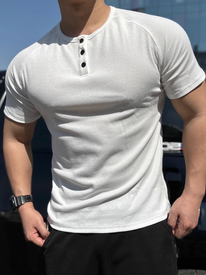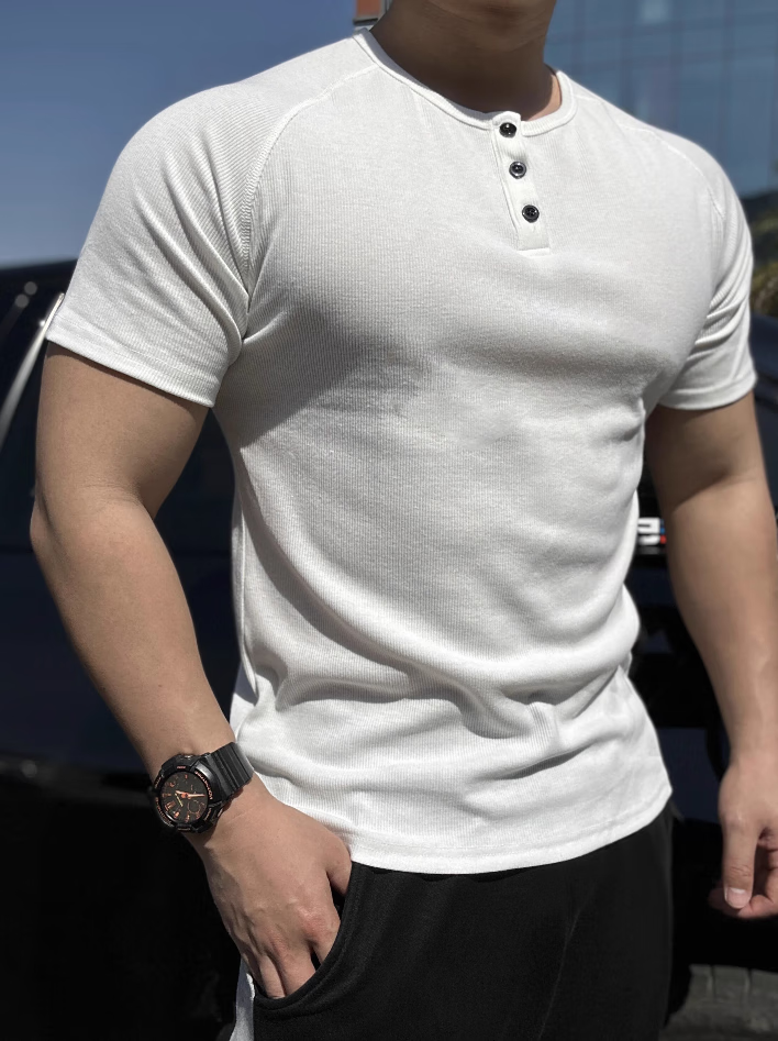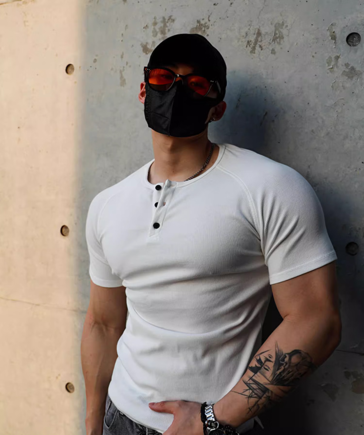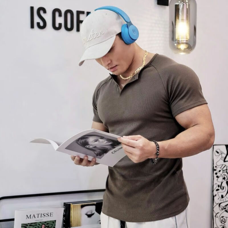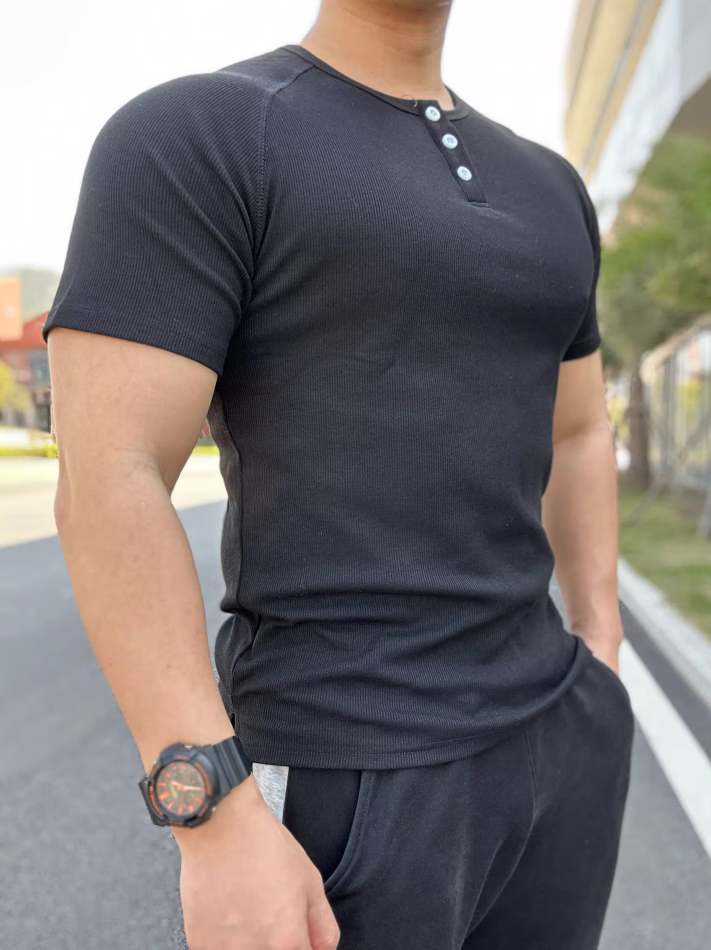 Summer casual American retro Henley shirt short-sleeved fitness tough guy T-shirt men's slim heavyweight thick threaded bottoming shirt Gray M Recommended weight 50-60kg