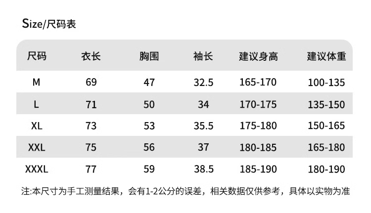 China (cm) 165 / 88-90 170 / 96-98 175 / 108-110 180 / 118-122 185 / 126-130