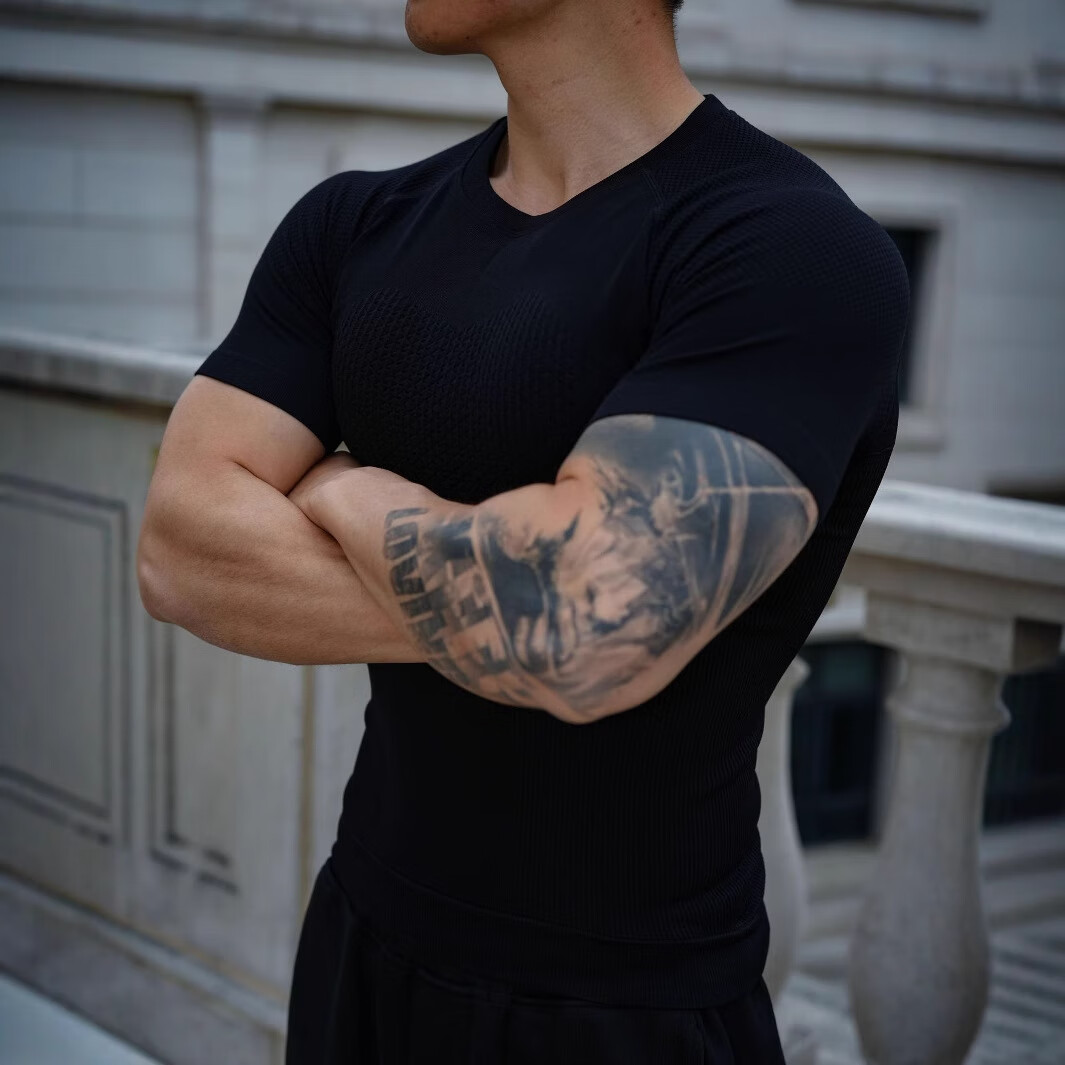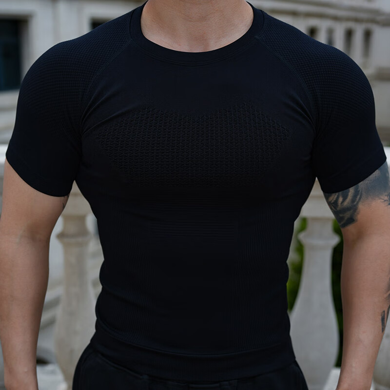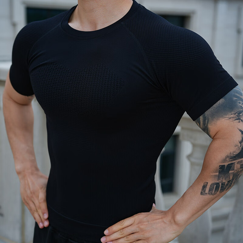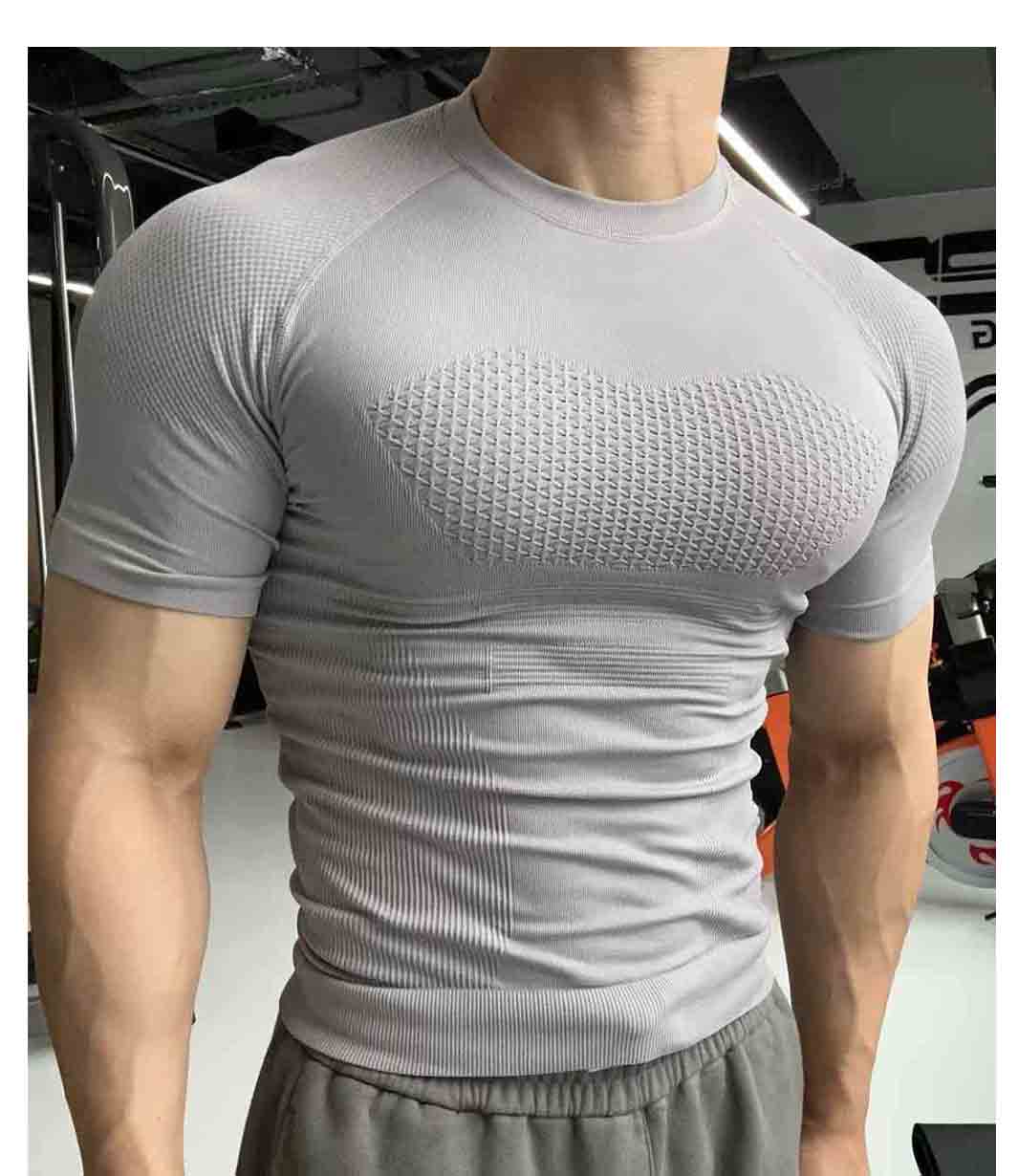 Seamless quick-drying breathable sports fitness short-sleeved T-shirt running training cycling clothing compression tight elastic top for men gray 2XL