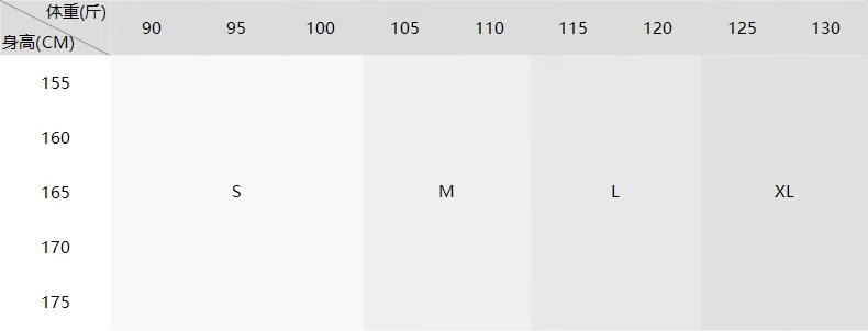 China (cm) 160-165/84-86 165-170 / 88-90 167-172 / 92-96 168-173 / 98-102 170-176 / 106-110