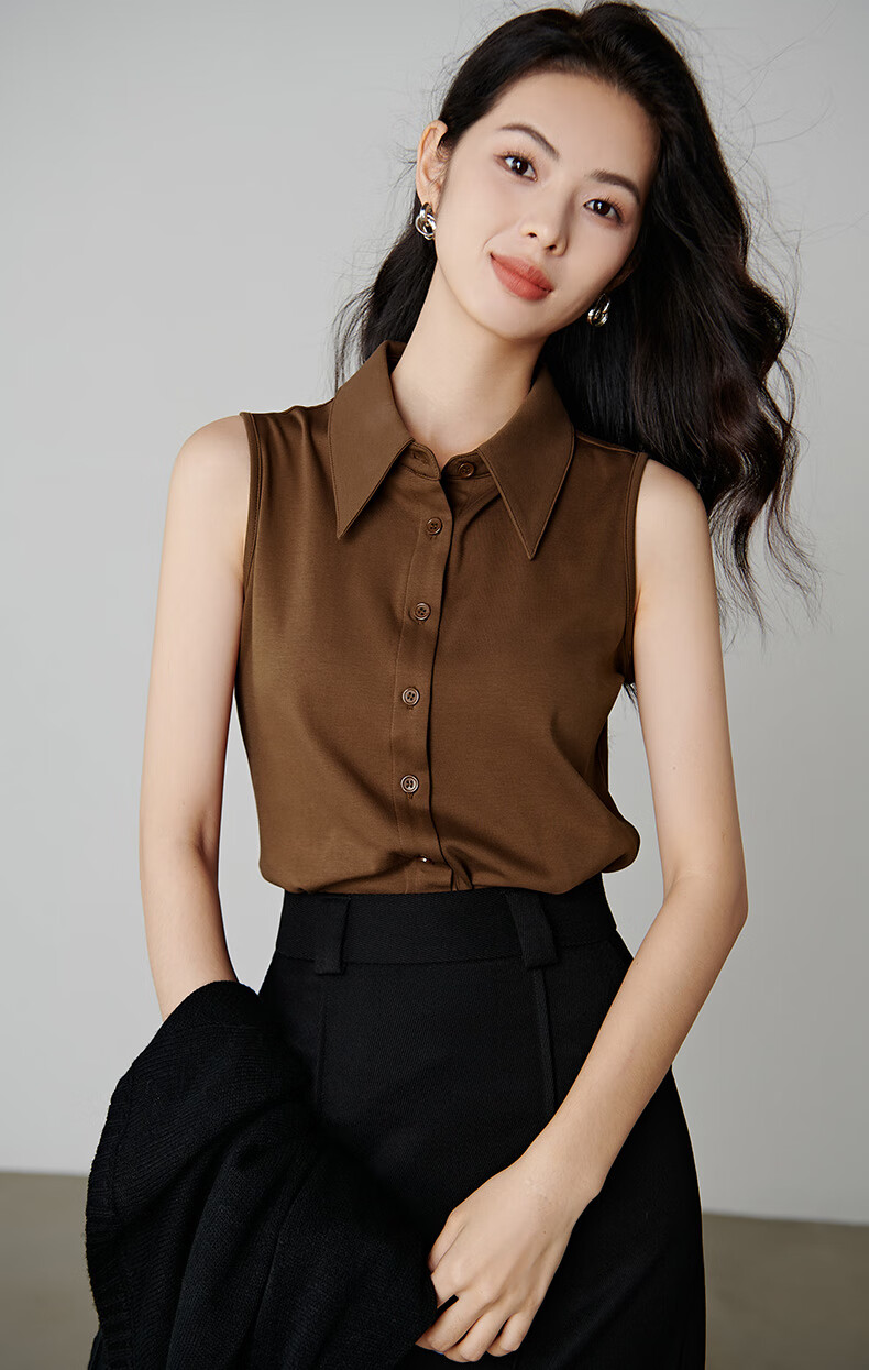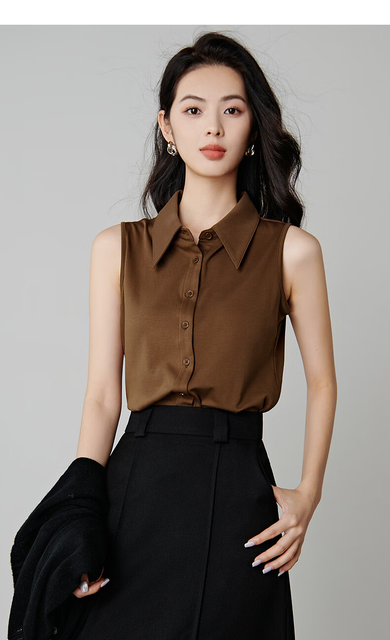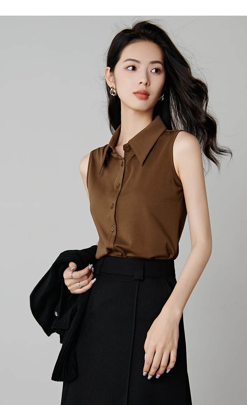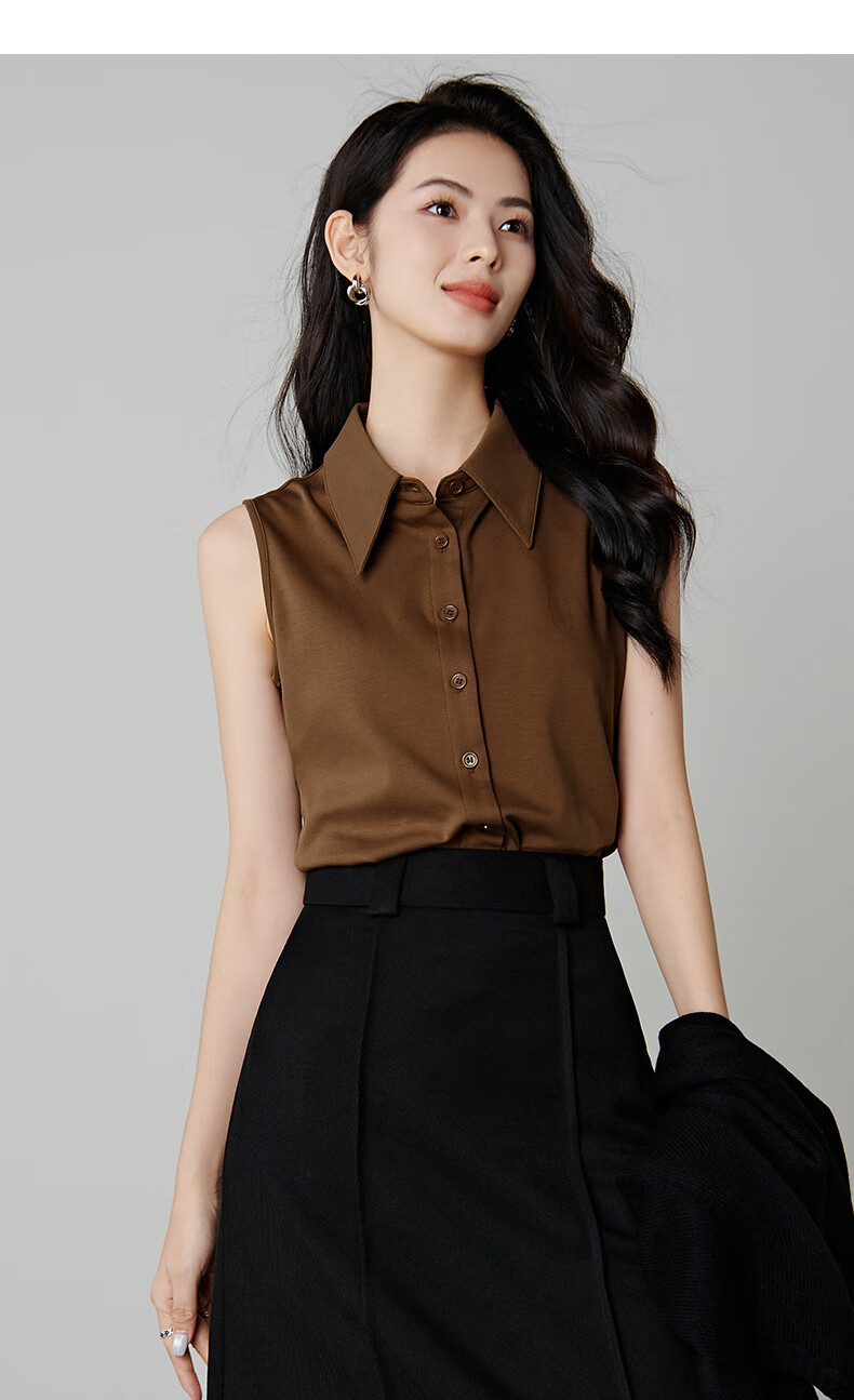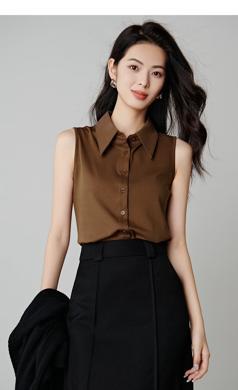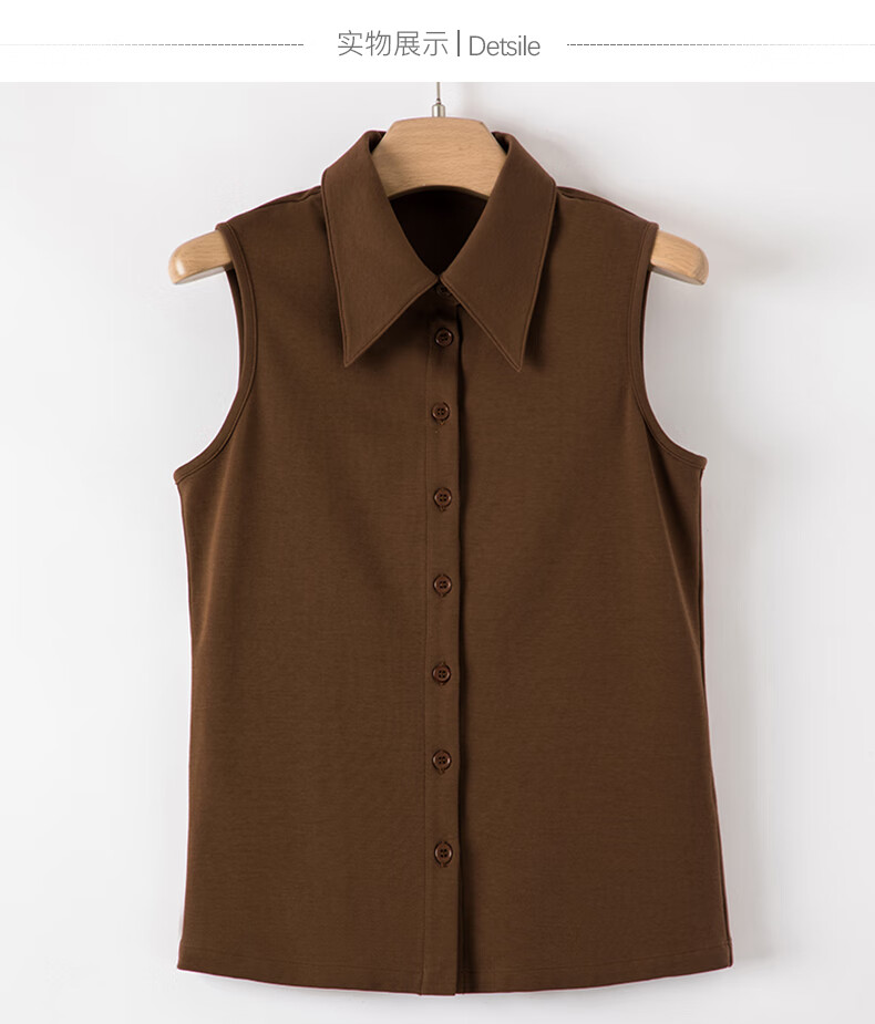 Late white new product 2026 spring layering artifact cotton lapel top simple and versatile commuting sleeveless shirt for women coffee color XL