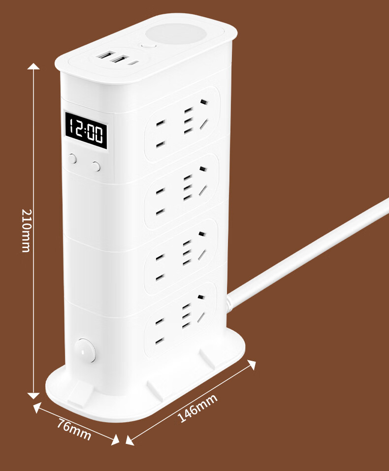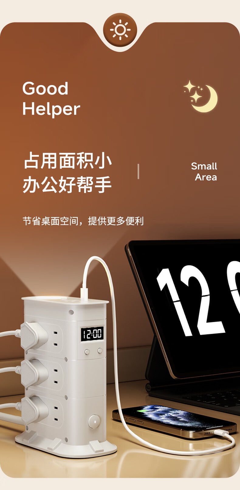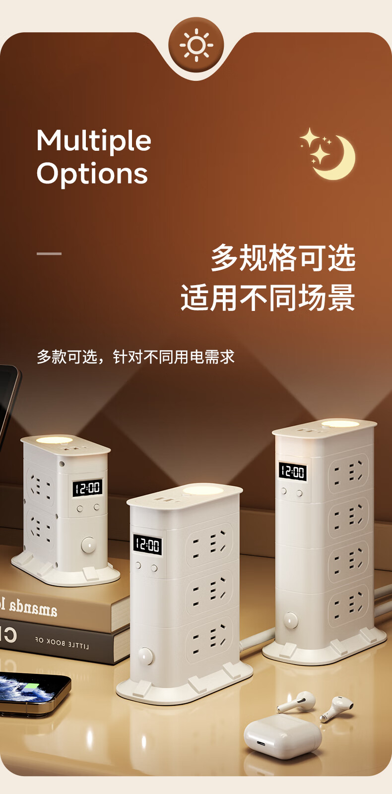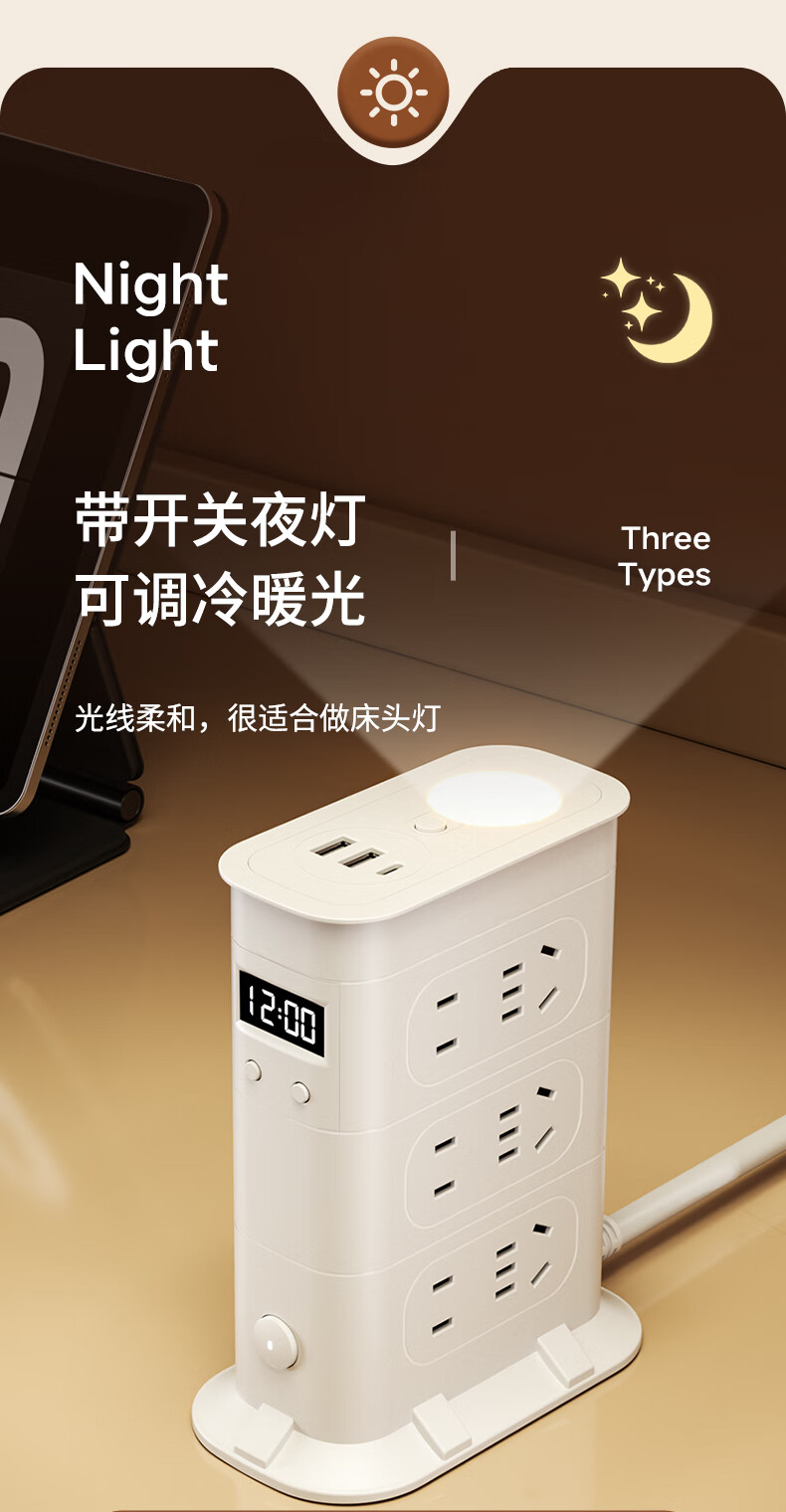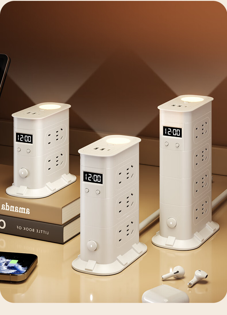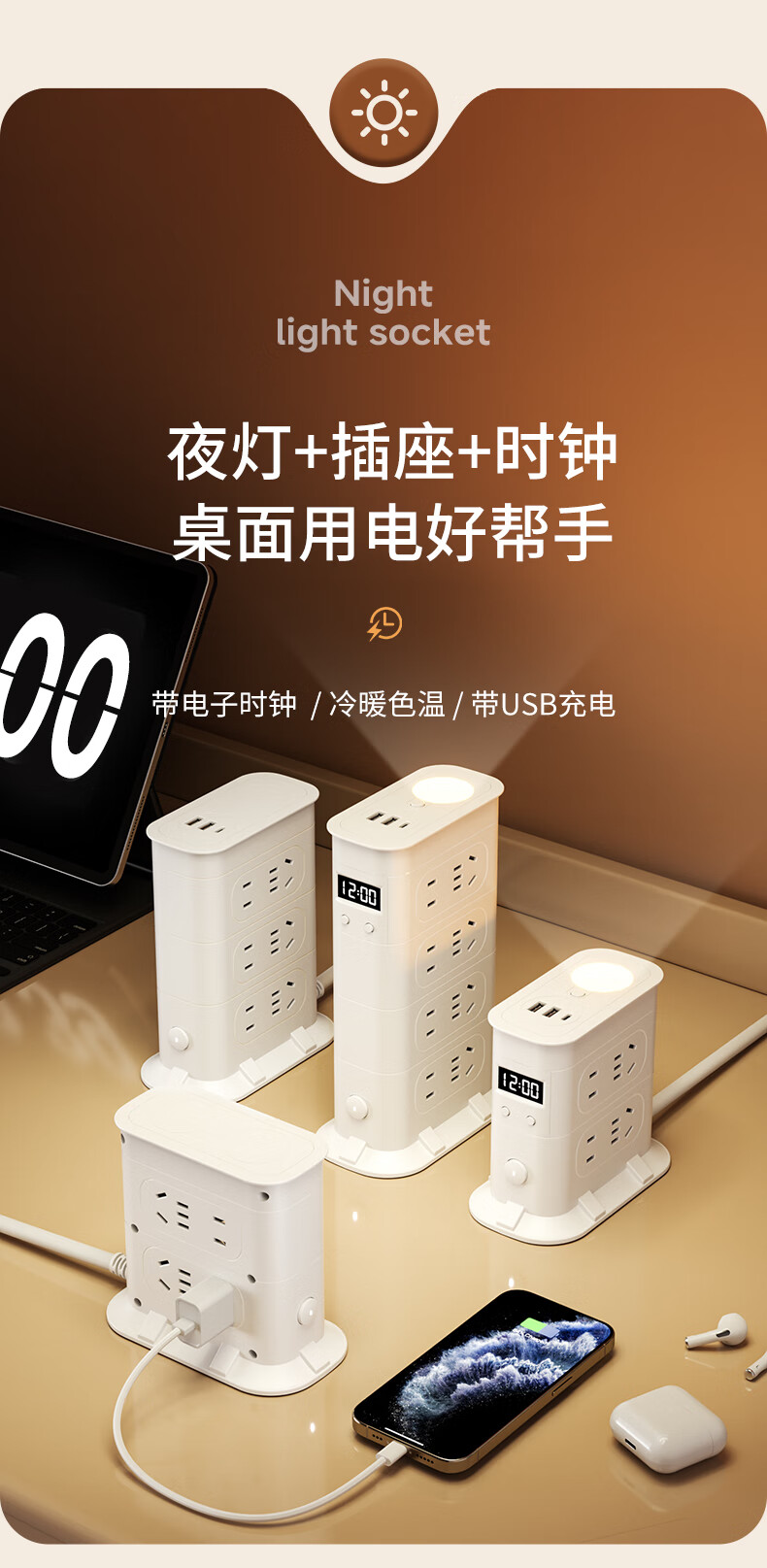 JD Logistics Vertical Smart Socket Multifunctional Porous USB Night Light Converter Home Office Desktop Power Strip Multifunctional Vertical Power Strip with Night Light 2 Layers 8 Sockets With USB + Night Light + Time Display Total Length 0.8 Meters