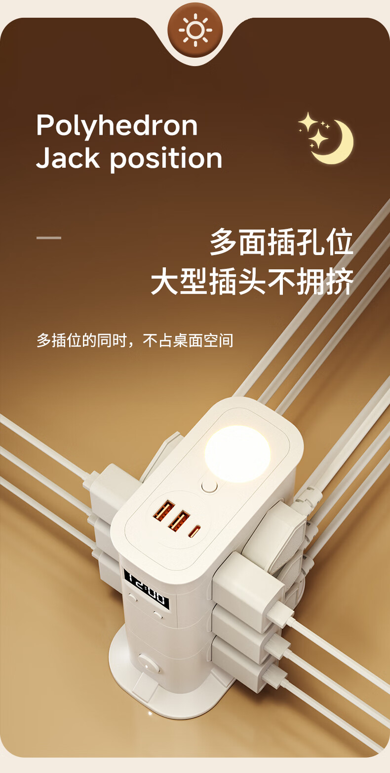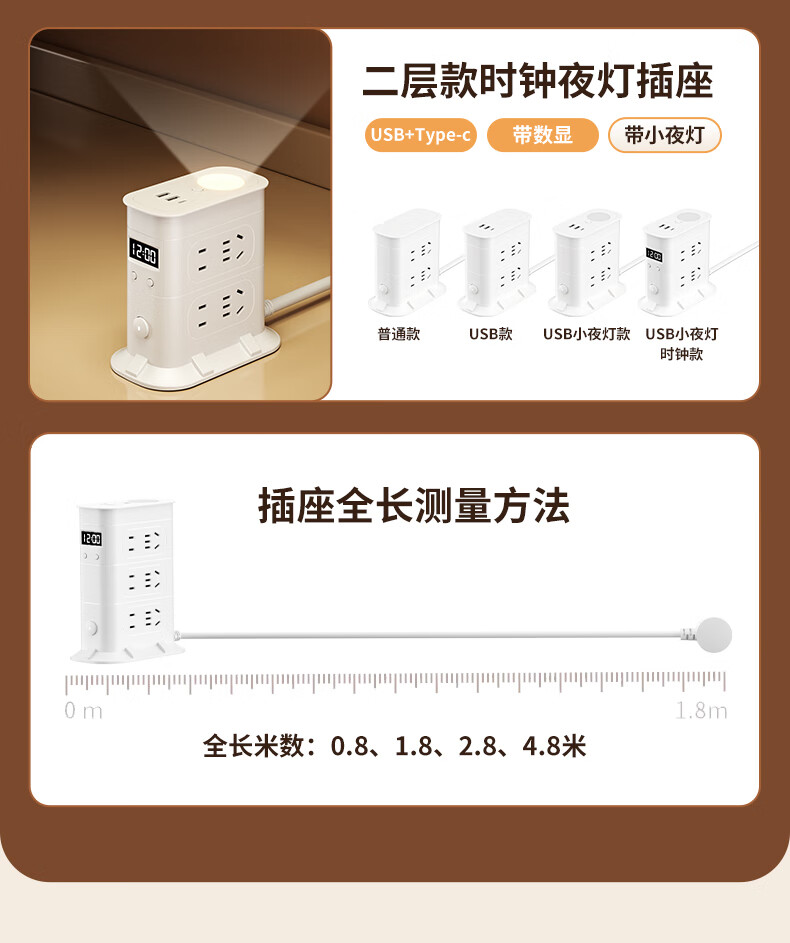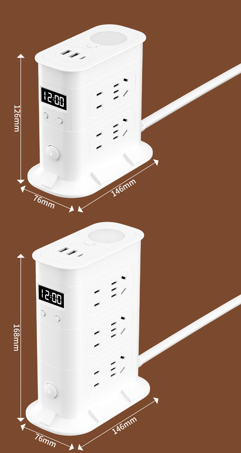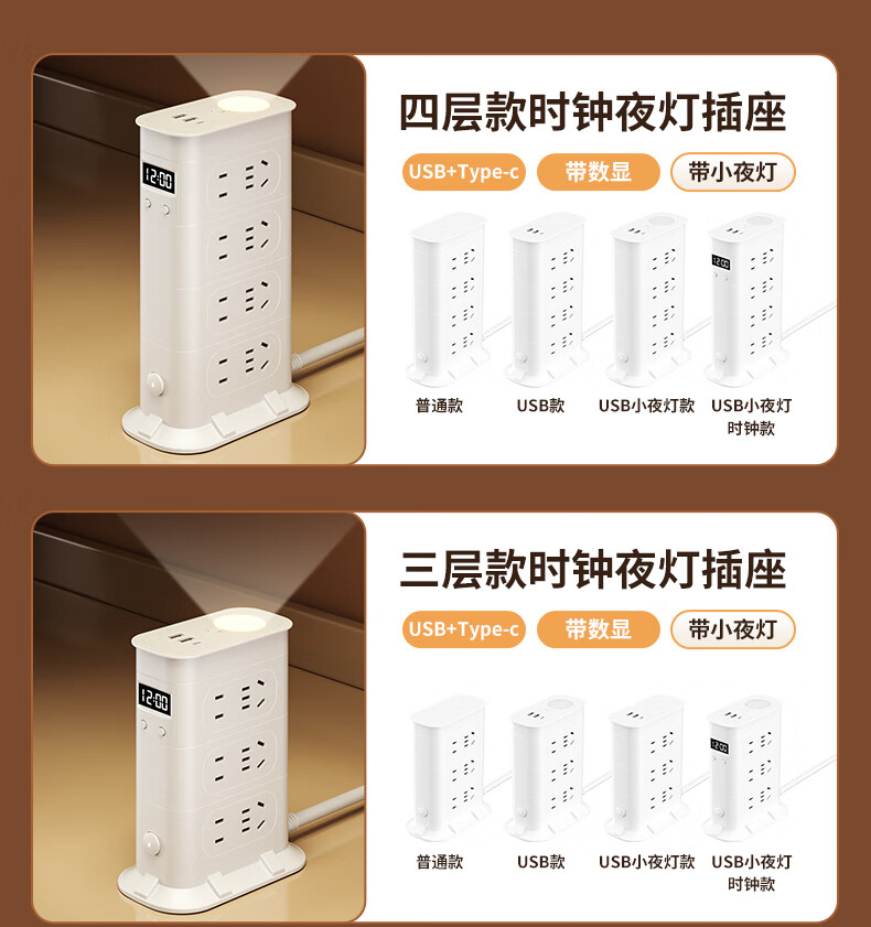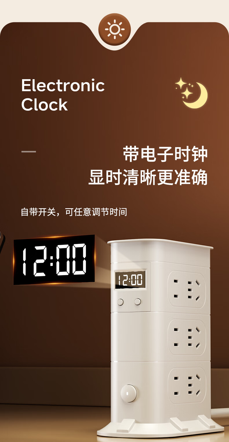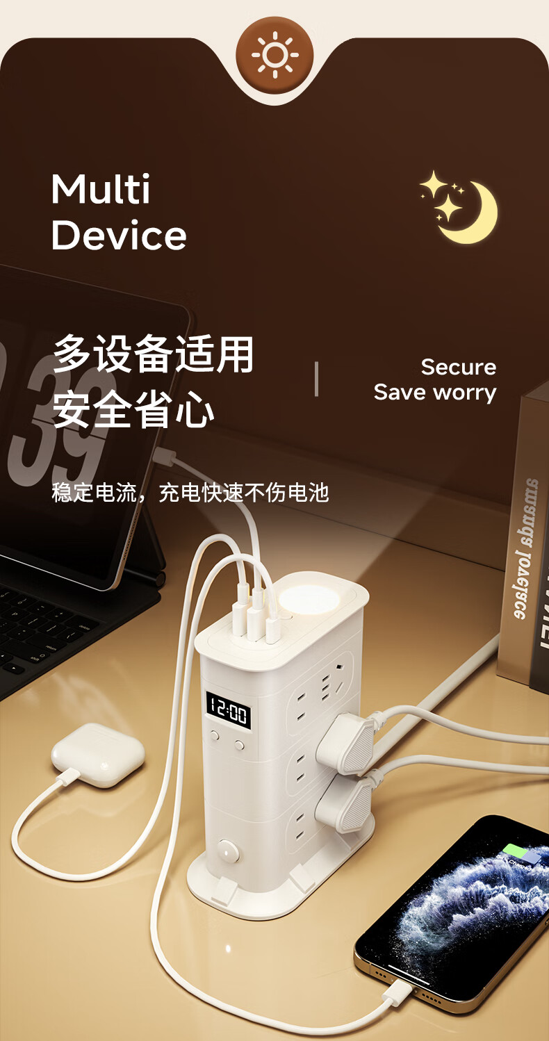 JD Logistics Vertical Smart Socket Multifunctional Porous USB Night Light Converter Home Office Desktop Power Strip Multifunctional Vertical Power Strip with Night Light 2 Layers 8 Sockets With USB + Night Light + Time Display Total Length 0.8 Meters