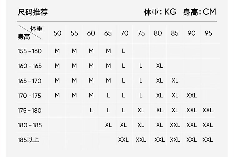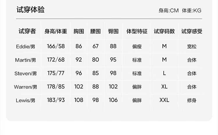 China (cm) 160-165/84-86 165-170 / 88-90 167-172 / 92-96 168-173 / 98-102 170-176 / 106-110