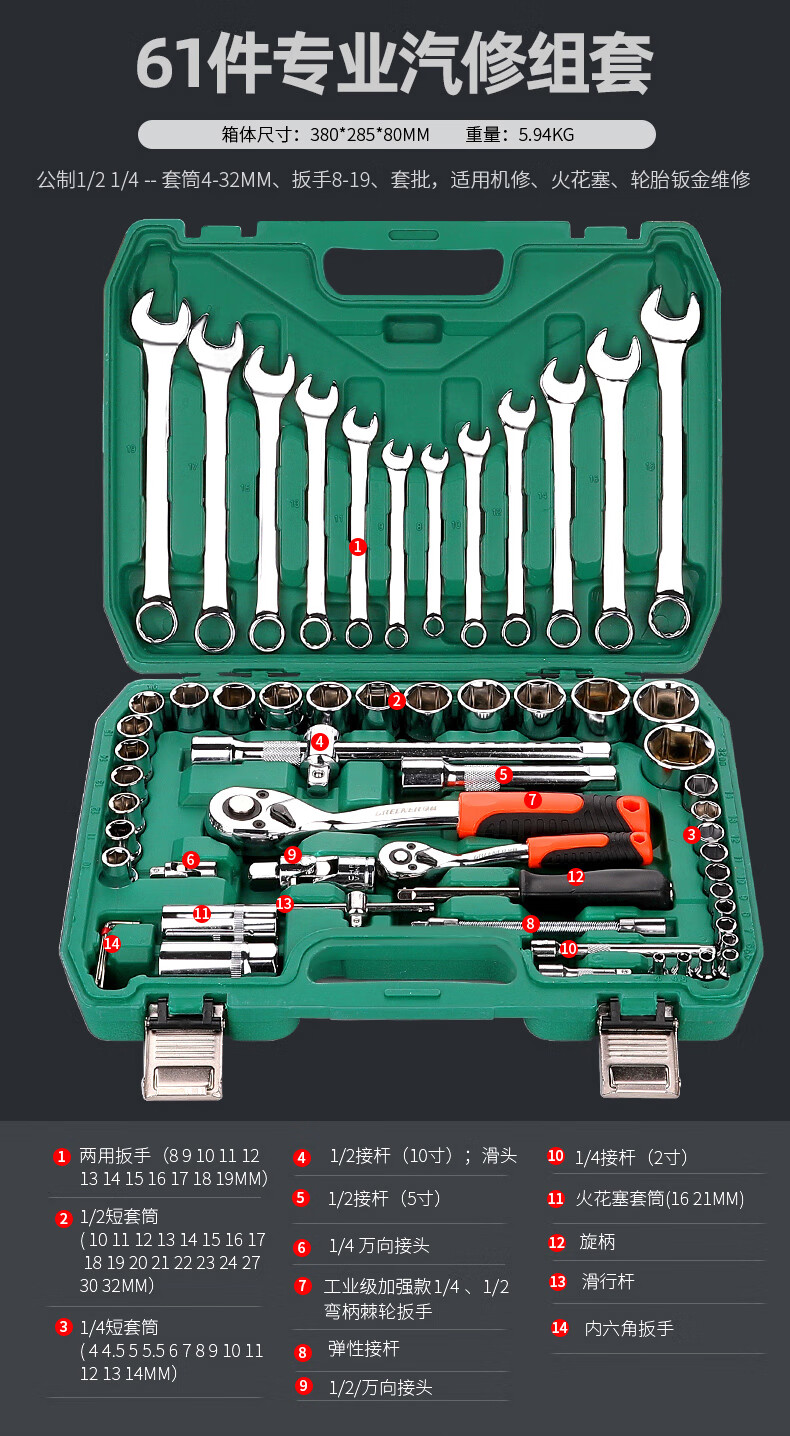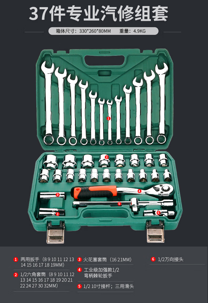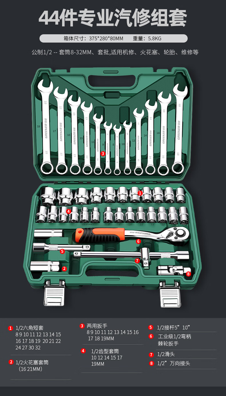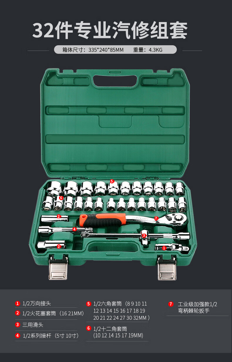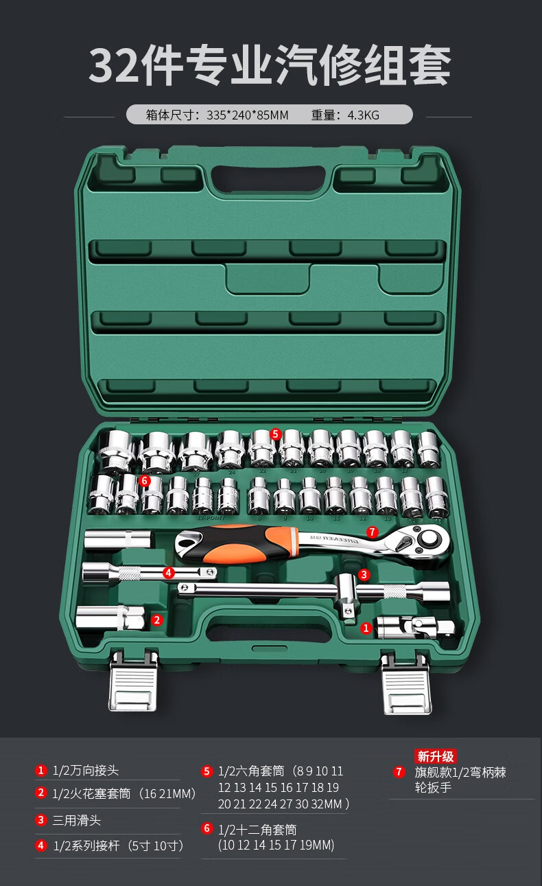 Green Forest 32-piece socket set, socket wrench, spark plug tool set, auto repair vehicle tool box, always available with the vehicle, upgraded 72-tooth curved handle auto repair 61