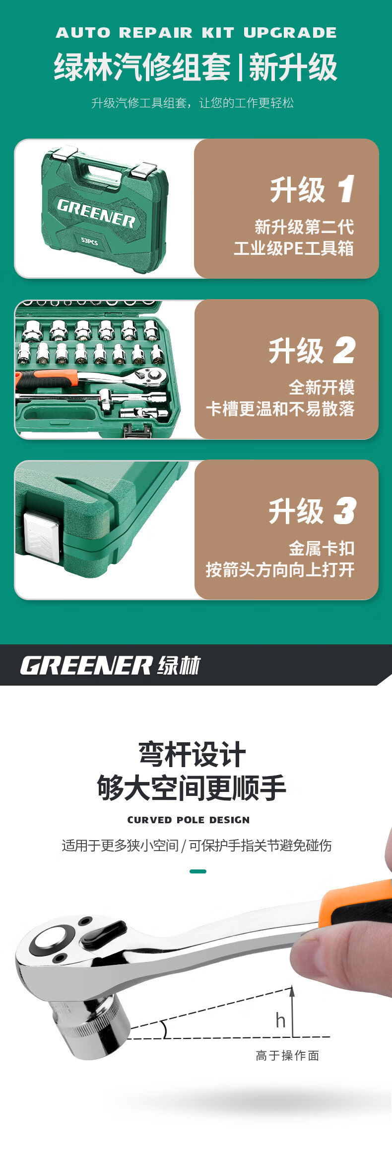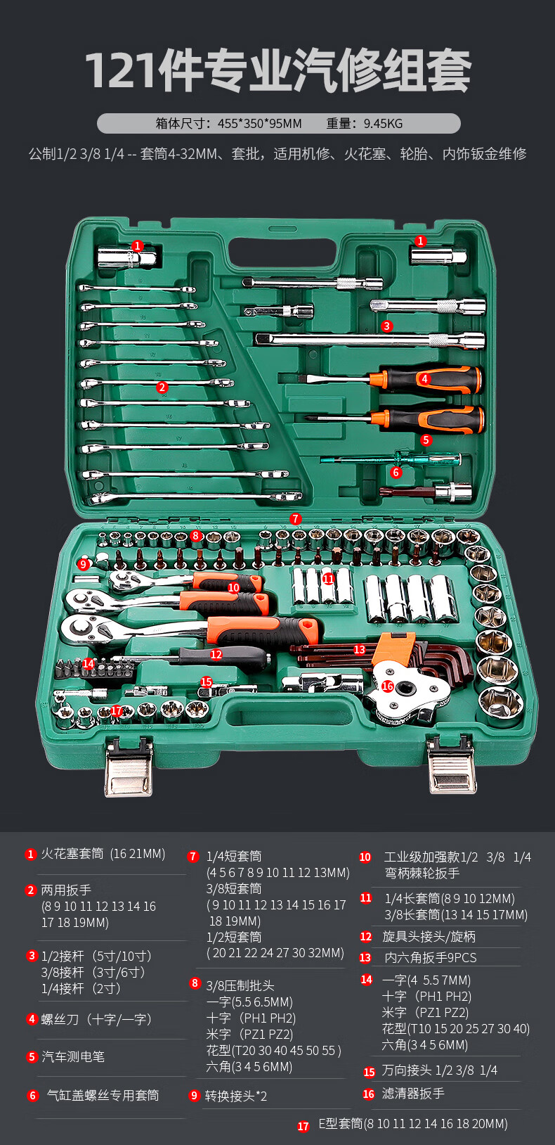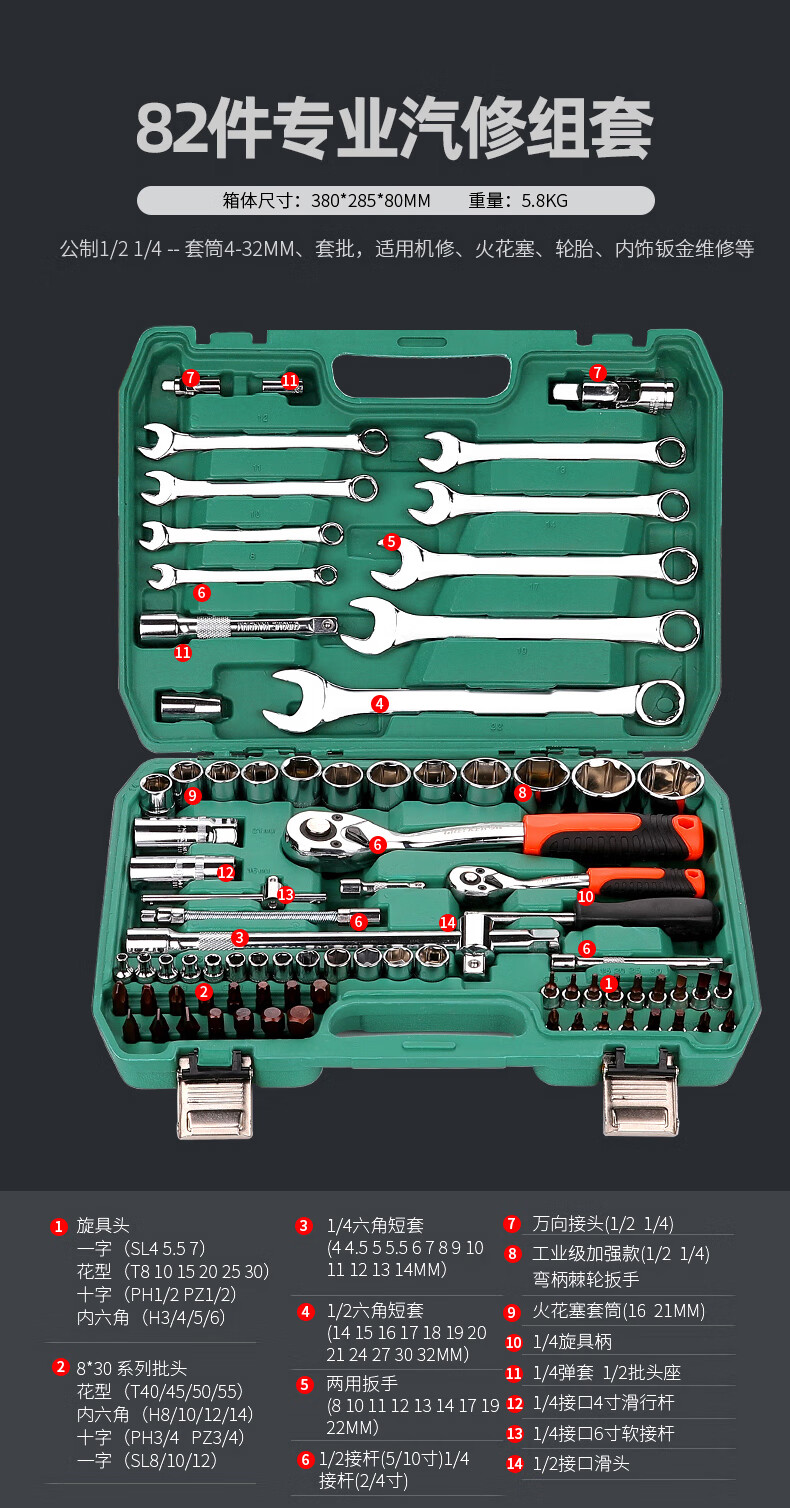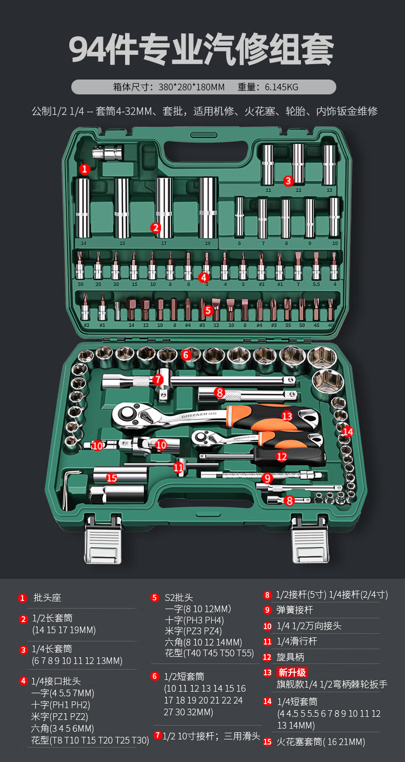 Green Forest 32-piece socket set, socket wrench, spark plug tool set, auto repair vehicle tool box, always available with the vehicle, upgraded 72-tooth curved handle auto repair 61