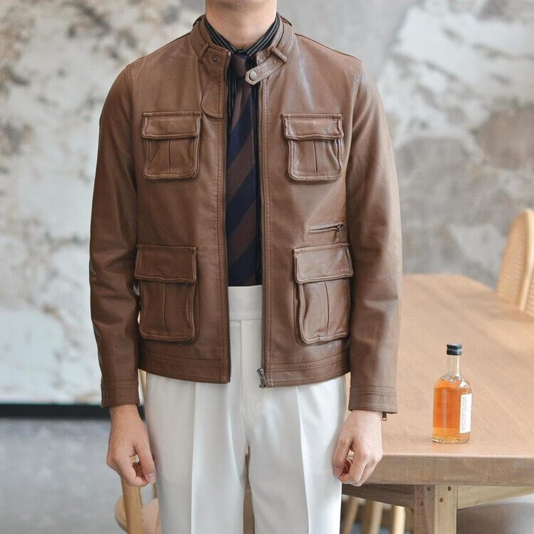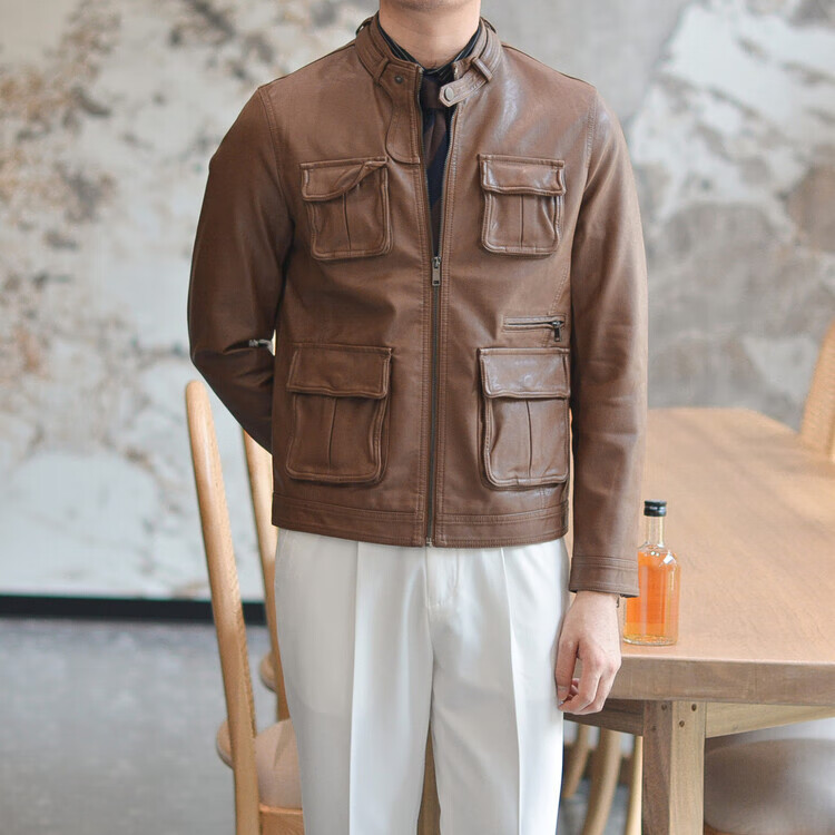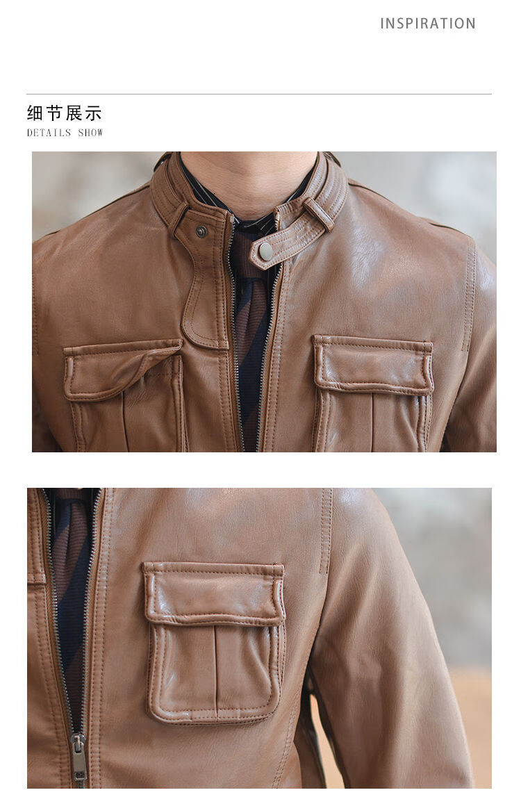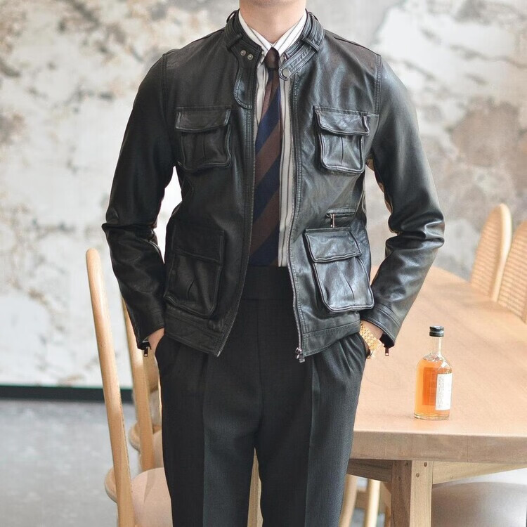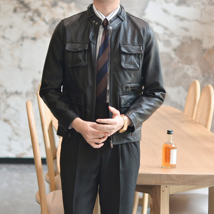 VIPOL Autumn and Winter New British Retro Hunting Stand Collar PU Leather Jacket Men's Korean Style Light Luxury Slim Workwear Leather Jacket Black XL