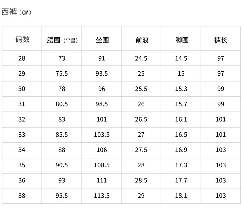 USA(inch) 28-30 30-32 32-34 34-38 38-42
