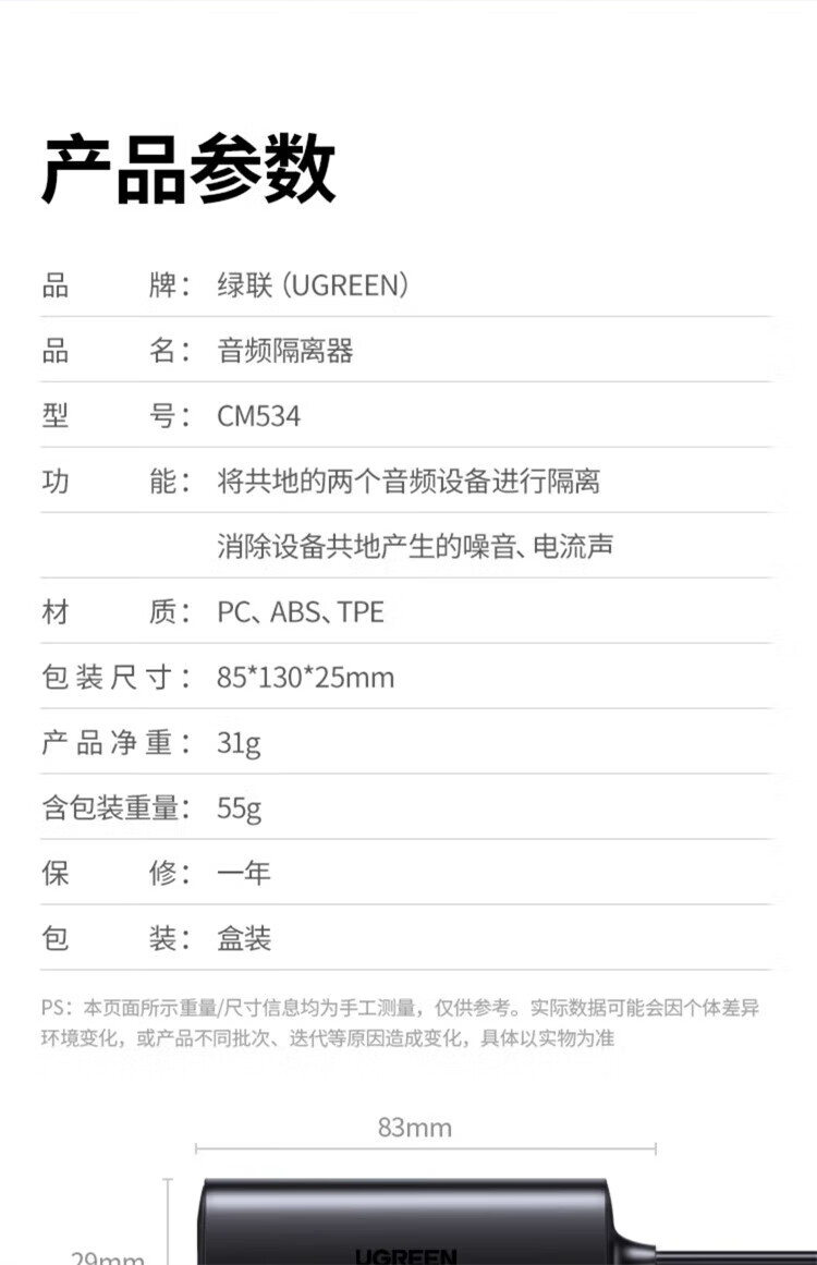 UGREEN audio common ground isolator 3.5mm audio noise common ground filter eliminator transformer signal interference audio isolator eliminates current/noise audio isolator CM534-90491