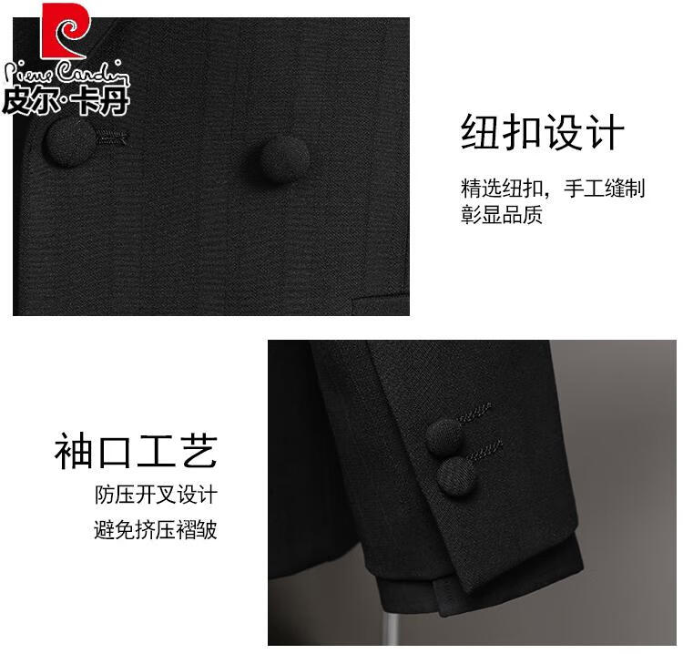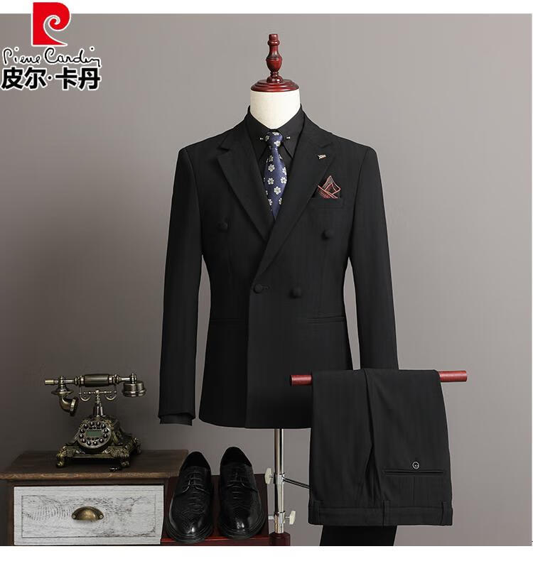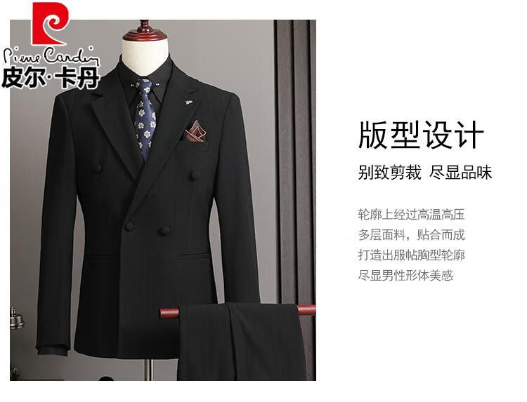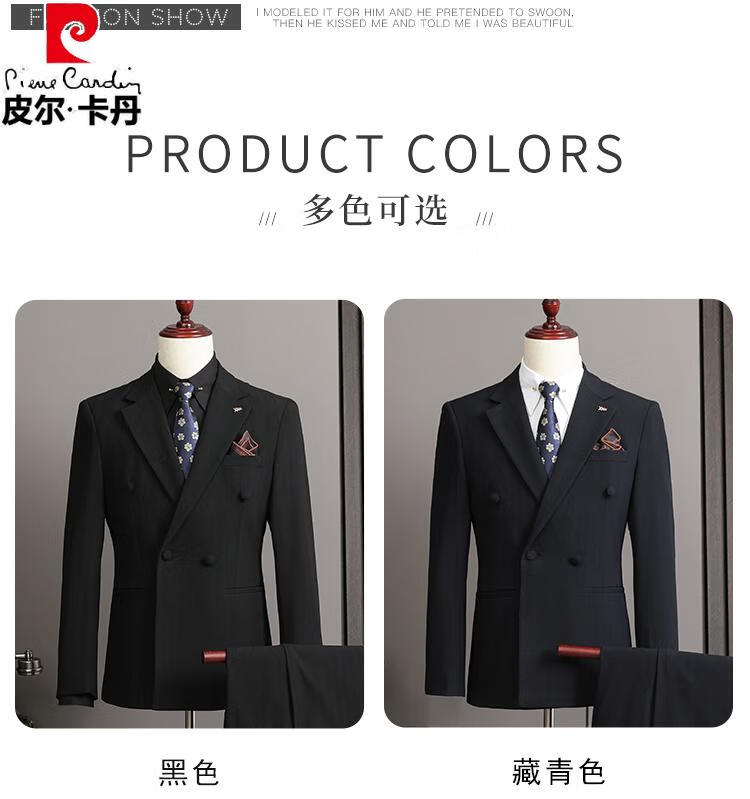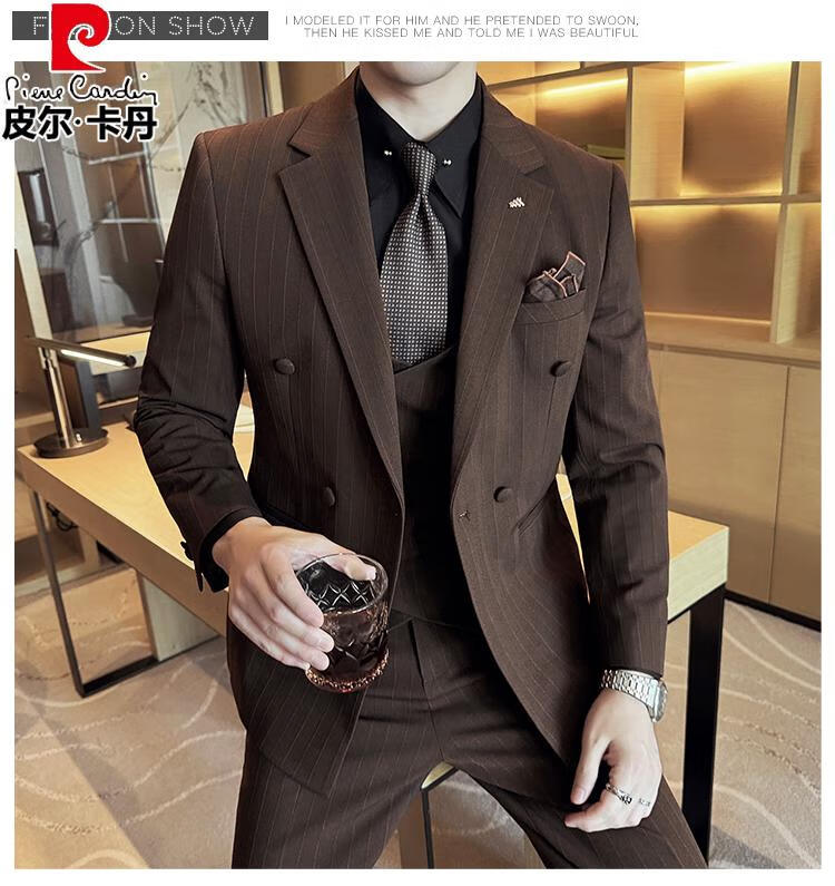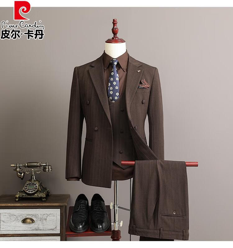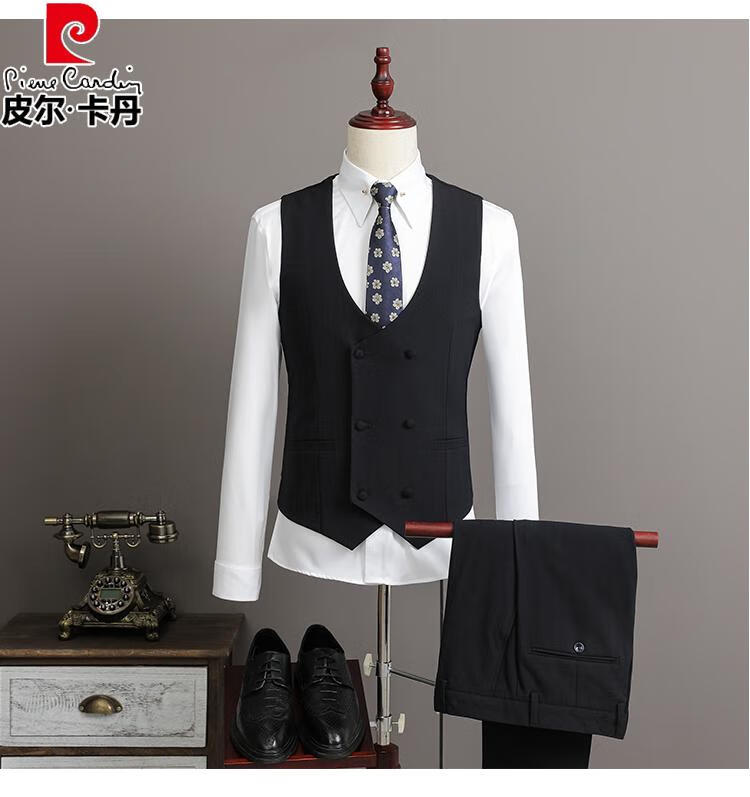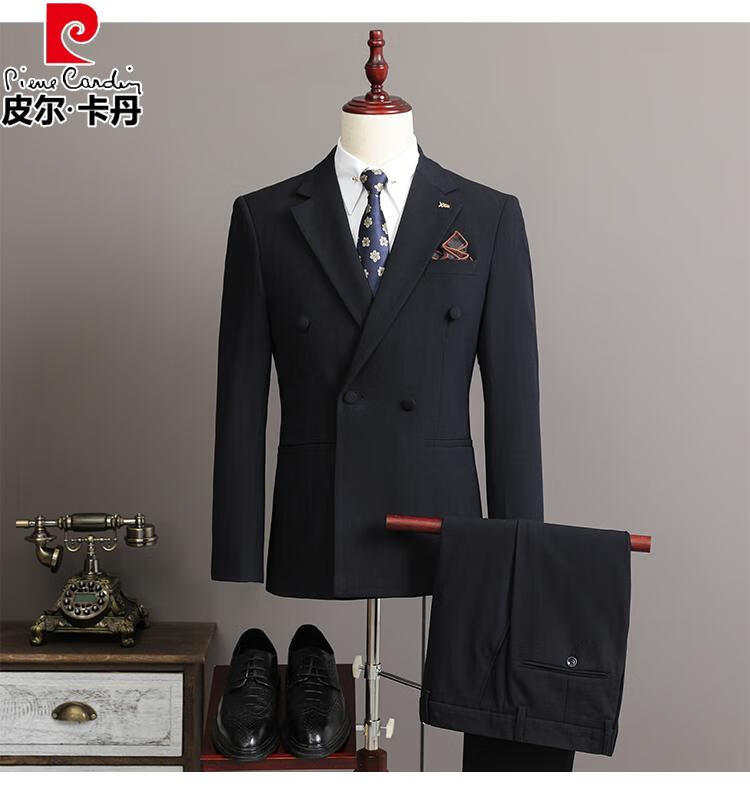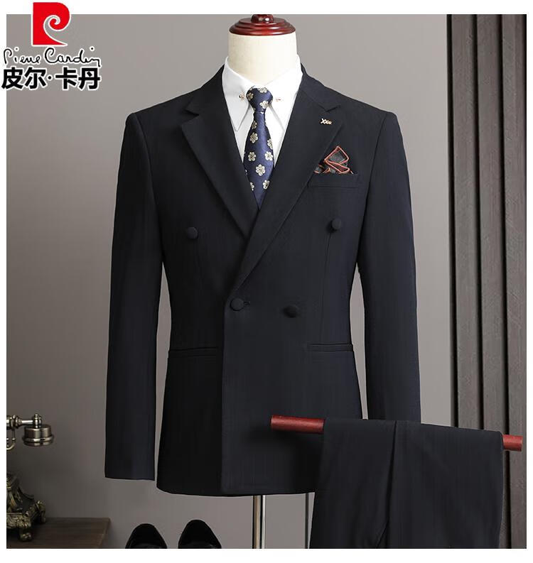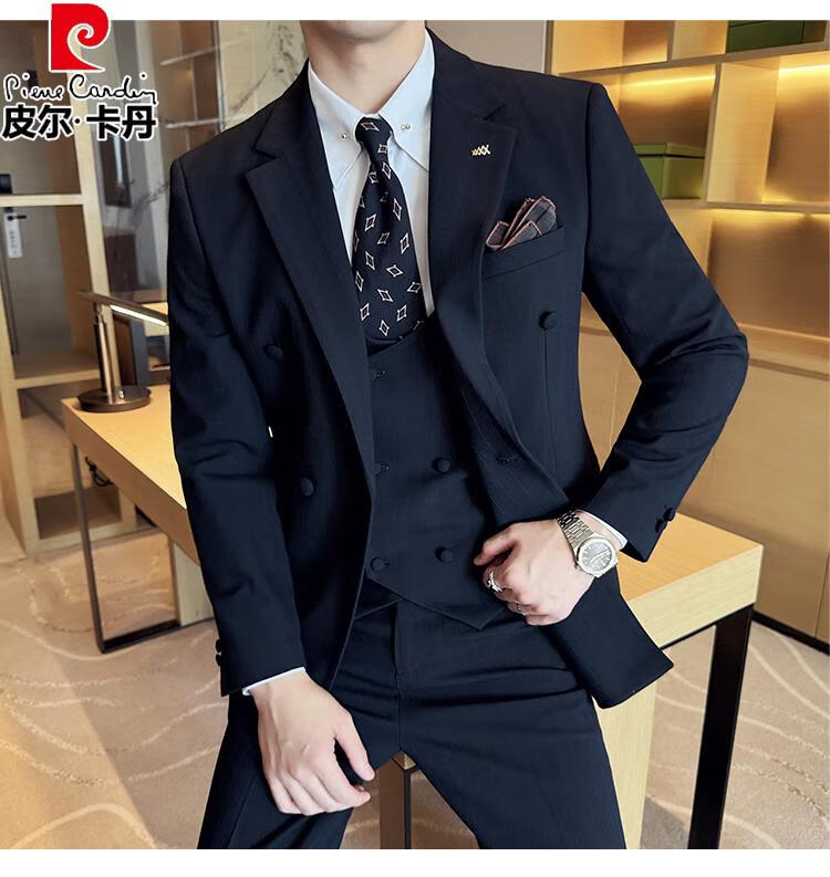 Pierre Cardin double-breasted striped suit suit men's three-piece high-end business casual formal groom's wedding dress navy blue three-piece suit L 50 105-120Jin Jin equals 0.5 kg to wear