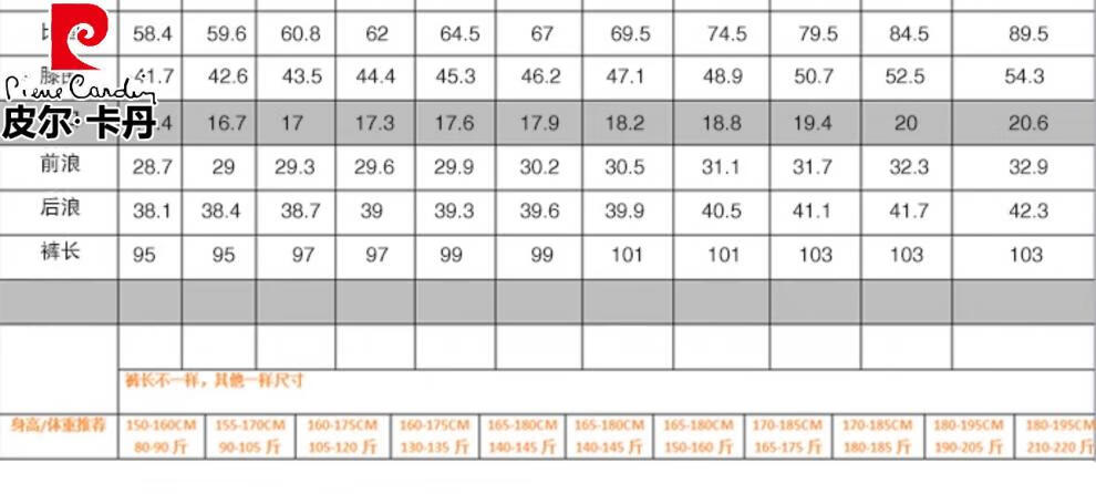 China (cm) 165 / 88-90 170 / 96-98 175 / 108-110 180 / 118-122 185 / 126-130