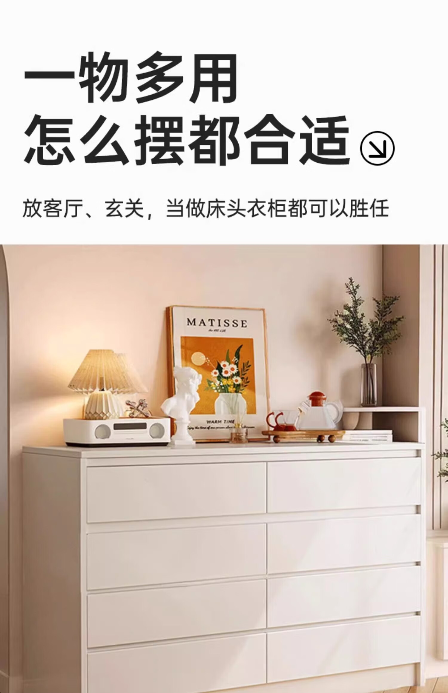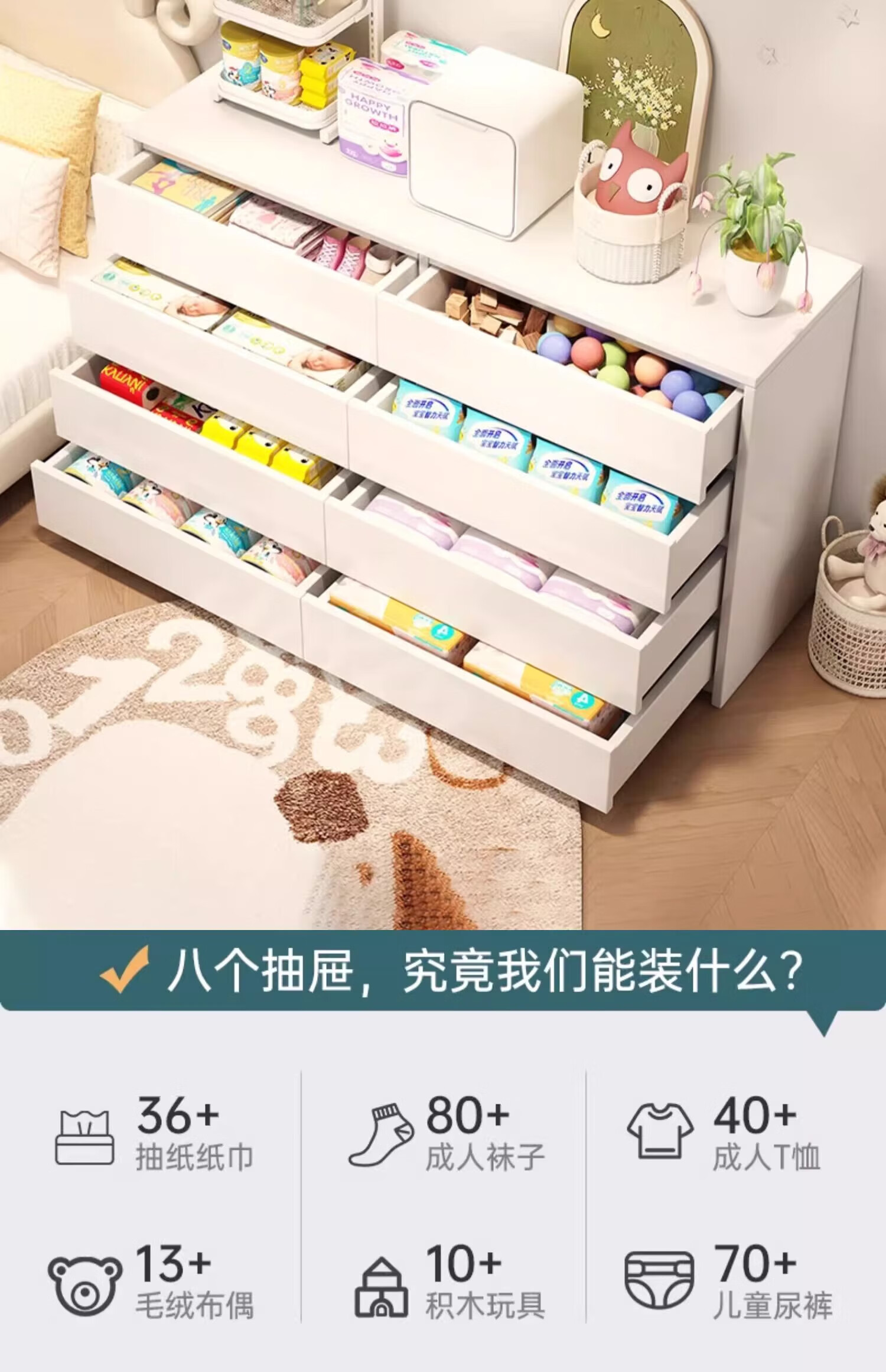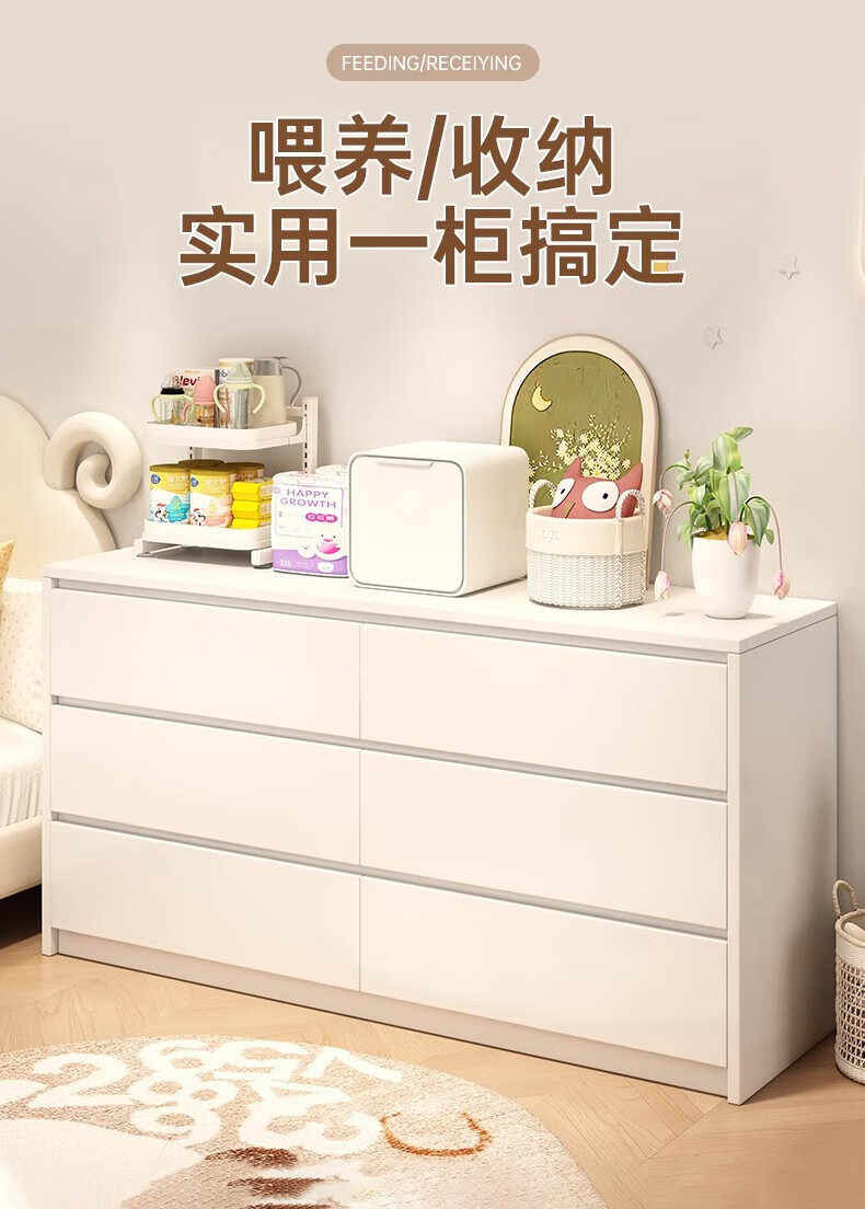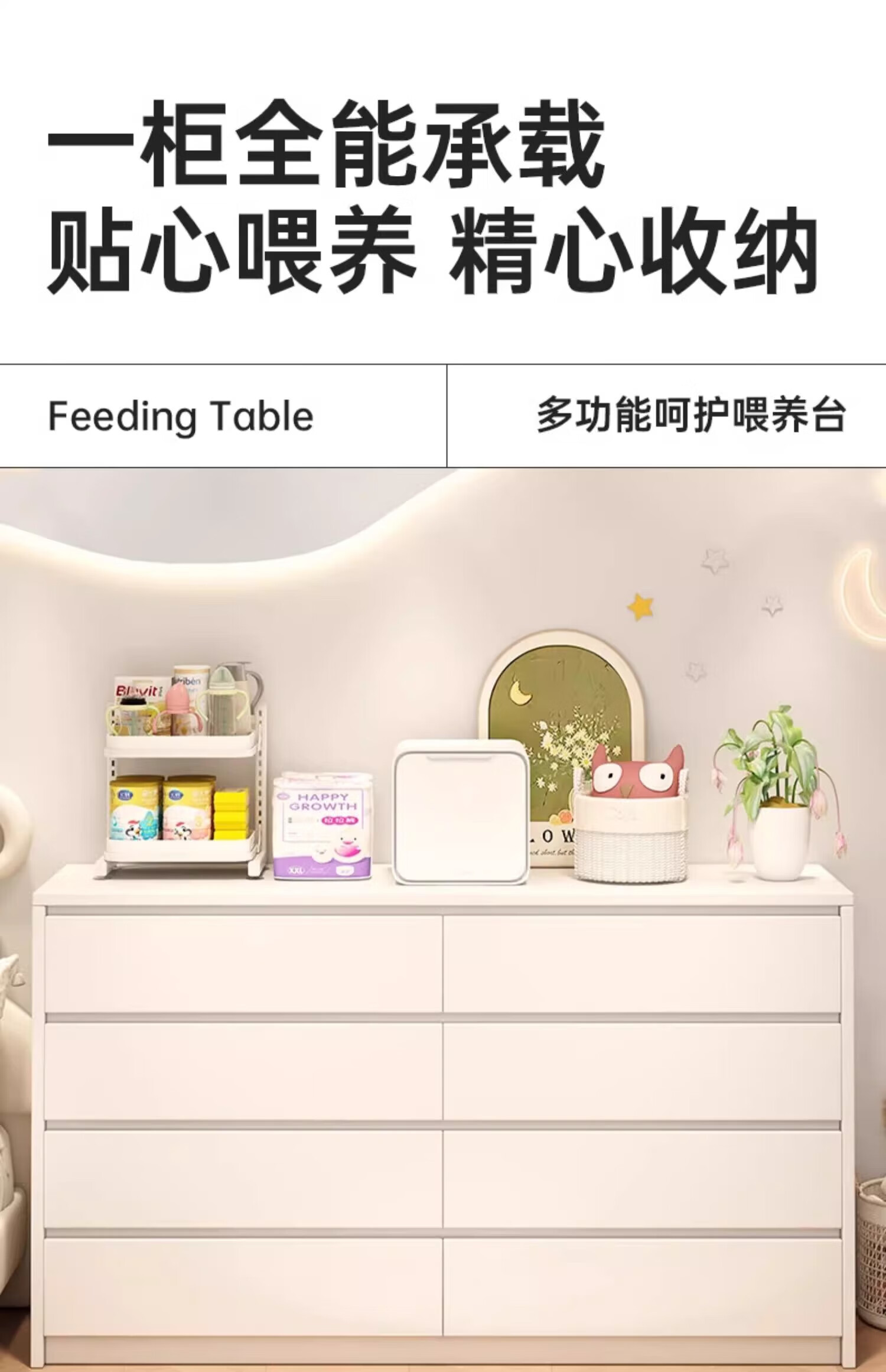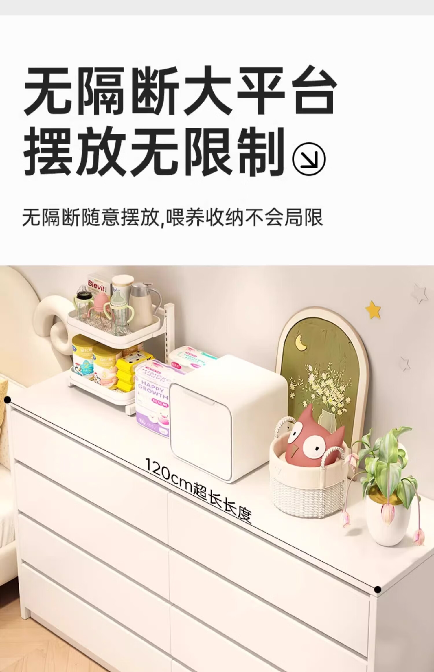 Drawer cabinet, living room, cream style bedside table, baby feeding table, bedroom storage storage cabinet, side cabinet, storage cabinet, chest of drawers, double rows and eight drawers, warm white, 120CM extended