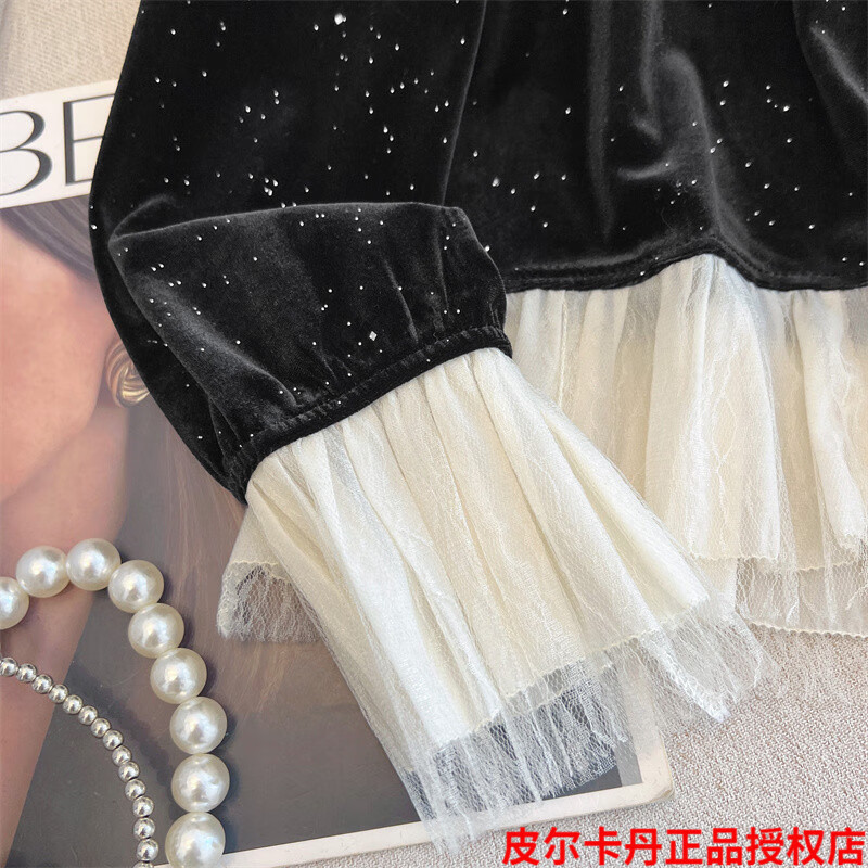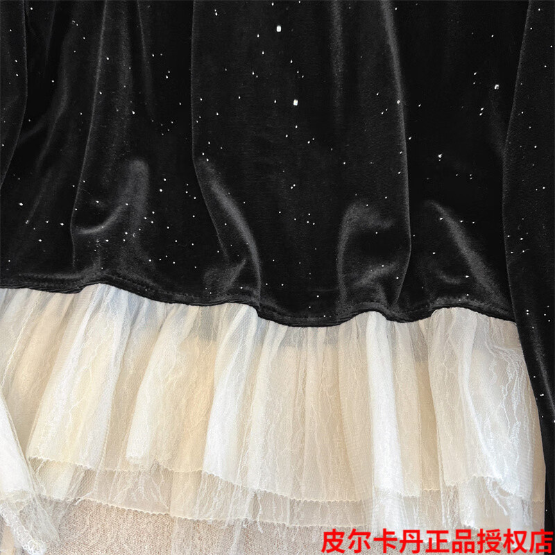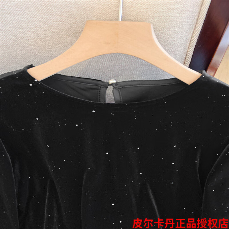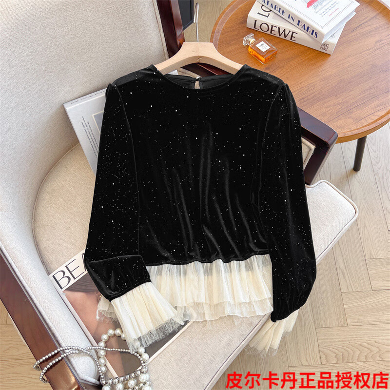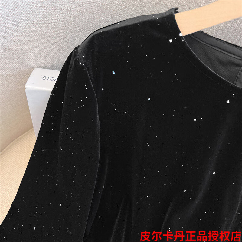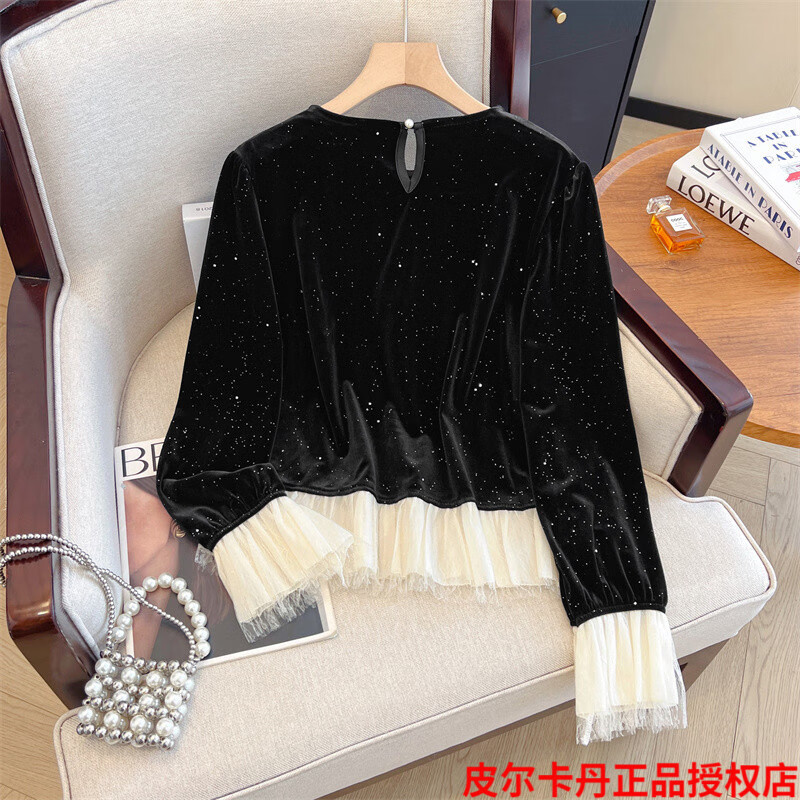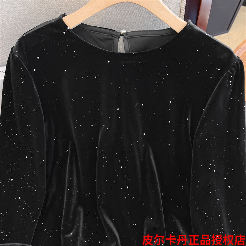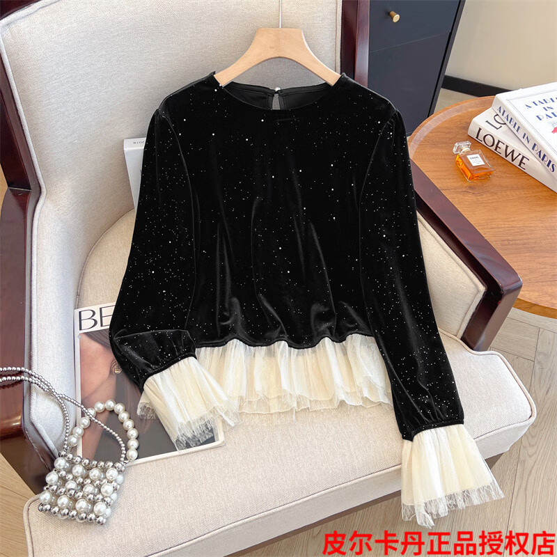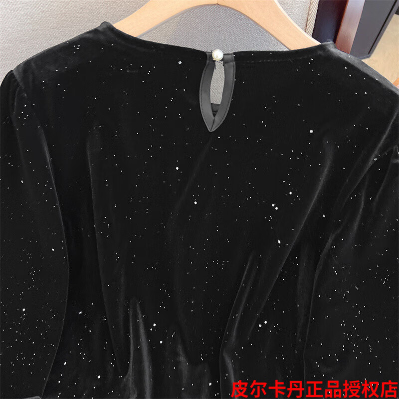 Pierre Cardin high-end brand black silk velvet top women's long-sleeved bottoming with autumn and winter new loose ruffle Pierre Cardin black L (recommended 100-115Jin Jin equals 0.5kg)