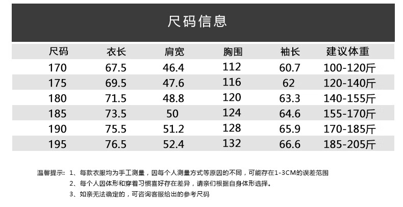 China (cm) 165 / 88-90 170 / 96-98 175 / 108-110 180 / 118-122 185 / 126-130