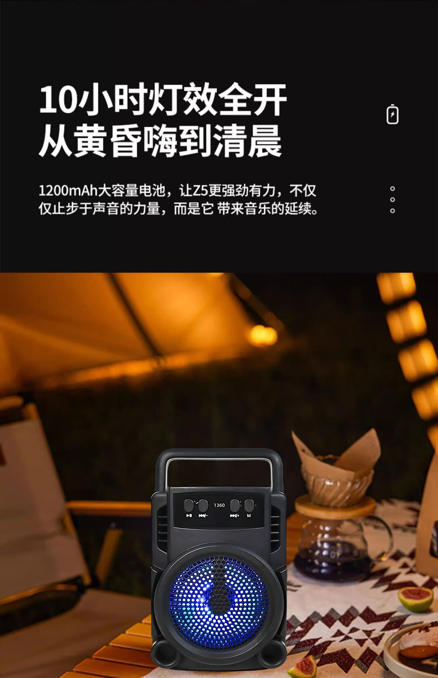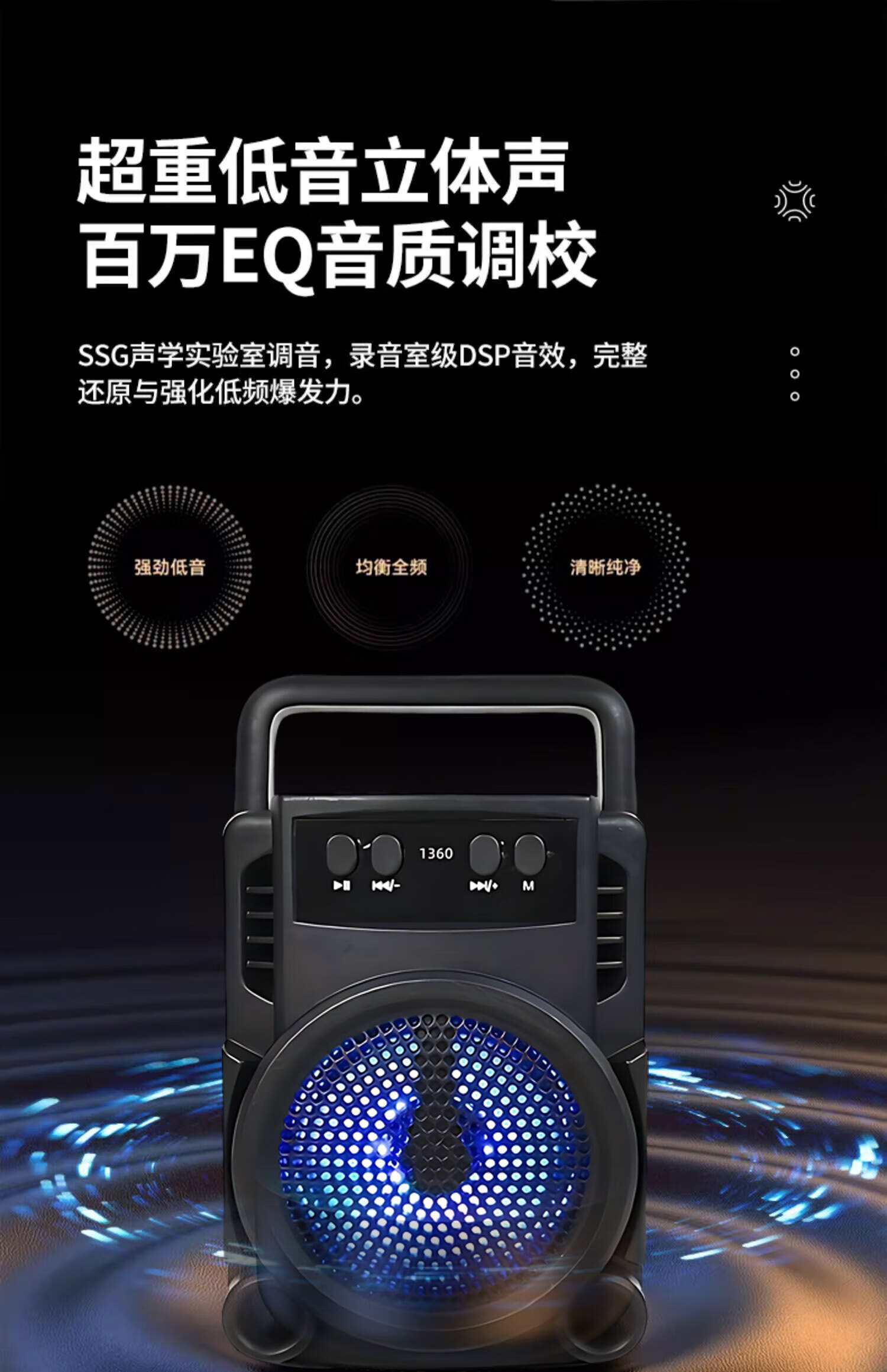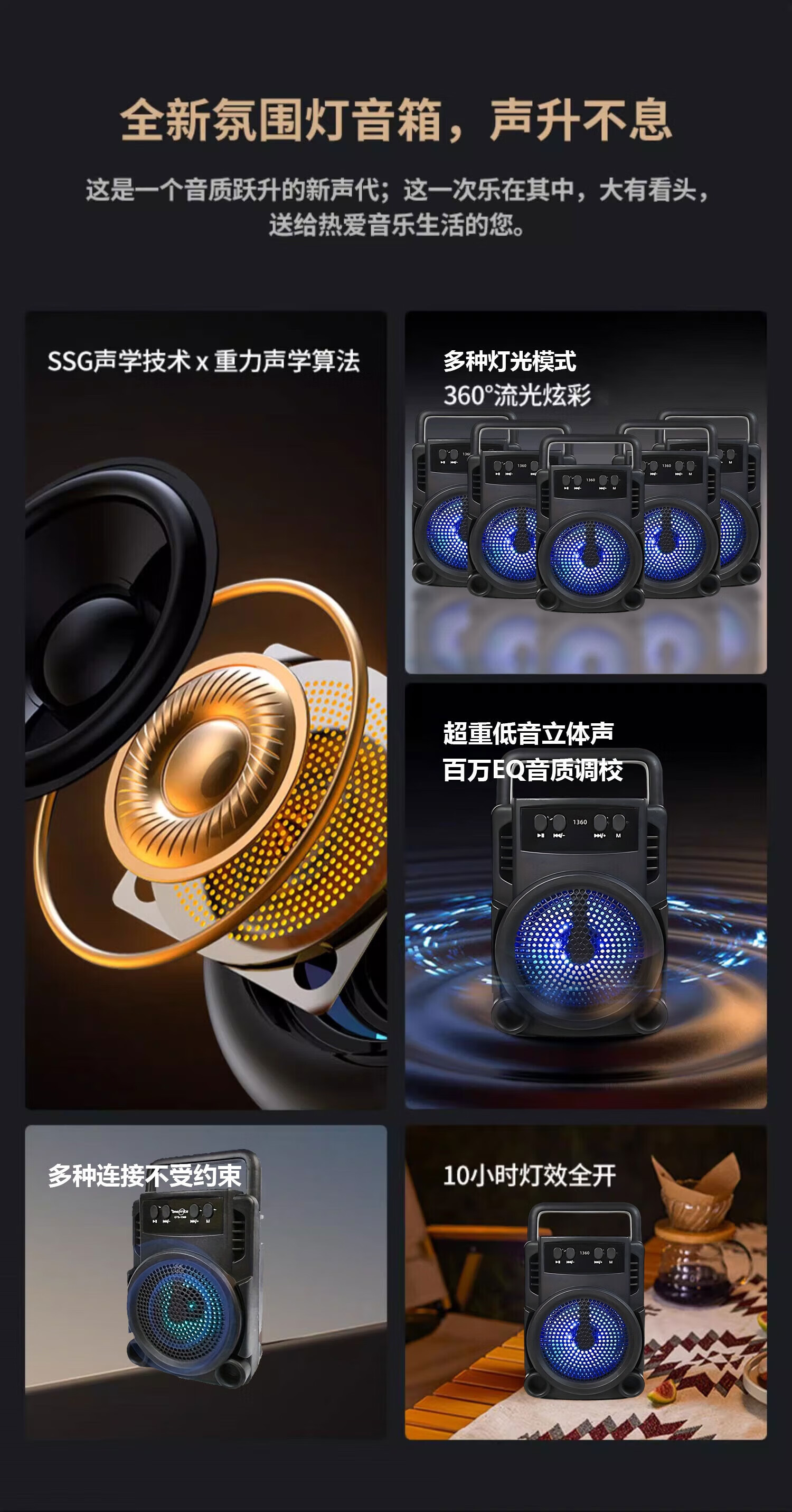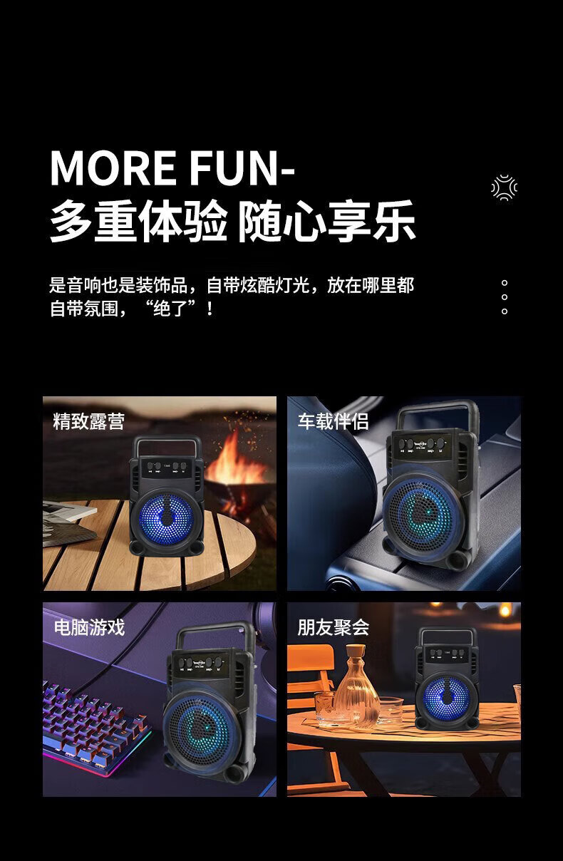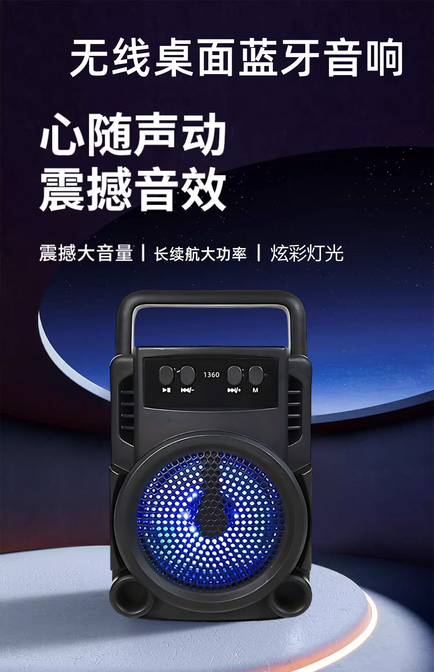 Car mini high-quality wireless Bluetooth audio smart voice speaker portable multi-function subwoofer 1360 large volume + high-definition sound quality + ambient light - top with black