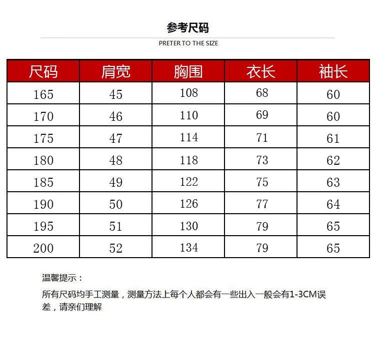 China (cm) 165 / 88-90 170 / 96-98 175 / 108-110 180 / 118-122 185 / 126-130
