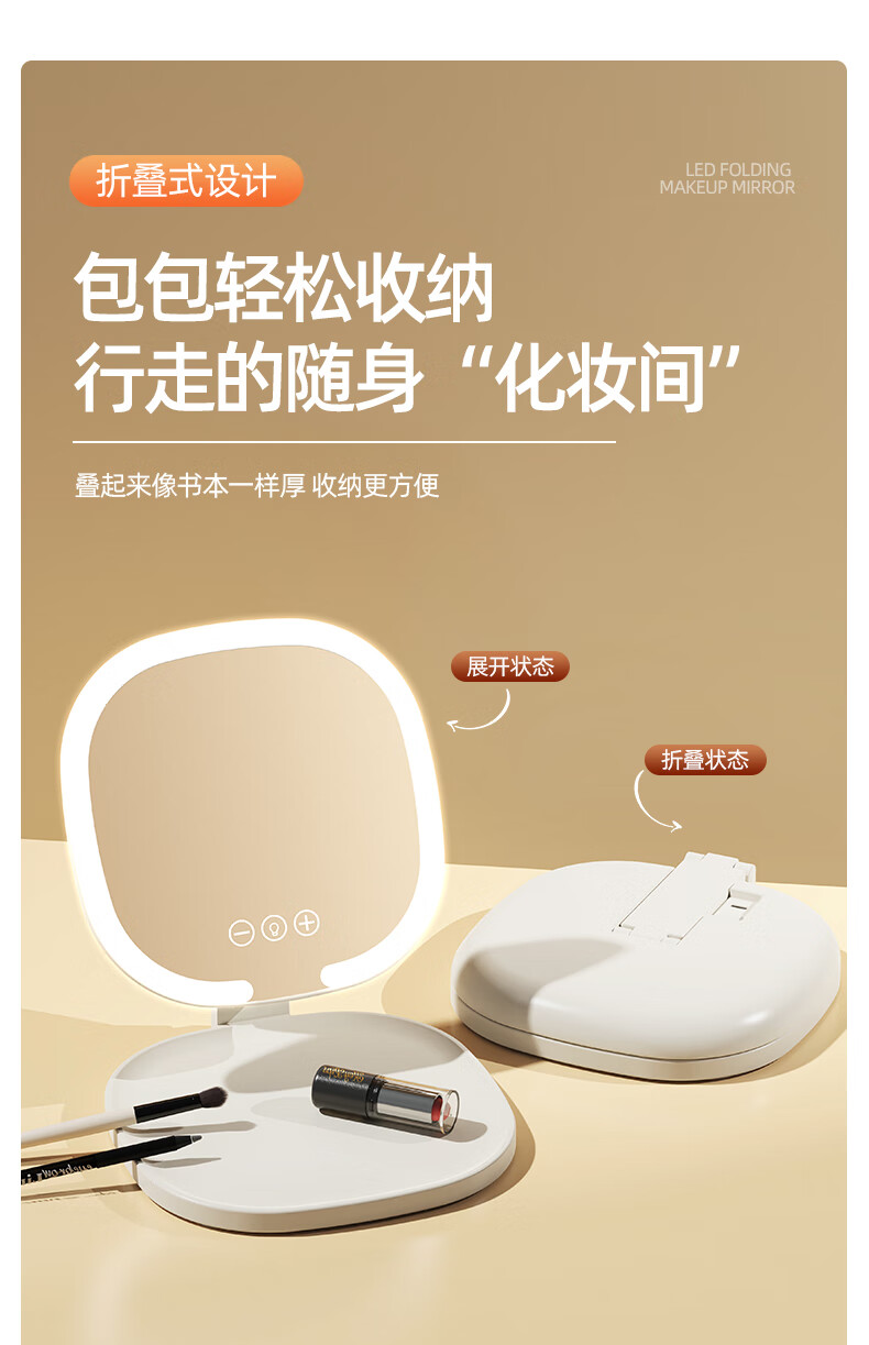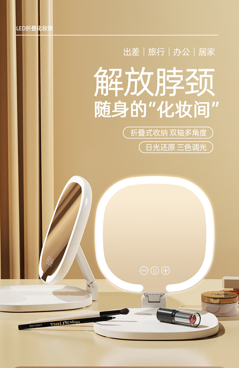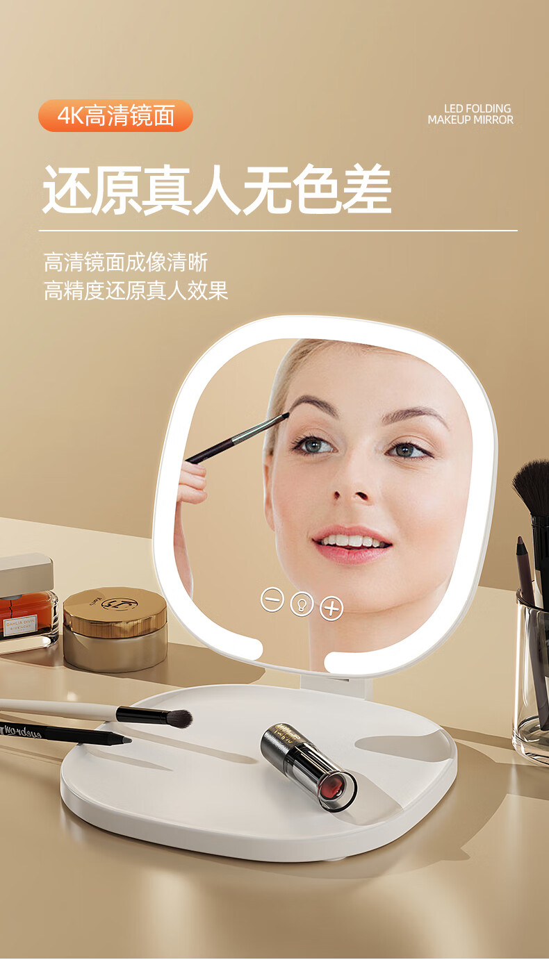 Led desktop smart makeup mirror with light girls bedroom dressing table mirror student dormitory desktop ins style 1 pack cream yellow without makeup light foldable and rotating