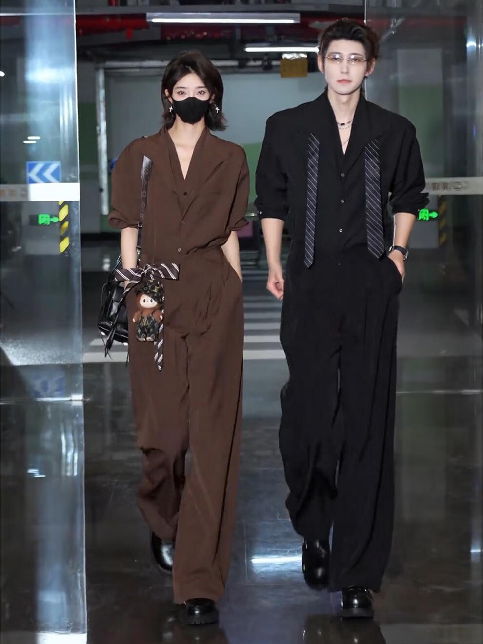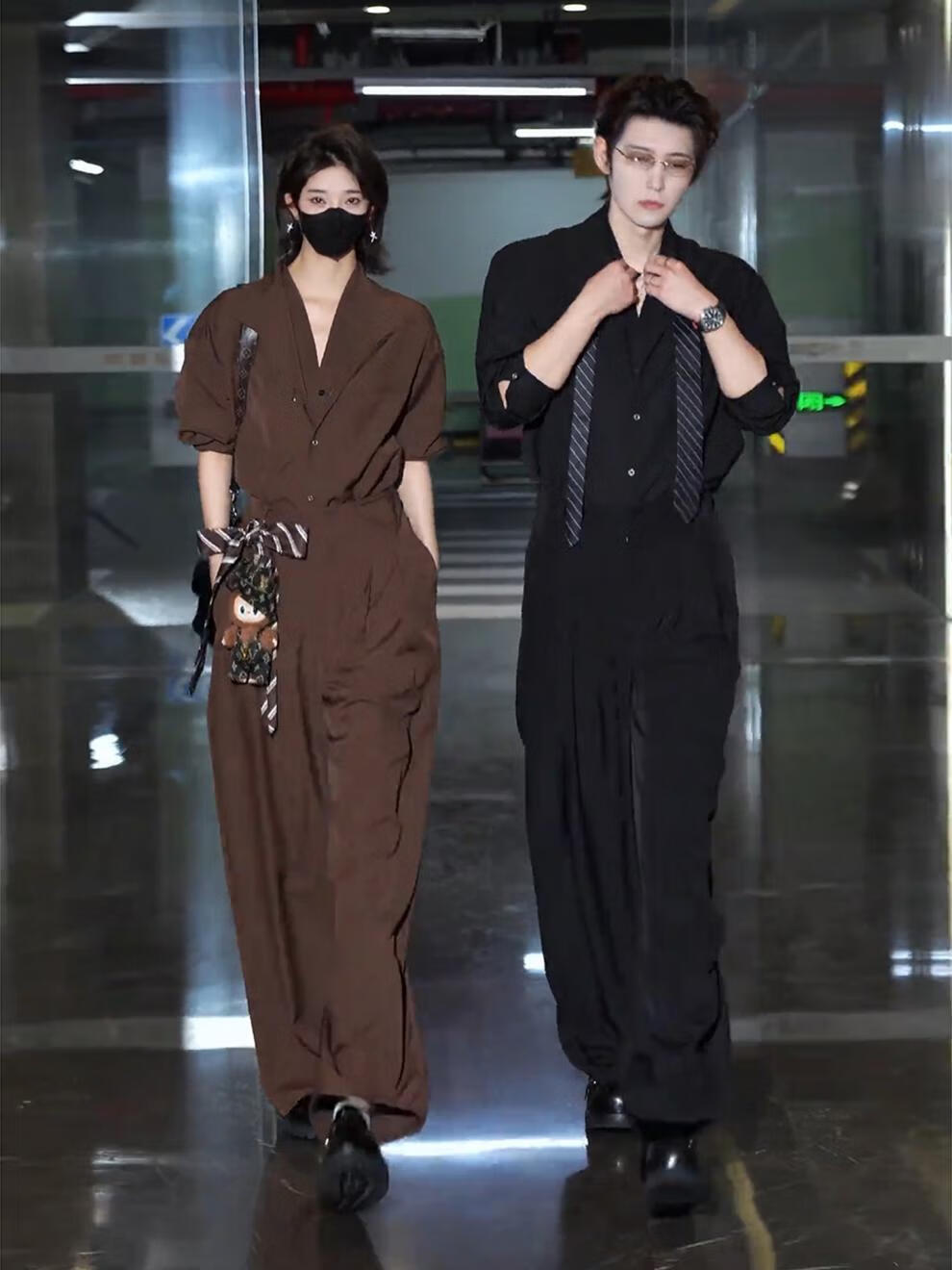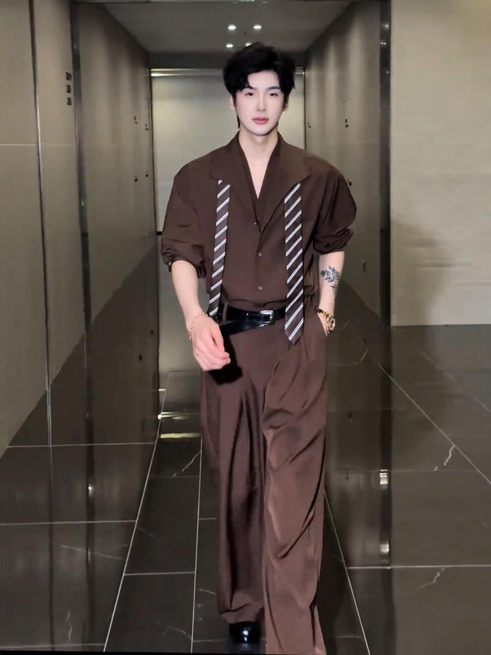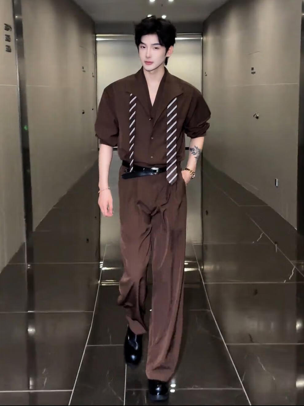 ROMON Maillard old money style male model high-end suit Korean design fake two-piece suit collar shirt drape trousers black suit 2XL