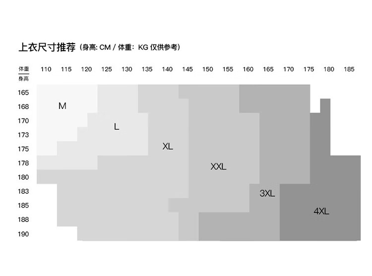 China (cm) 160-165/84-86 165-170 / 88-90 167-172 / 92-96 168-173 / 98-102 170-176 / 106-110
