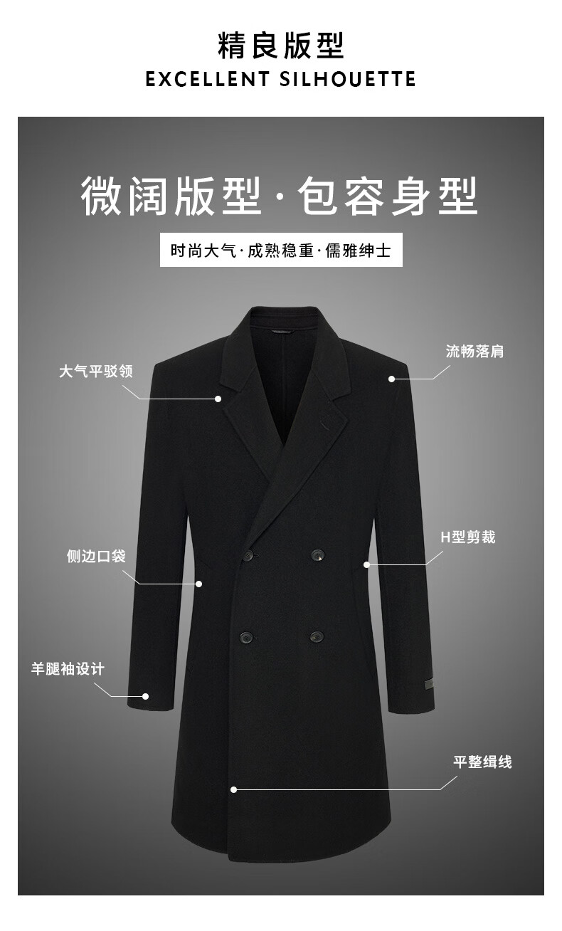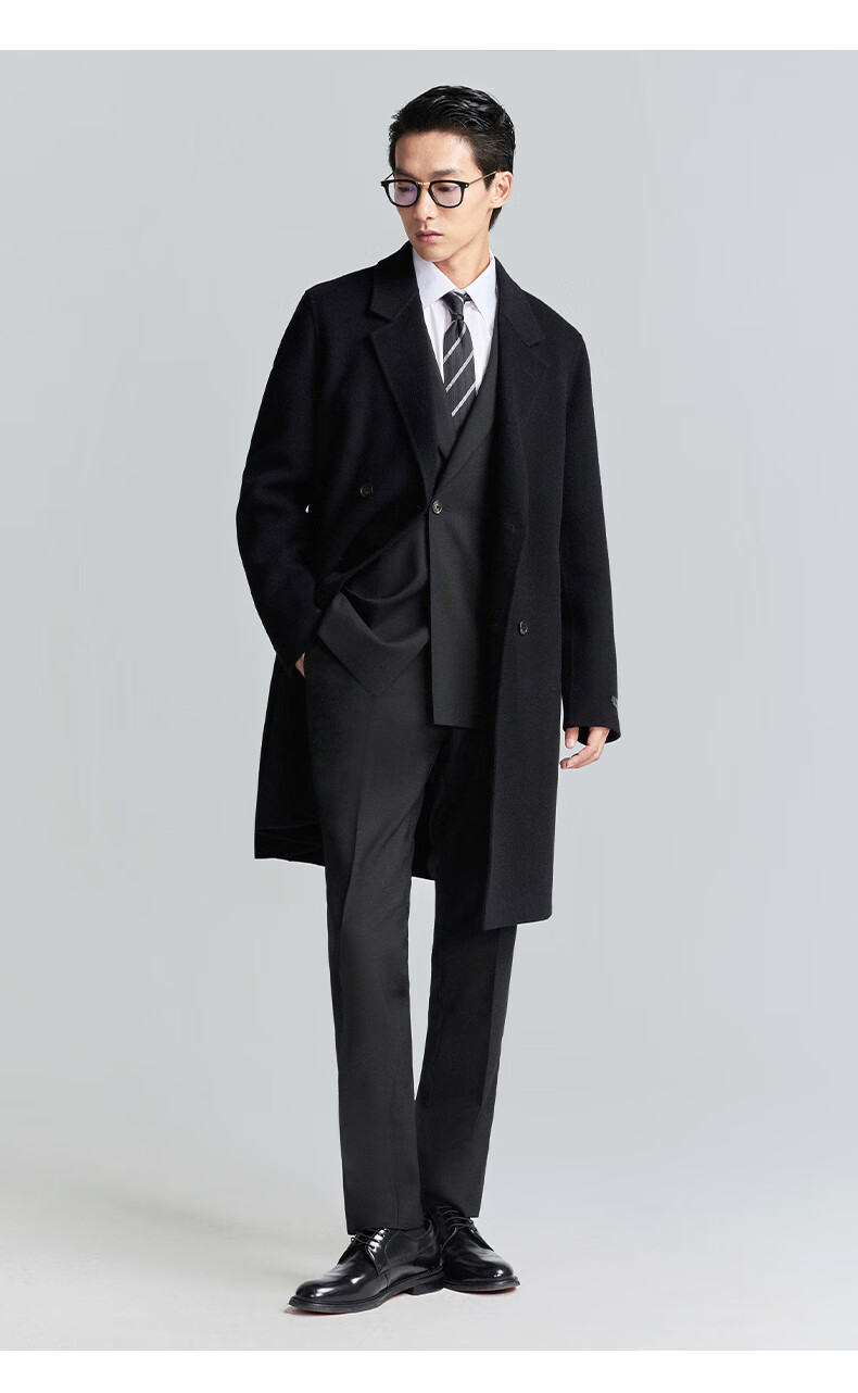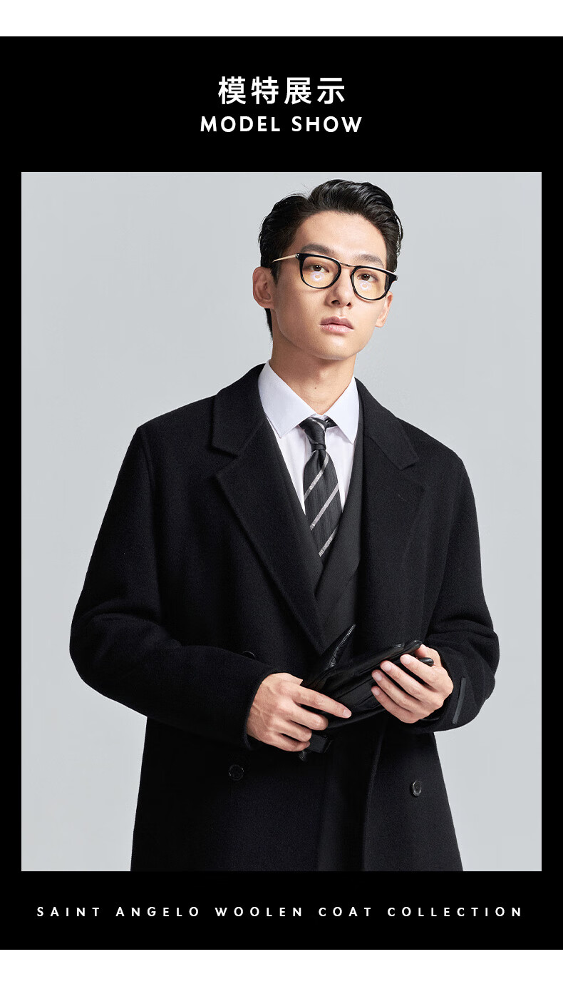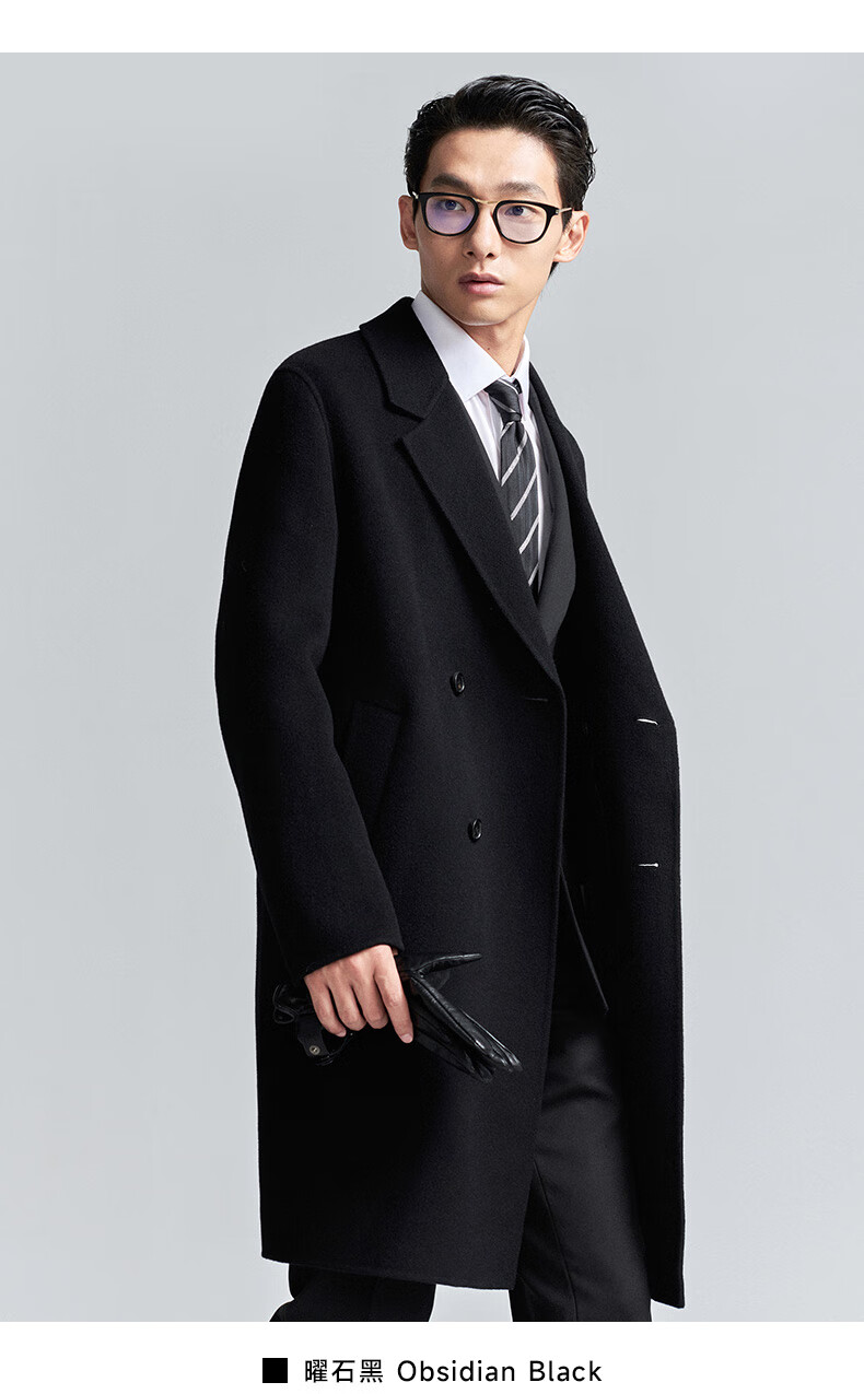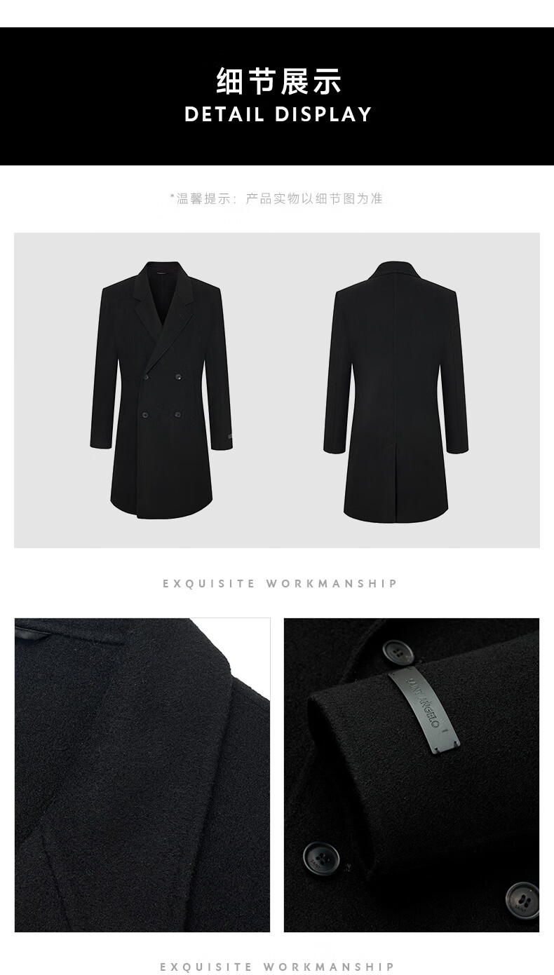Angel Bird Coat Men's 100% Wool Autumn and Winter Casual Long Double-sided Wool Coat Slightly Wide Loose Fashion Jacket Obsidian Black 2XL -52(185/104)