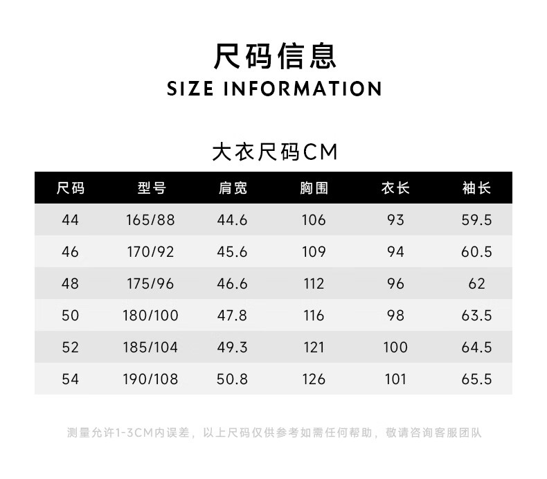 China (cm) 165 / 88-90 170 / 96-98 175 / 108-110 180 / 118-122 185 / 126-130