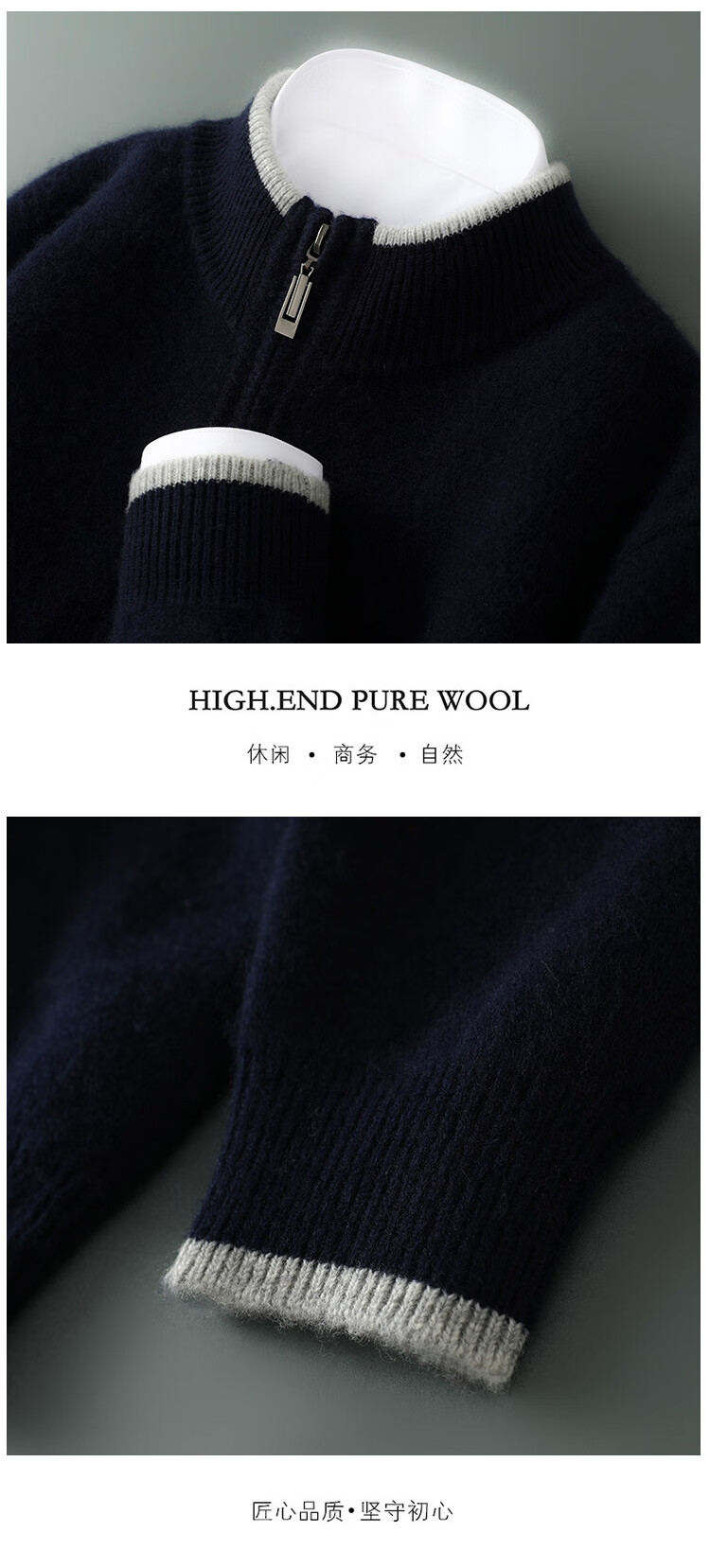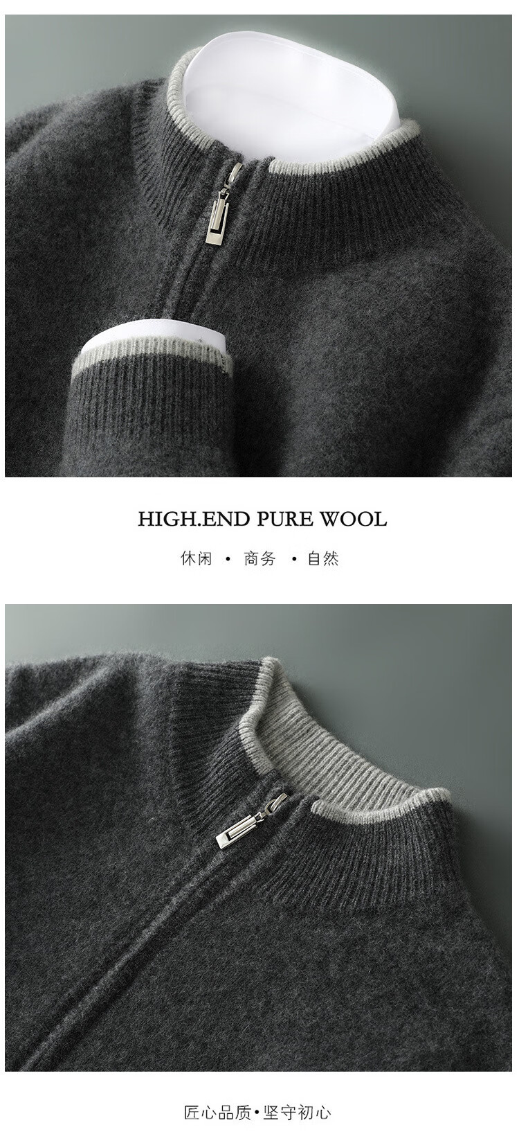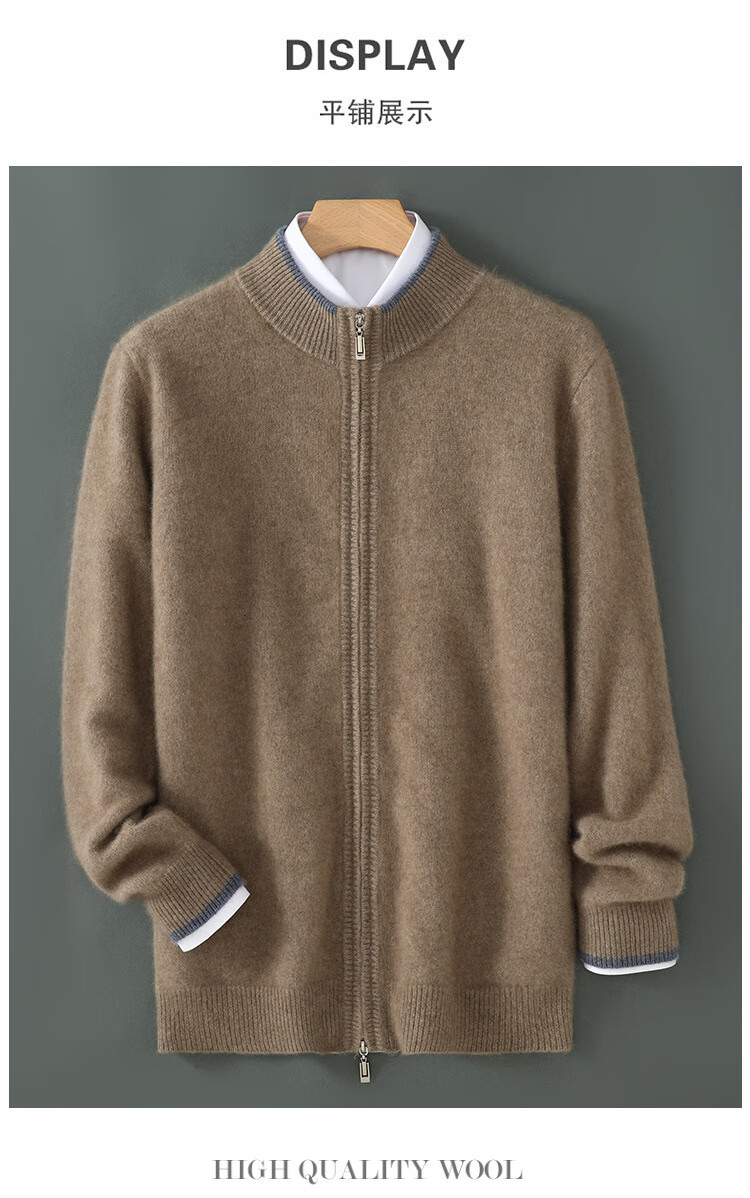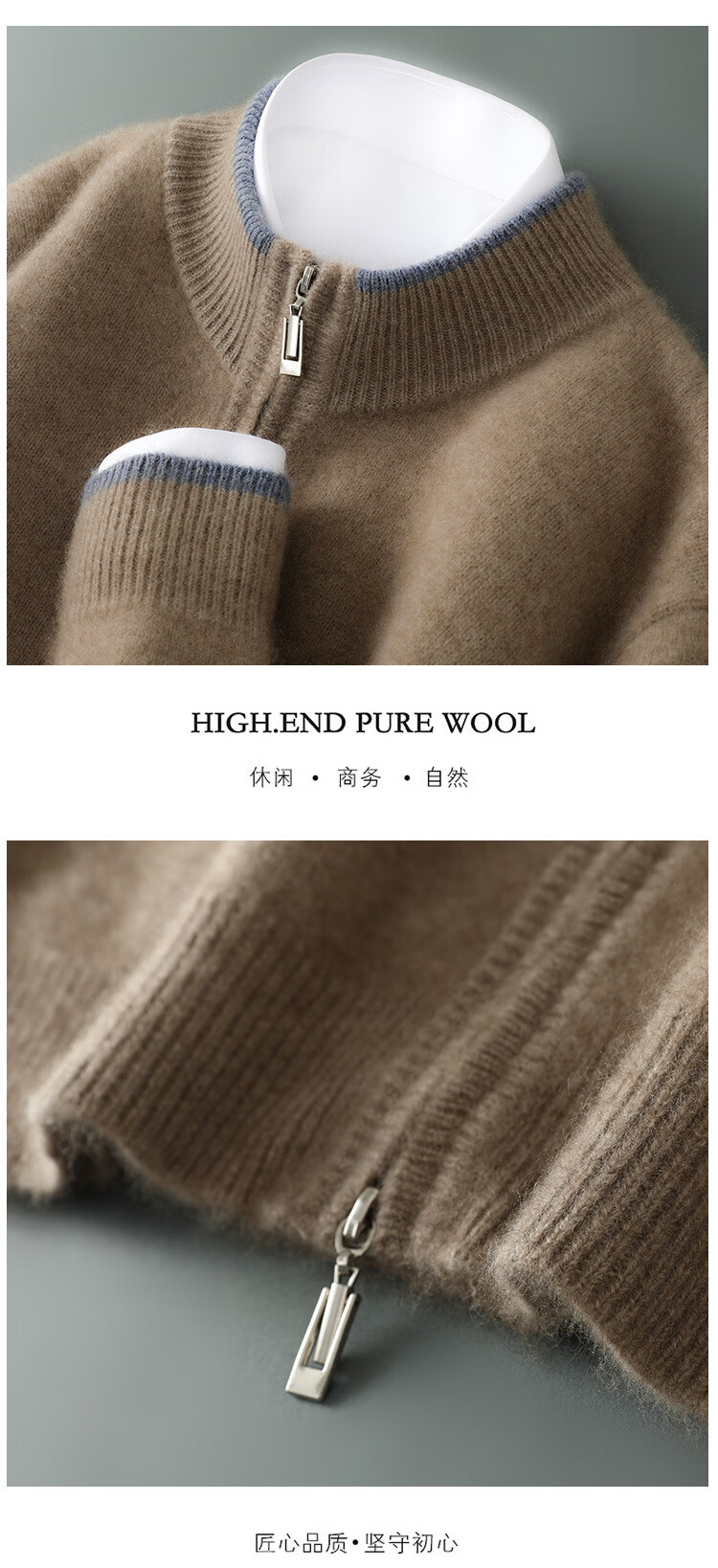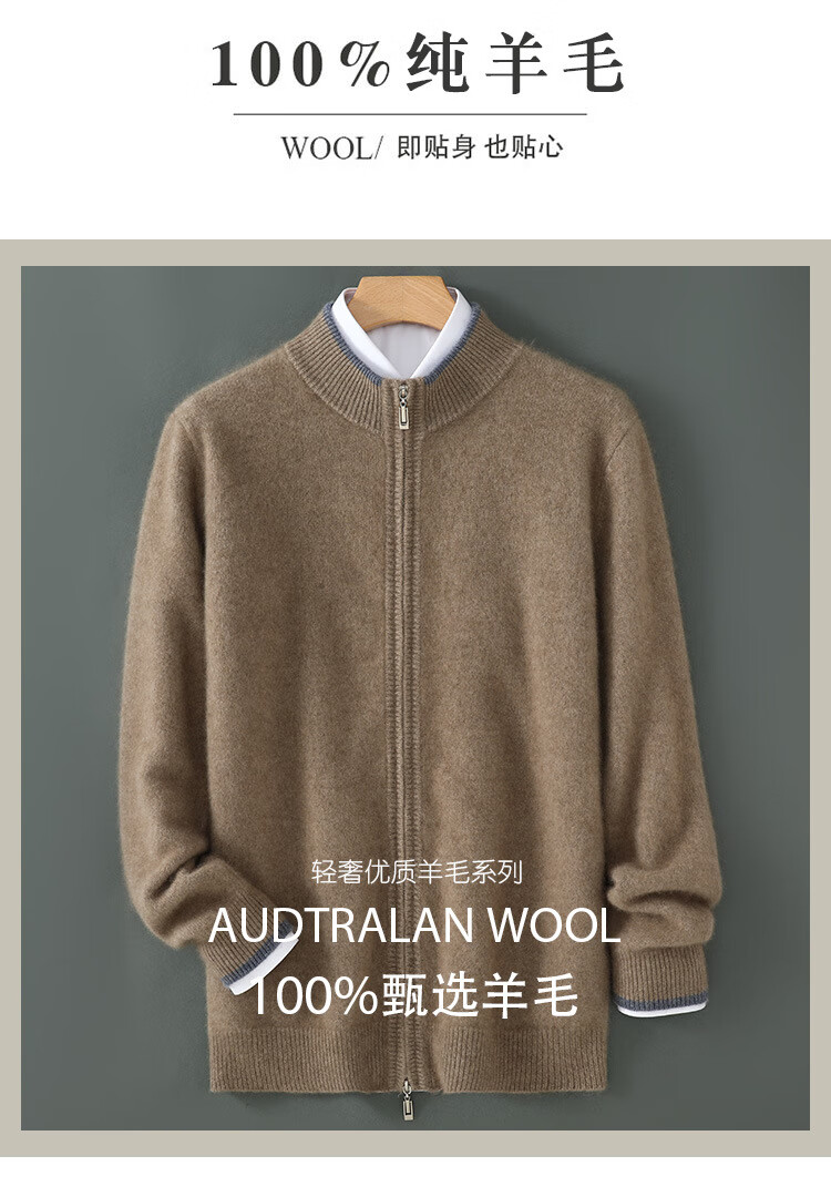 ROMON 100% sheep wool sweater men's cardigan coat autumn and winter business casual thickened warm contrast double zipper sweater medium camel XL