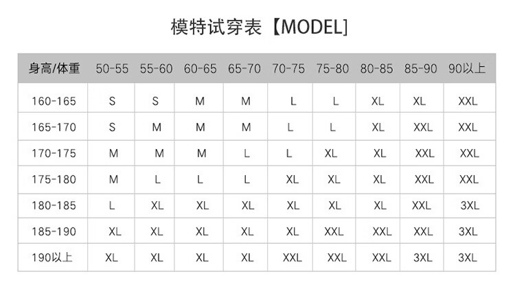 China (cm) 165 / 88-90 170 / 96-98 175 / 108-110 180 / 118-122 185 / 126-130