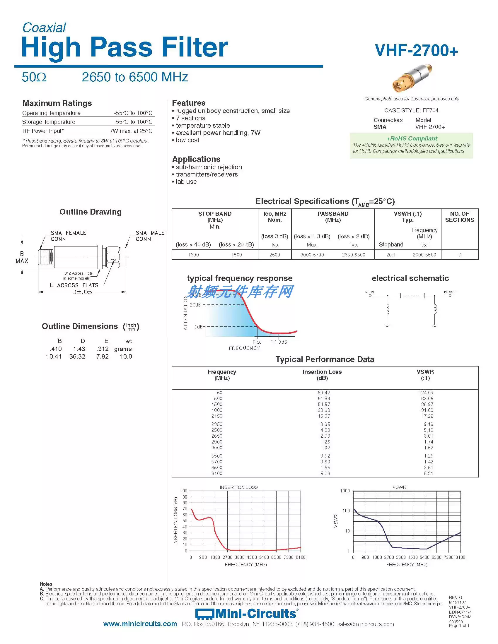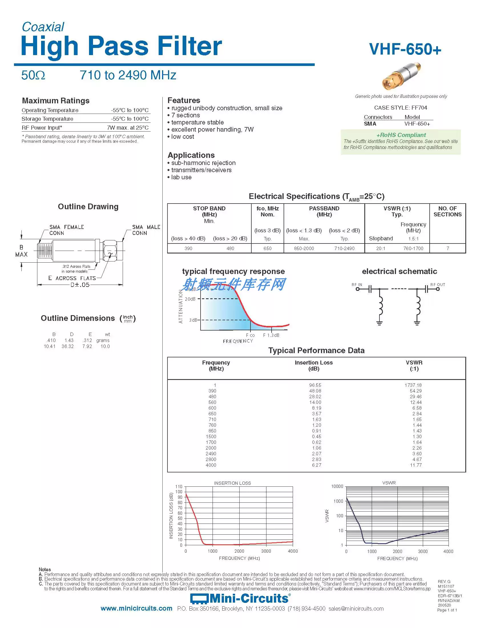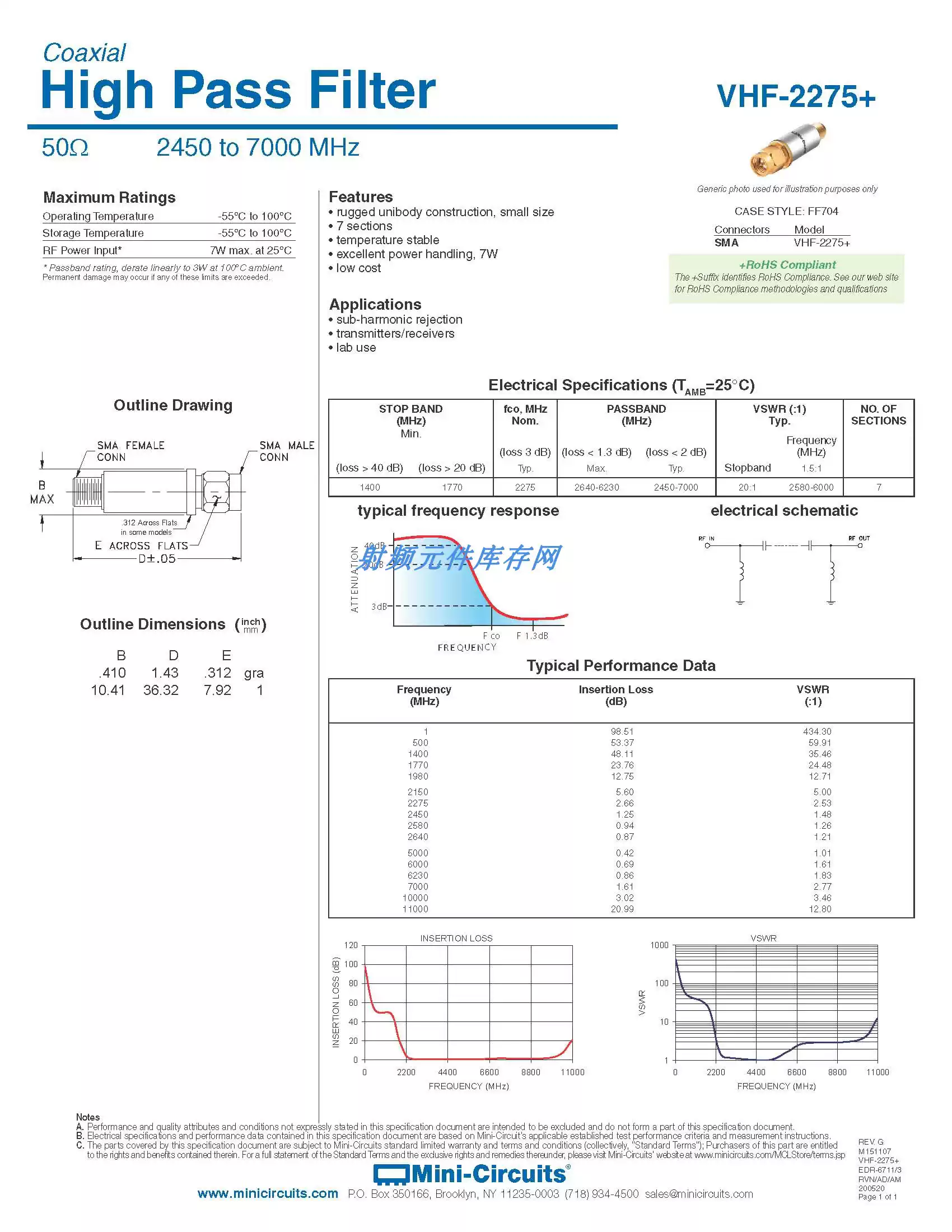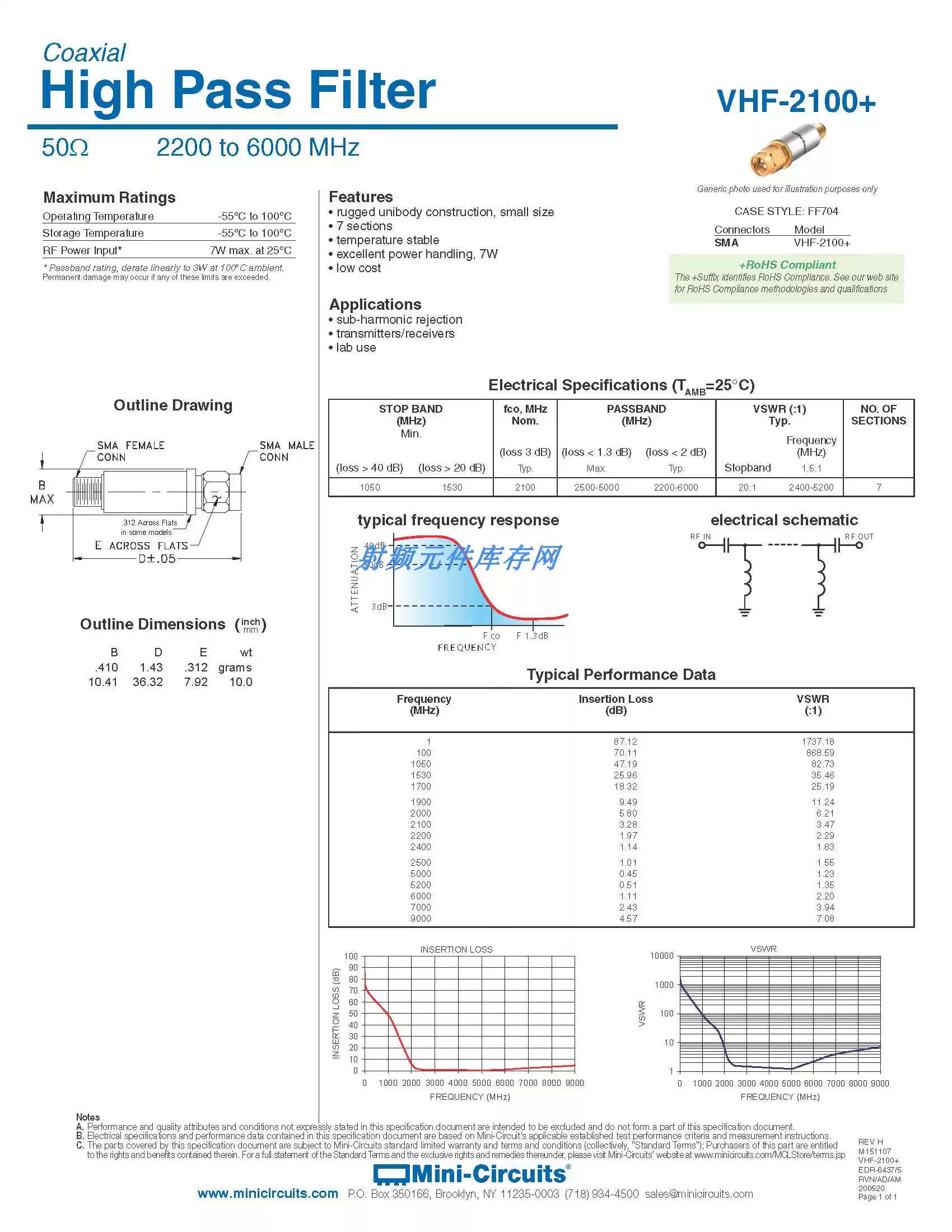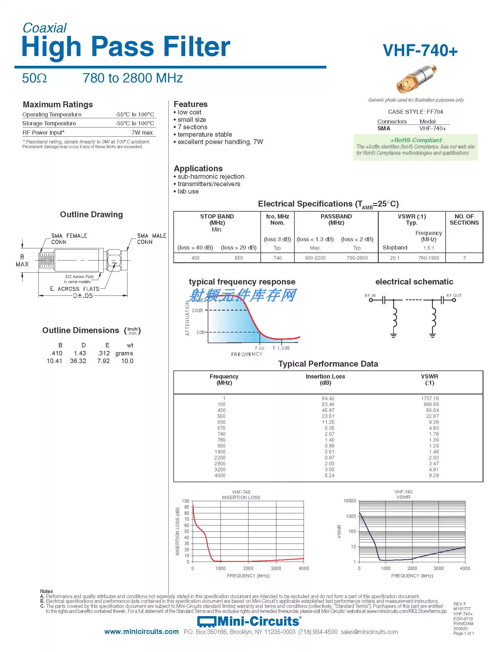 SMA高通滤波器VHF-145+440/650/740/880/1080/1200/1300/1320MHz VHF-2700+3000-5700MHz