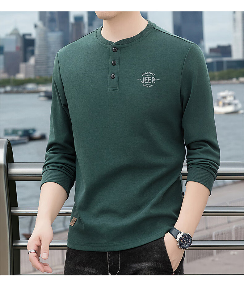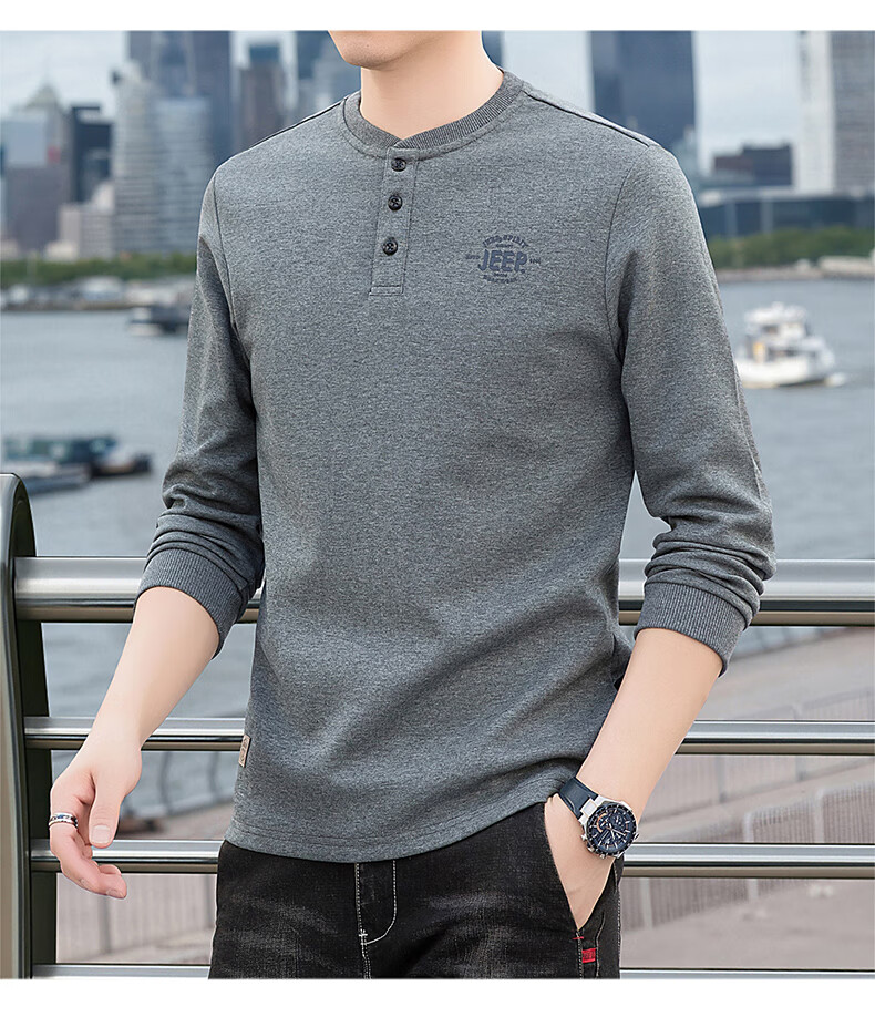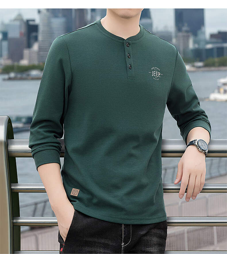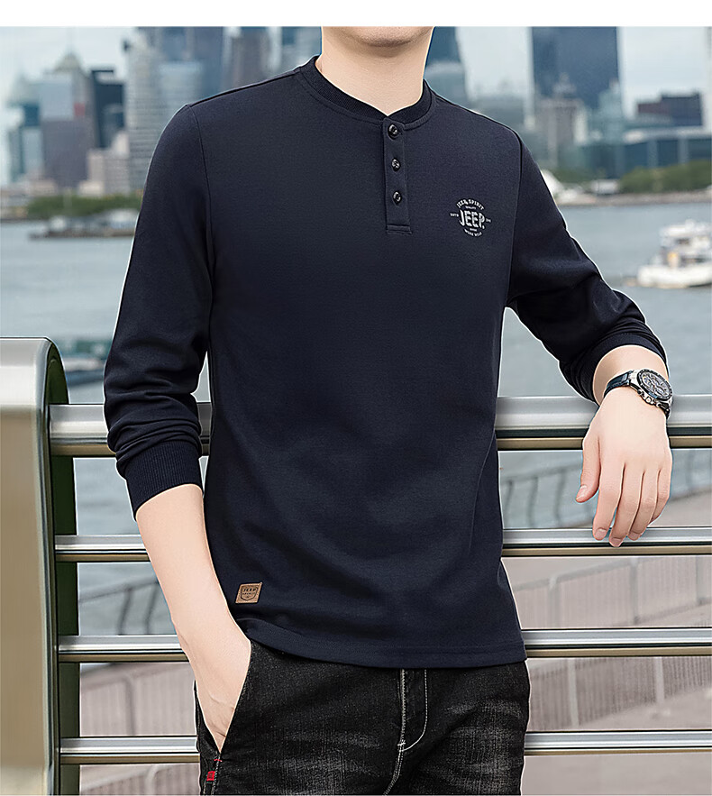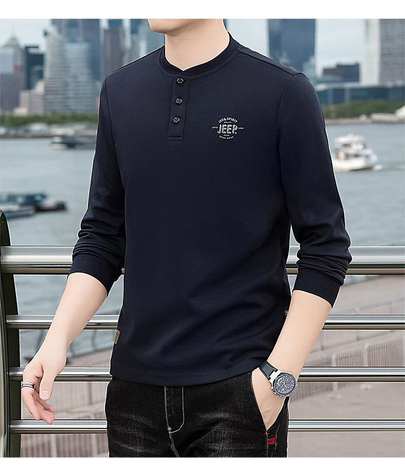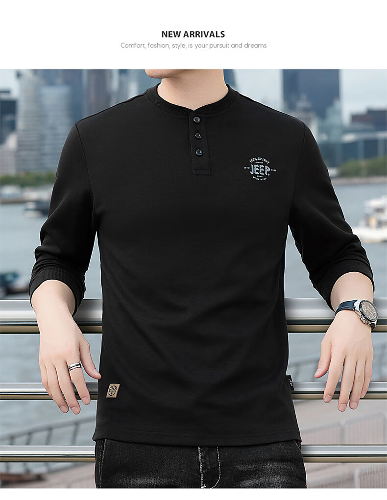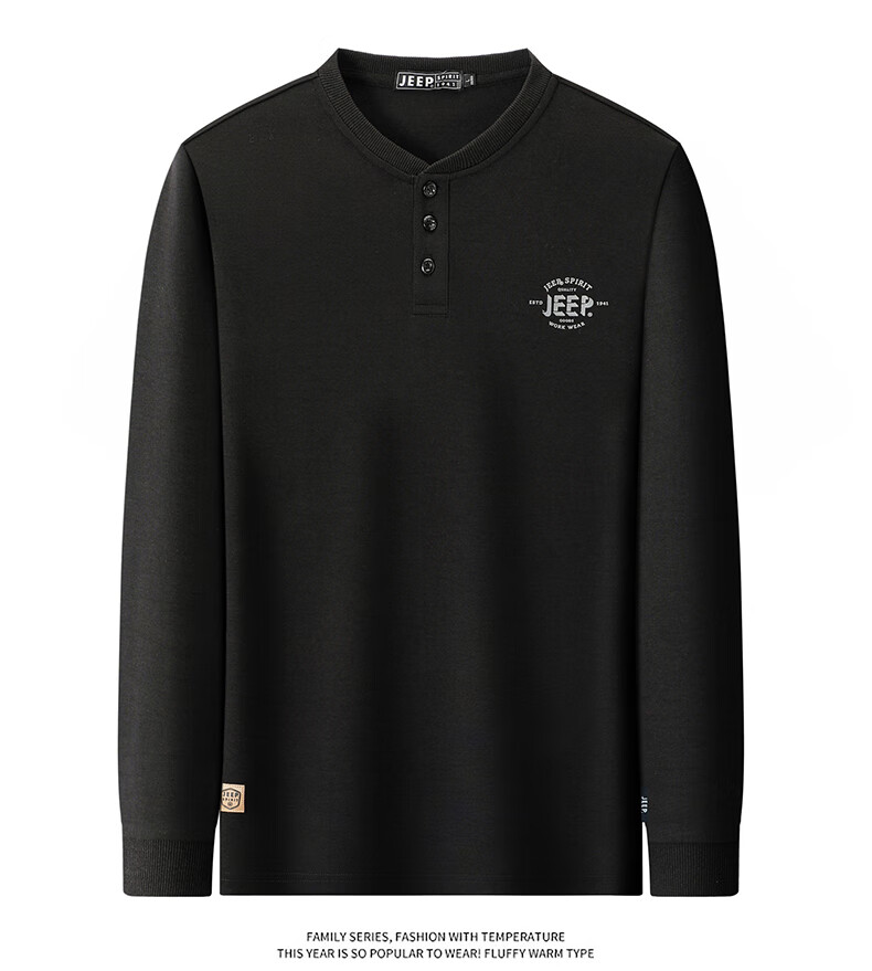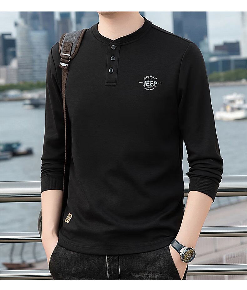 JEEP SPIRIT cotton long-sleeved T-shirt men's spring and autumn versatile casual loose large size T-shirt Henry collar sports sweatshirt trendy black XL (recommended 145-165Jin Jin equals 0.5 kg)