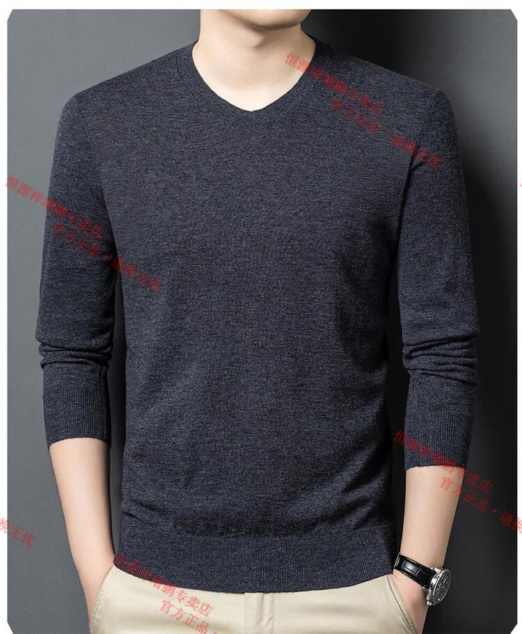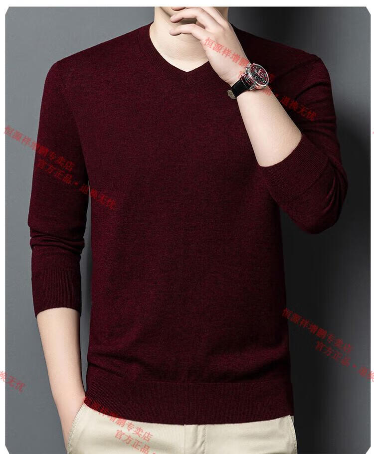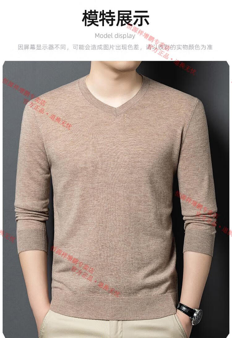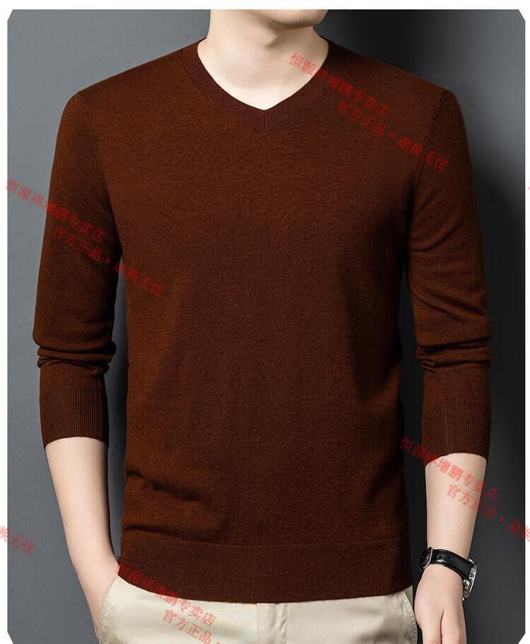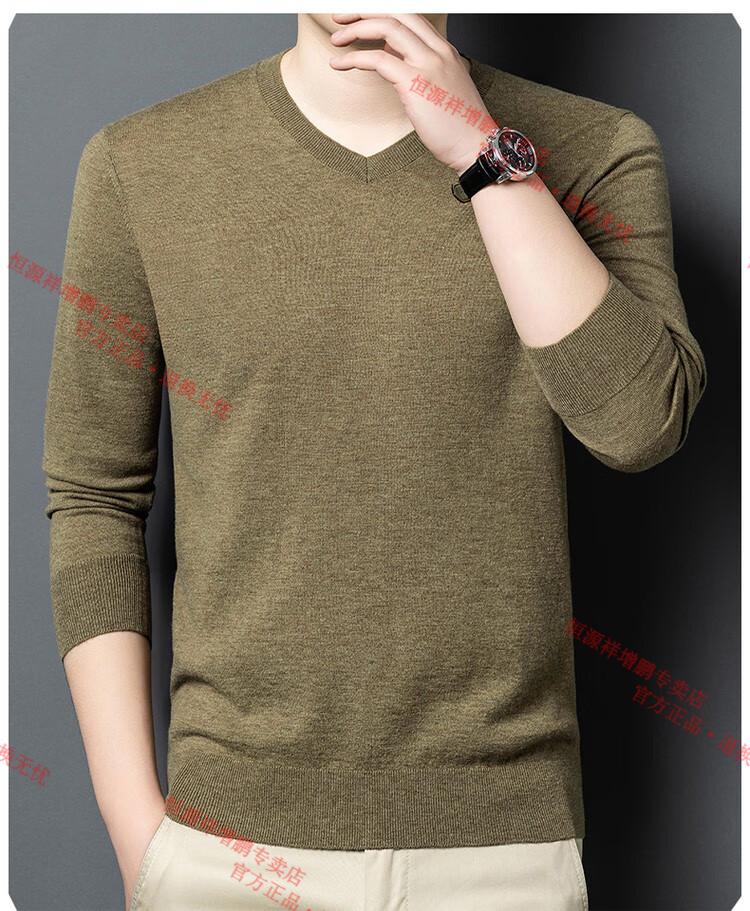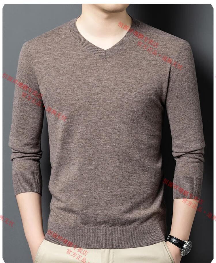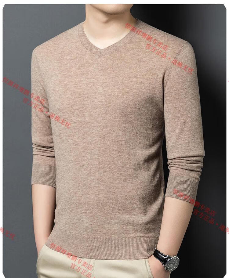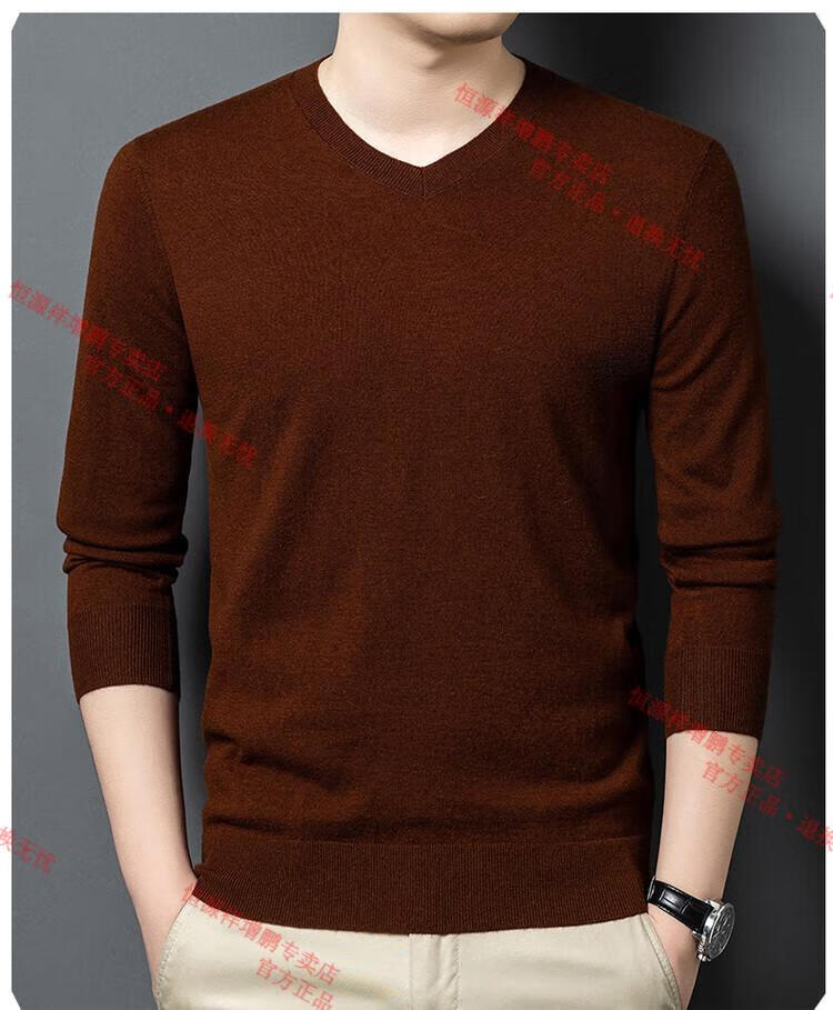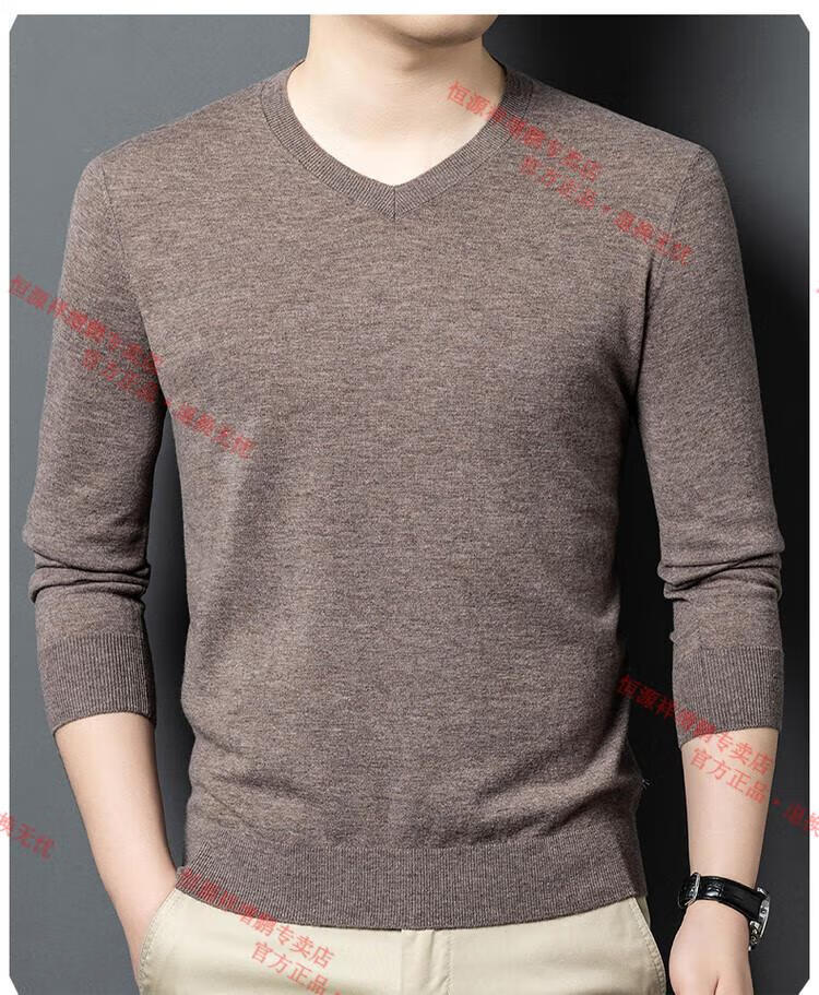 Hengyuanxiang high-end thin worsted wool sweater for men 100% pure wool autumn and winter V-neck solid color sweater knitted base fleece sweater camel M 165