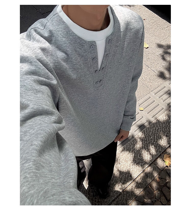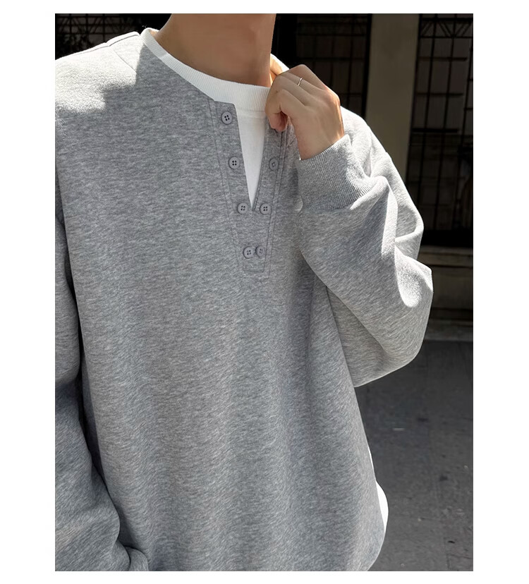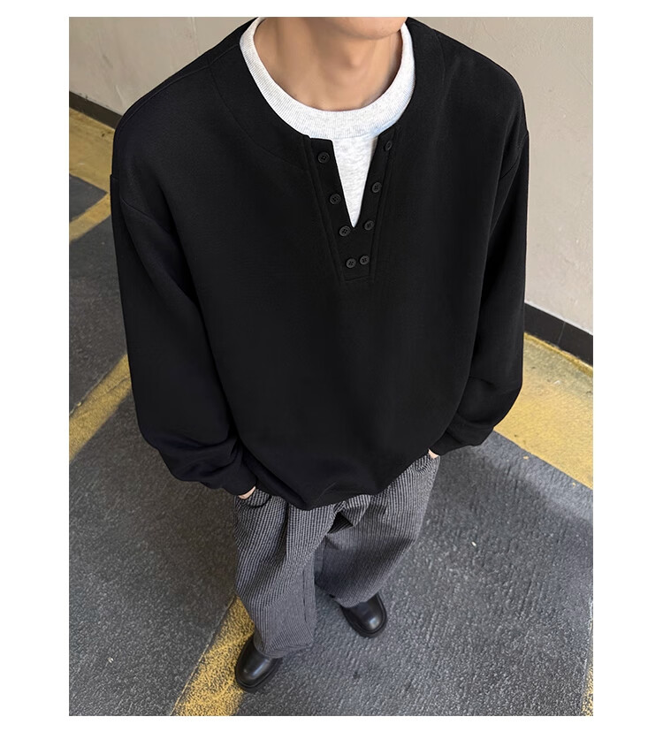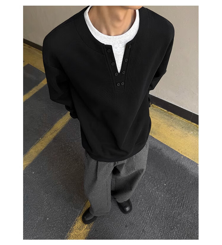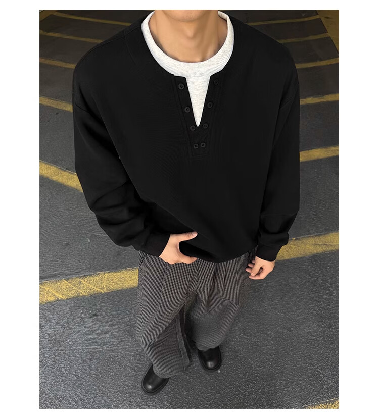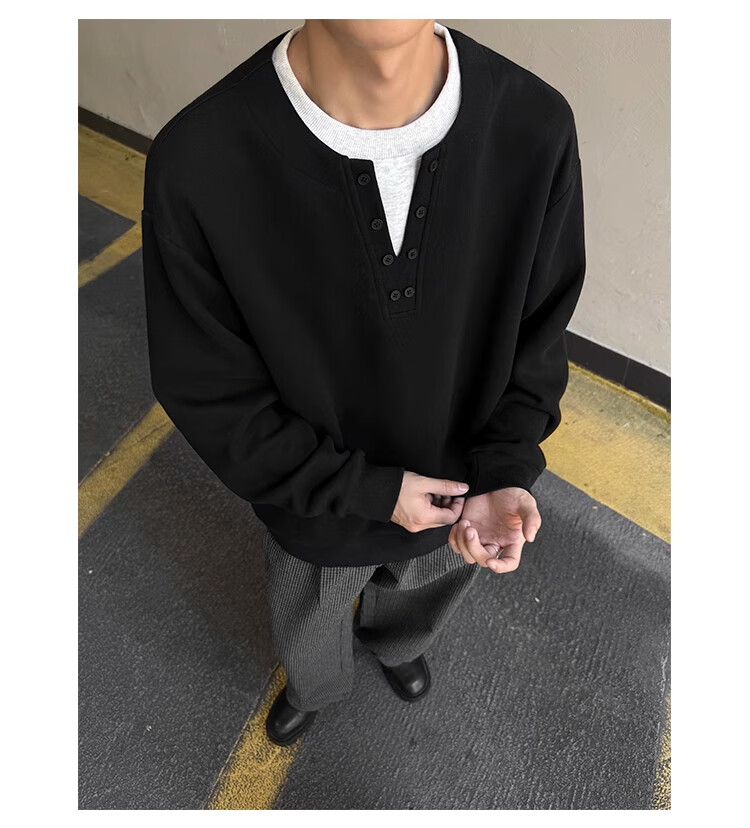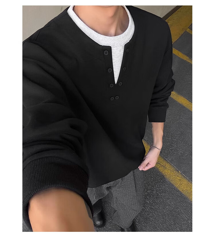 Cotton heavy fake two-piece Henry collar sweatshirt for men spring and autumn 2025 new loose simple casual bottoming shirt top X88 black regular high quality 33 2XL 140-160Jin Jin is equal to 0.5 kg